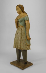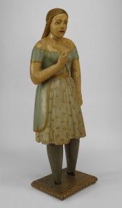 American Country style life size wood figure of young girl with light blue and floral decorated dress. (19th Cent.).