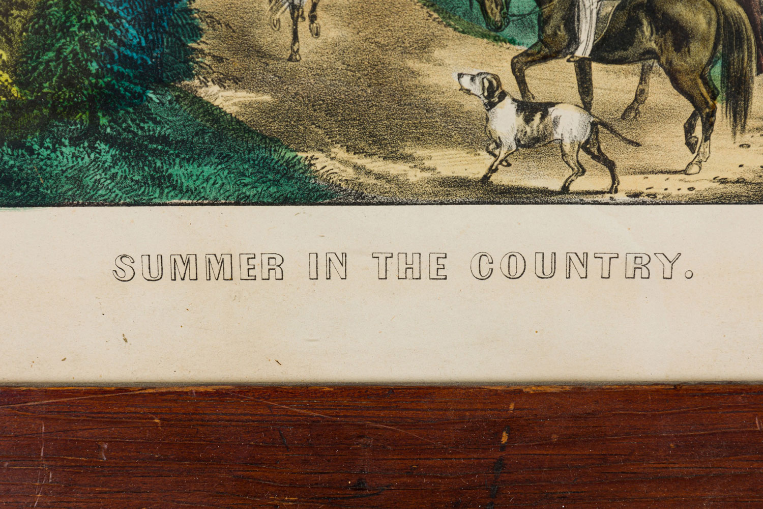 American Victorian wood framed lithograph of riders on path titled Summer in the Country (Currier & Ives).