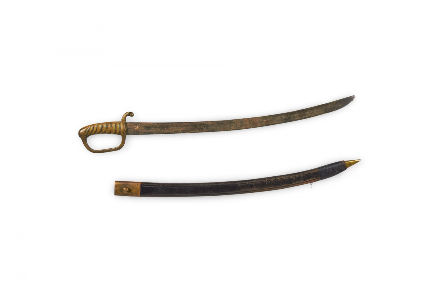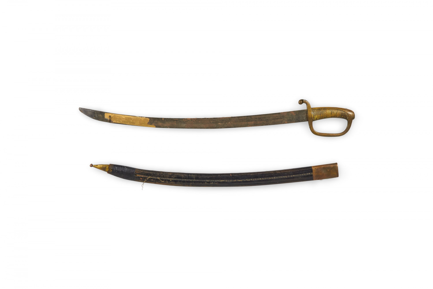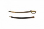 English Renaissance (19th Century) curved sword with brass fluted handle and black leather scabbard.