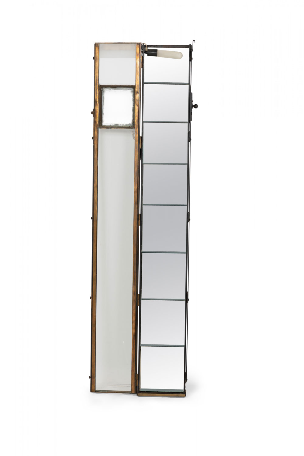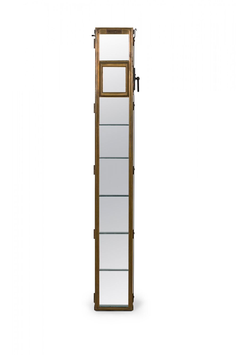 American Victorian mail chute repurposed as a lighted vitrine with its original glass intact, in a single column rectangular form with 7 glass shelves added. "The Cutler Mailing System The Cutler Mfg. Co., Rochester, N.Y. U.S.A." imprinted on the front. (CUTLER MANUFACTURING COMPANY)
