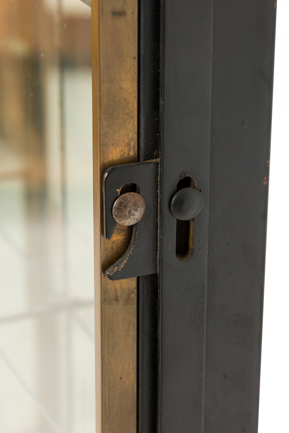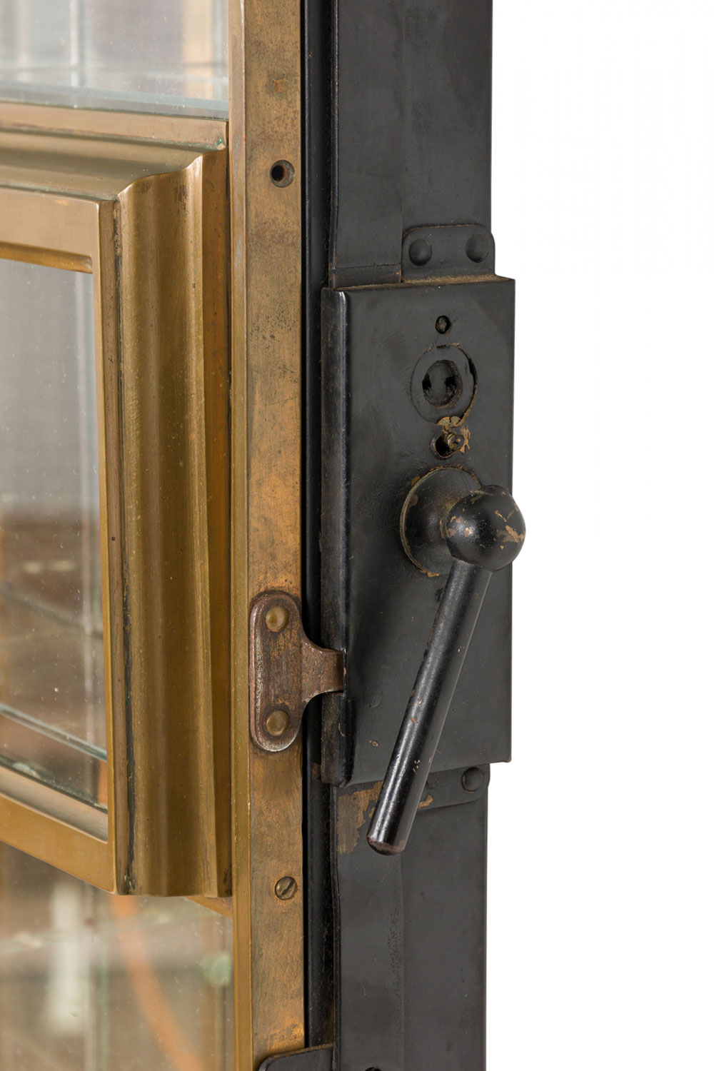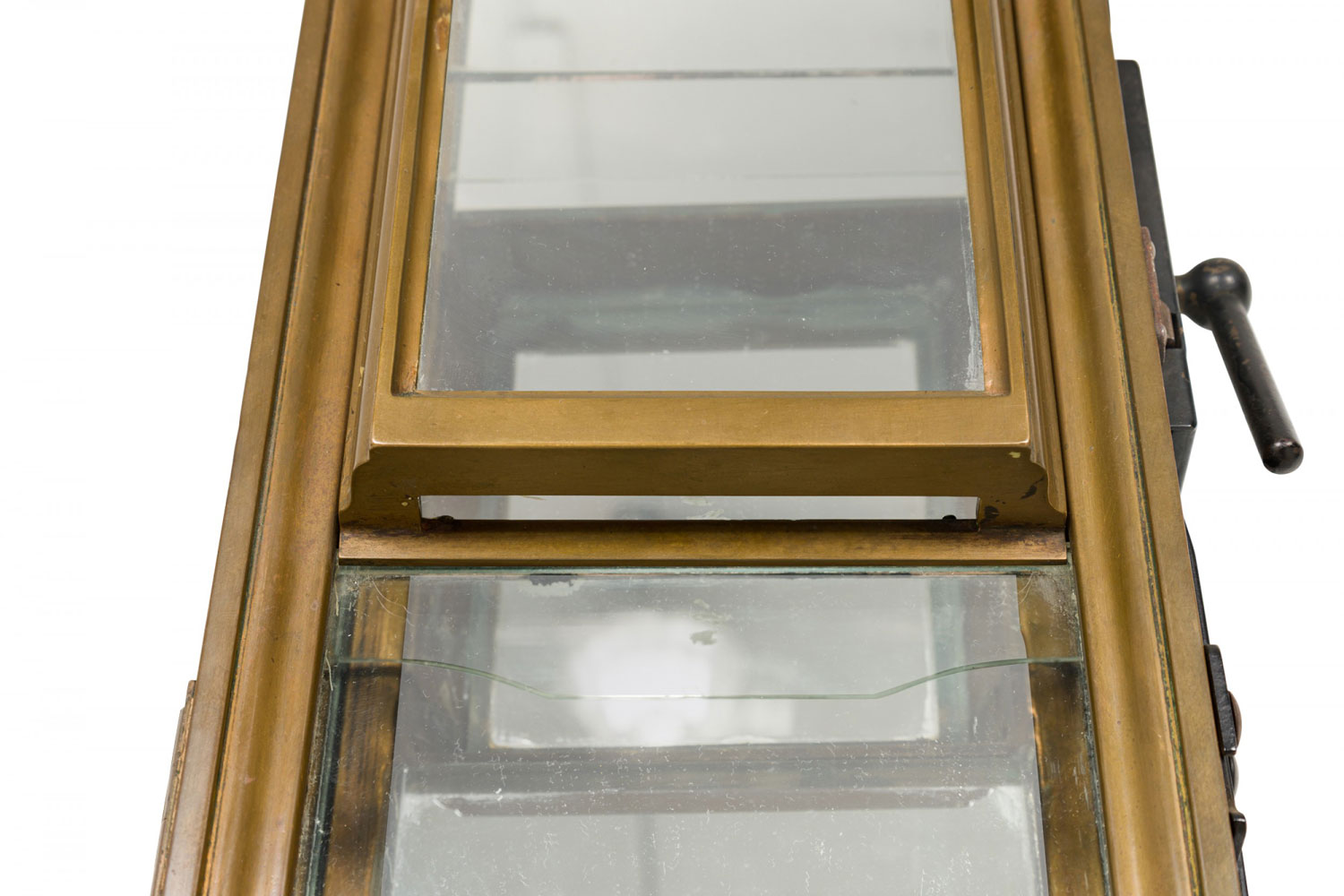 Style: American Materials & Techniques: Brass, glass, metal Category: Cabinets & Case Goods Condition: Wear to finish, Bronze shows patina as expected, needs rewiring. Good; Wear consistent with age and use