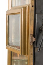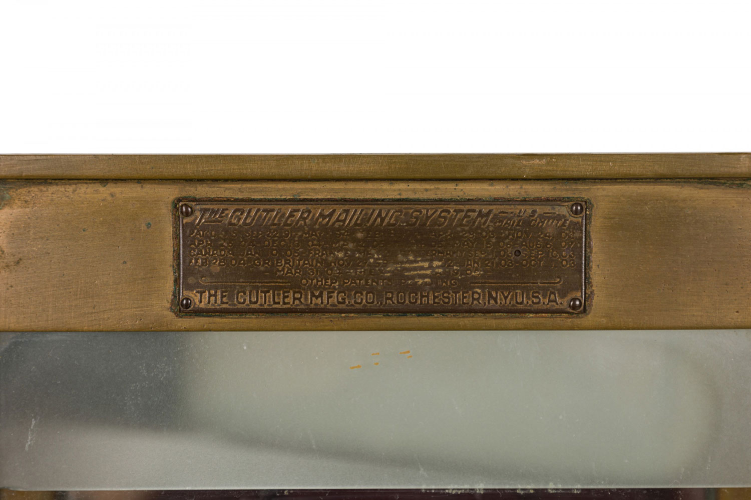 American Victorian mail chute repurposed as a lighted vitrine with its original glass intact, in a single column rectangular form with 7 glass shelves added. "The Cutler Mailing System The Cutler Mfg. Co., Rochester, N.Y. U.S.A." imprinted on the front. (CUTLER MANUFACTURING COMPANY).
