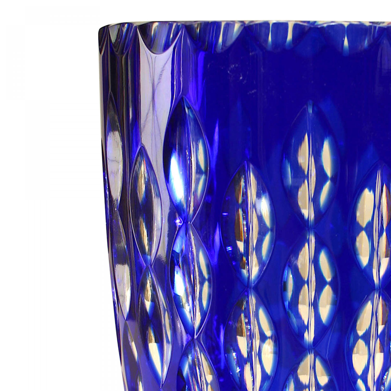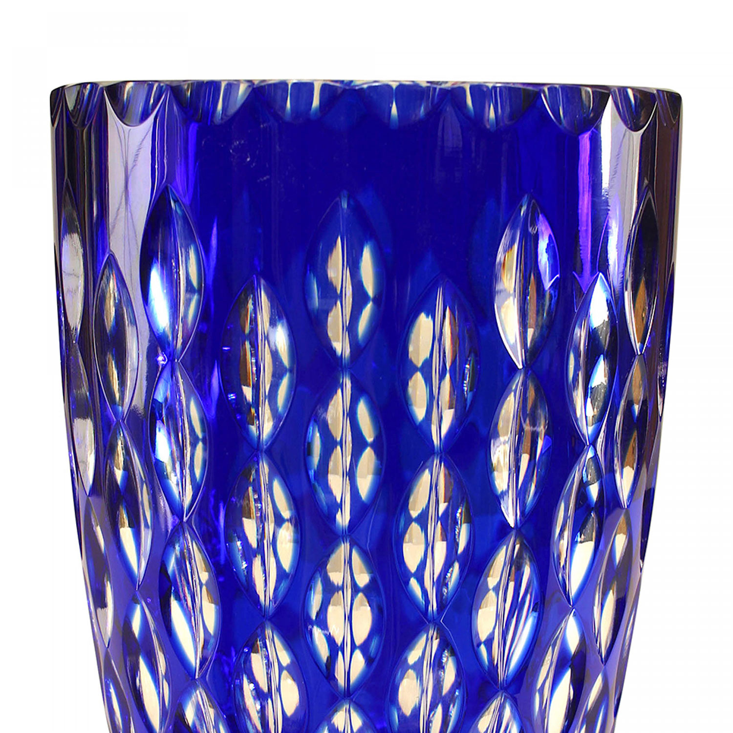 Art Deco Continental (Czechoslovakia) taper cylindrical clear and blue glass vase with geometric oval pattern.