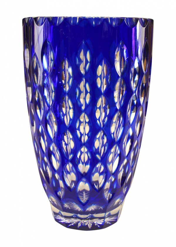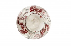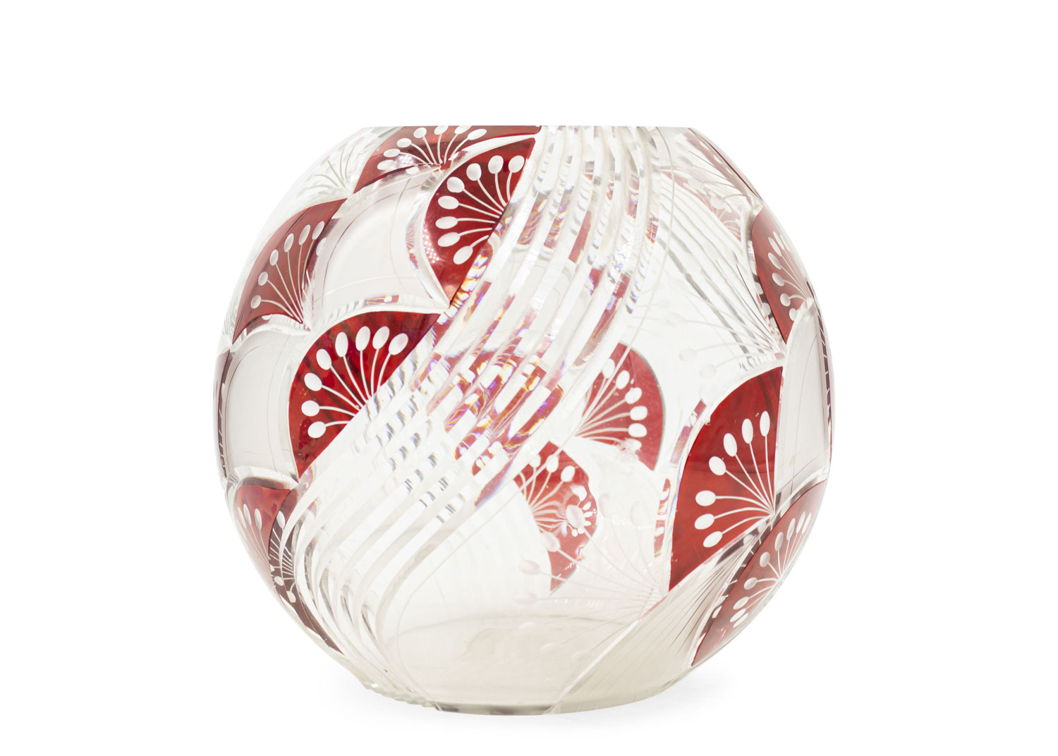 Art Deco Continental (Czechoslovakia) round vase with geometric cut glass design and ruby overlay trim.