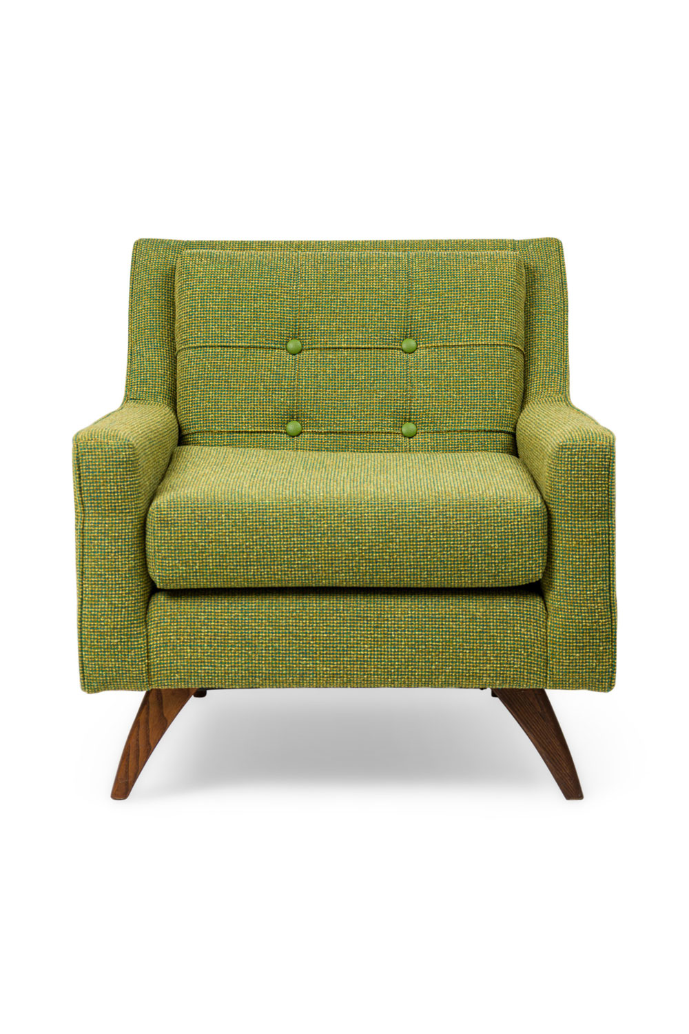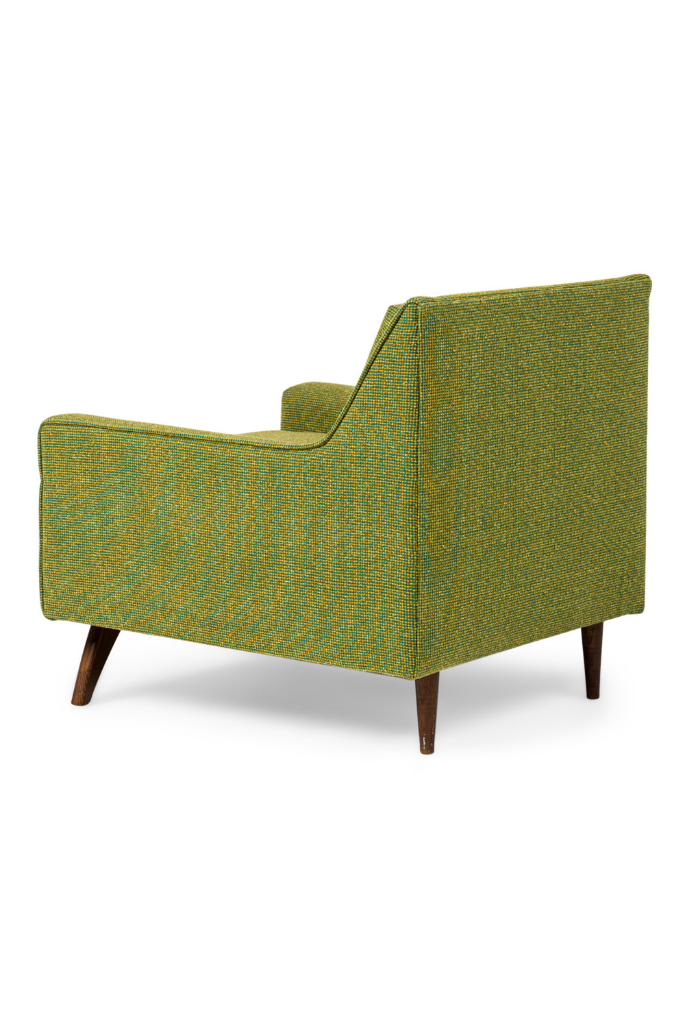 Danish Mid-Century style easy / armchair with a button tufted square seat back and avocado green tweed upholstery with splade front legs