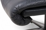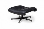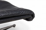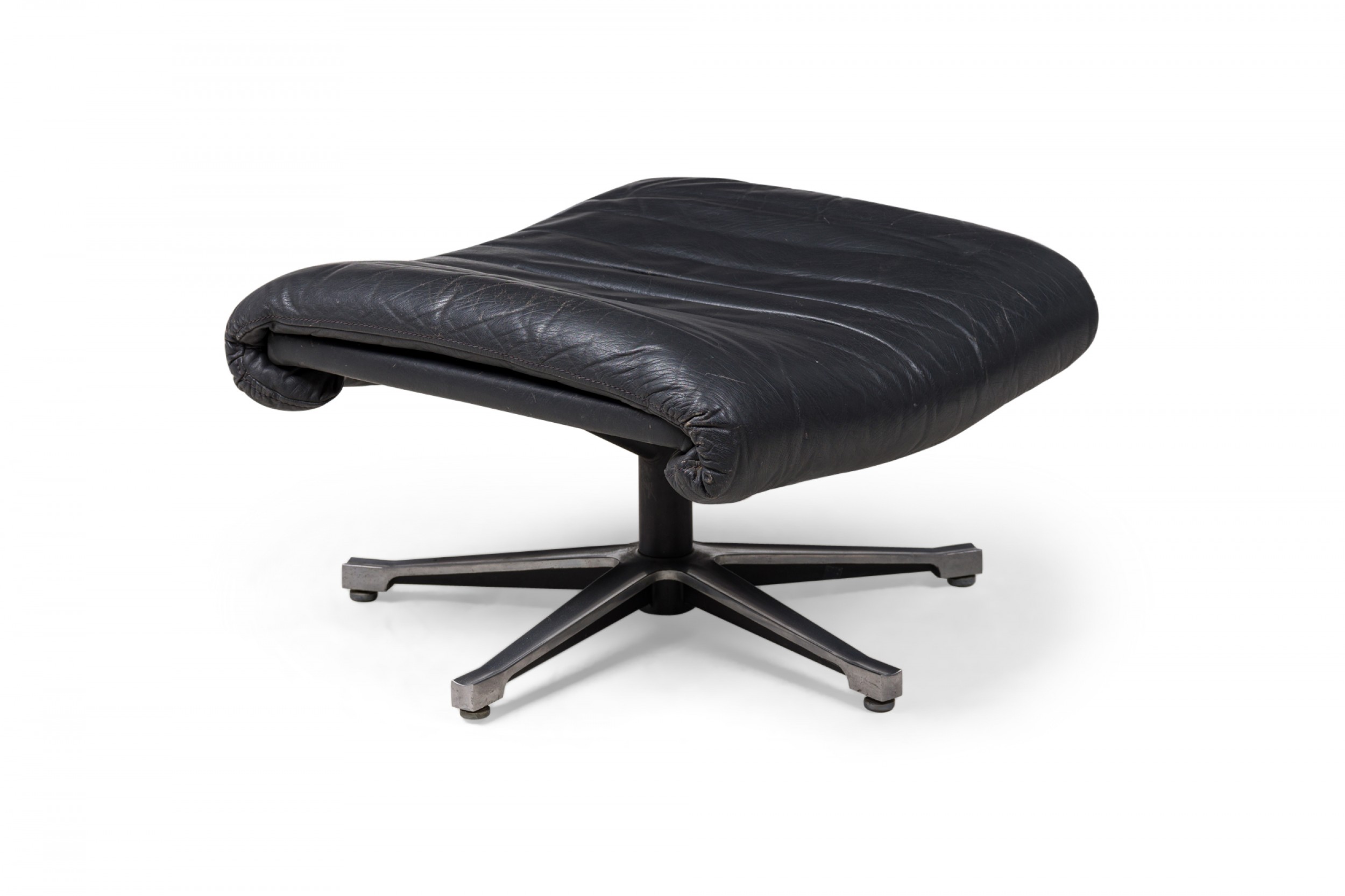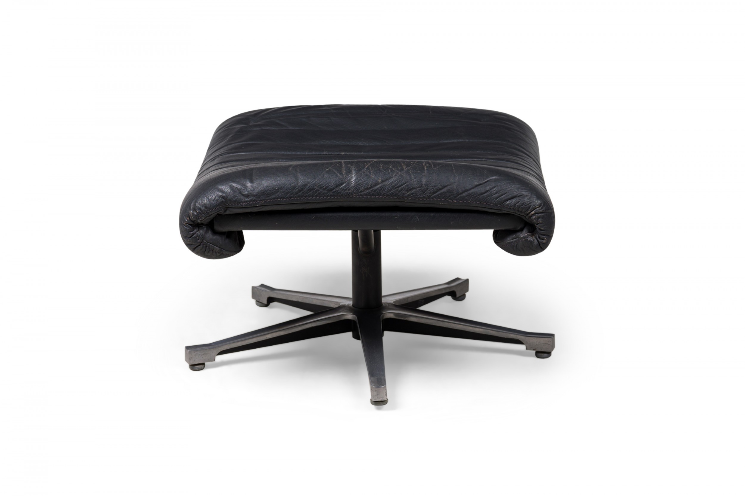 Mid-Century Swiss (1970s) metal ottoman with an incurved, contoured seat upholstered in black leather, supported by a star-shaped, stationary base with small adjustable circular feet. (Matching armchair: REG4974) (DE SEDE)