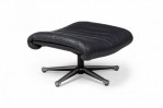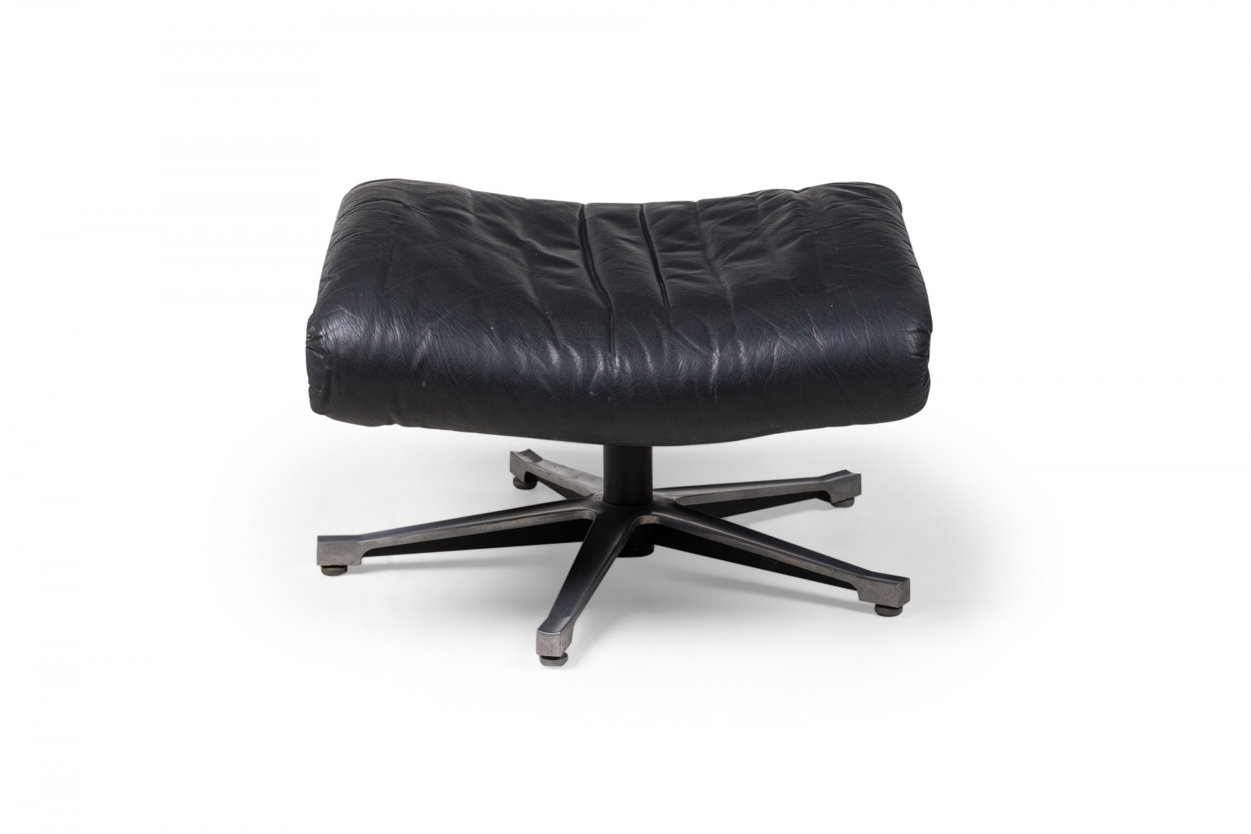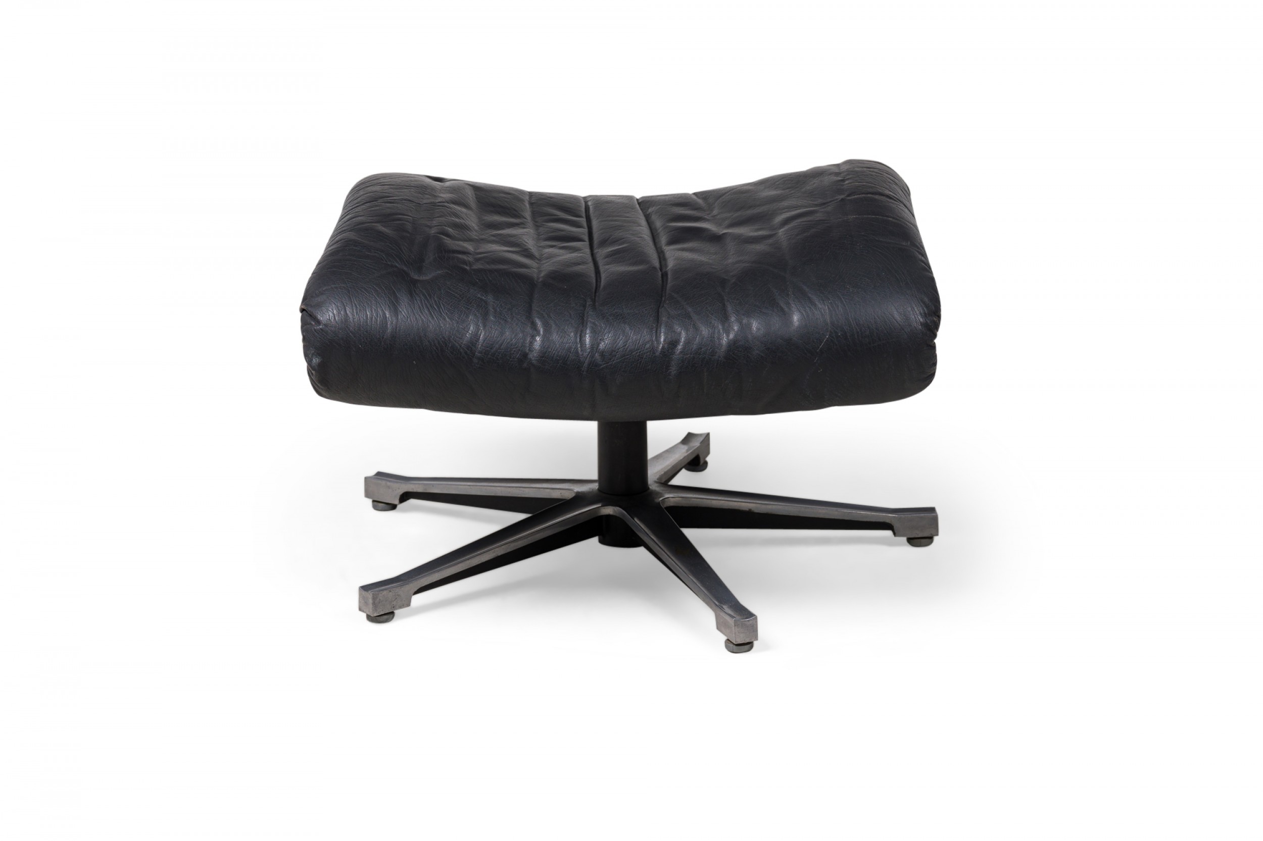 Mid-Century Swiss (1970s) metal ottoman with an incurved, contoured seat upholstered in black leather, supported by a star-shaped, stationary base with small adjustable circular feet. (Matching armchair: REG4974) (DE SEDE).