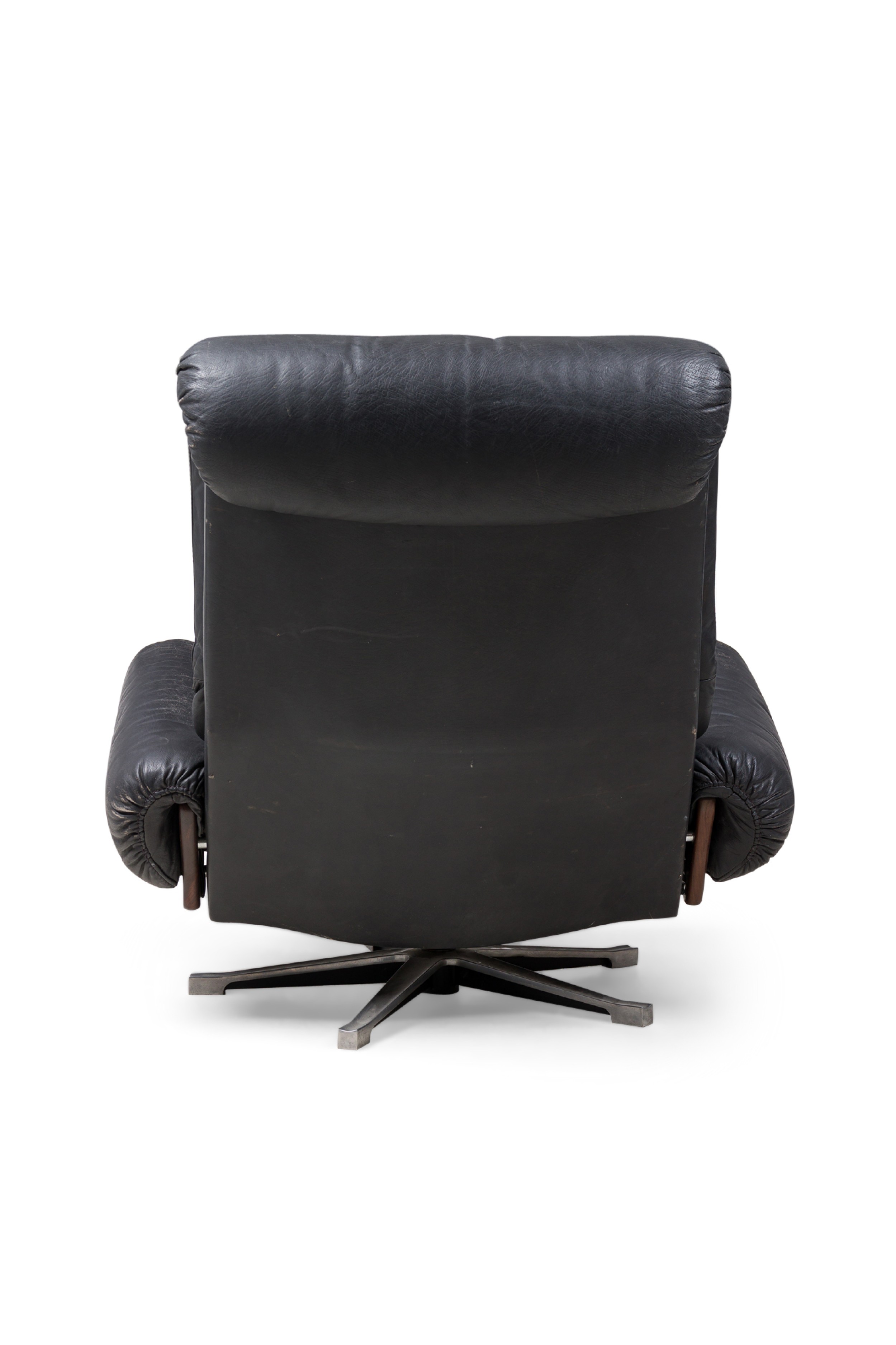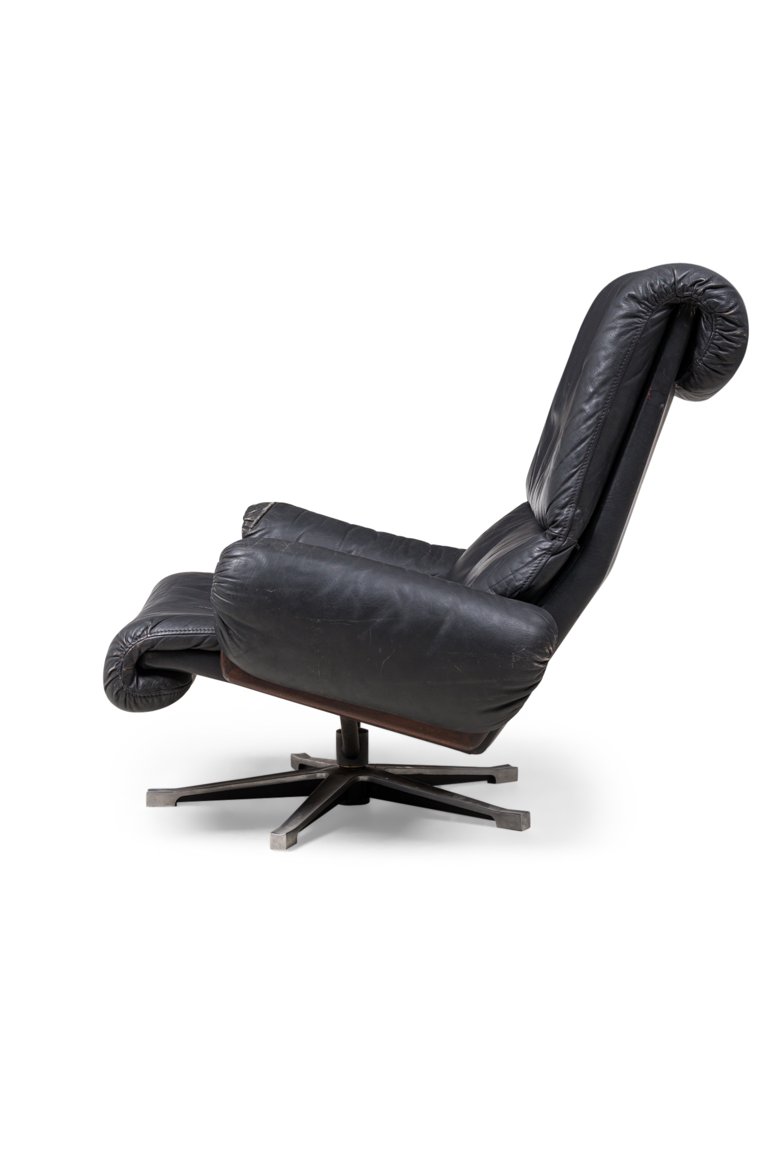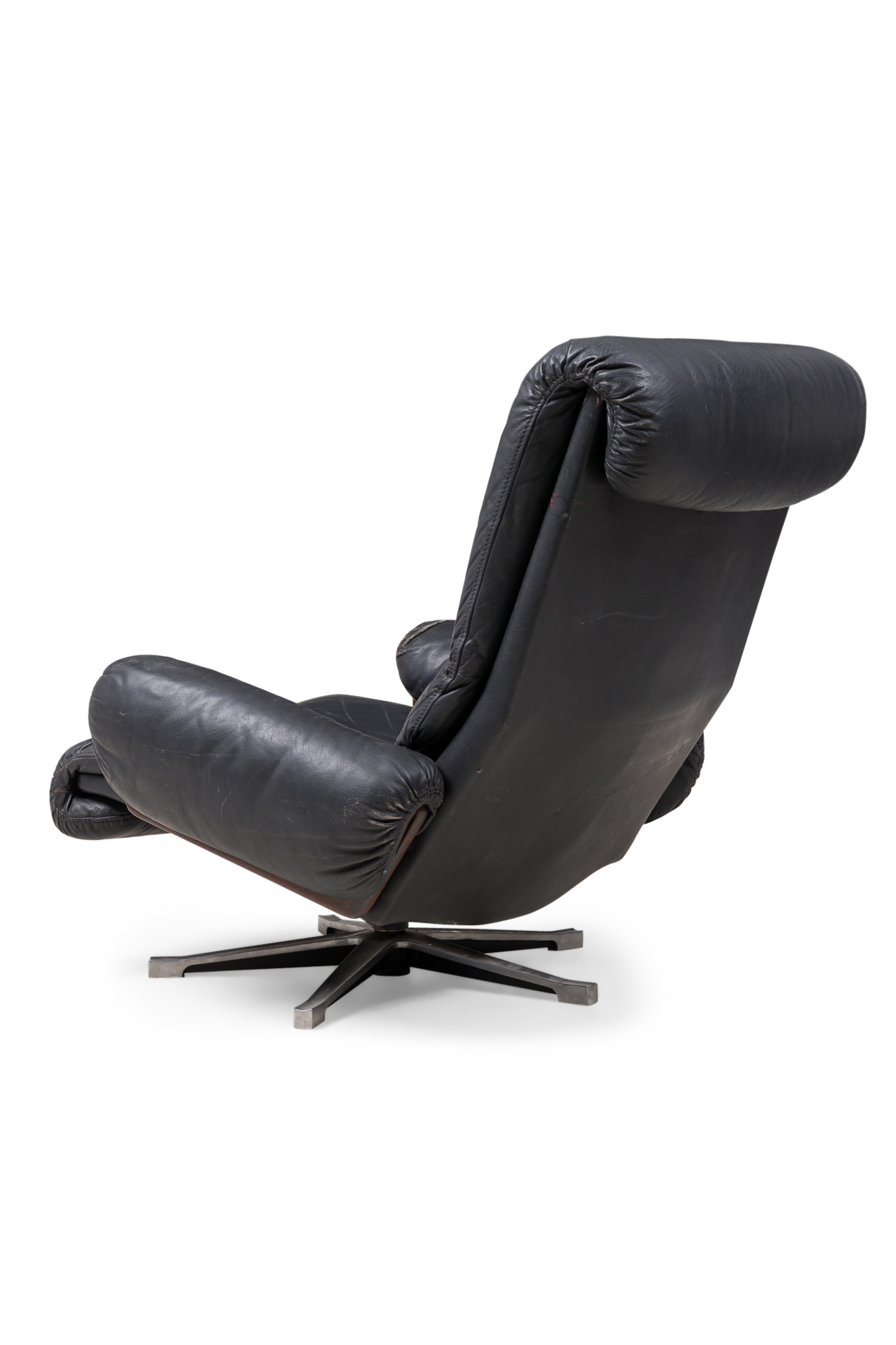 Mid-Century Swiss (1970s) metal swivel chair with incurved back, seat and arms upholstered in black leather, supported by a star-shaped, swivel base with small circular adjustable feet. (Matching ottoman: REG5054) (DE SEDE)