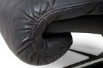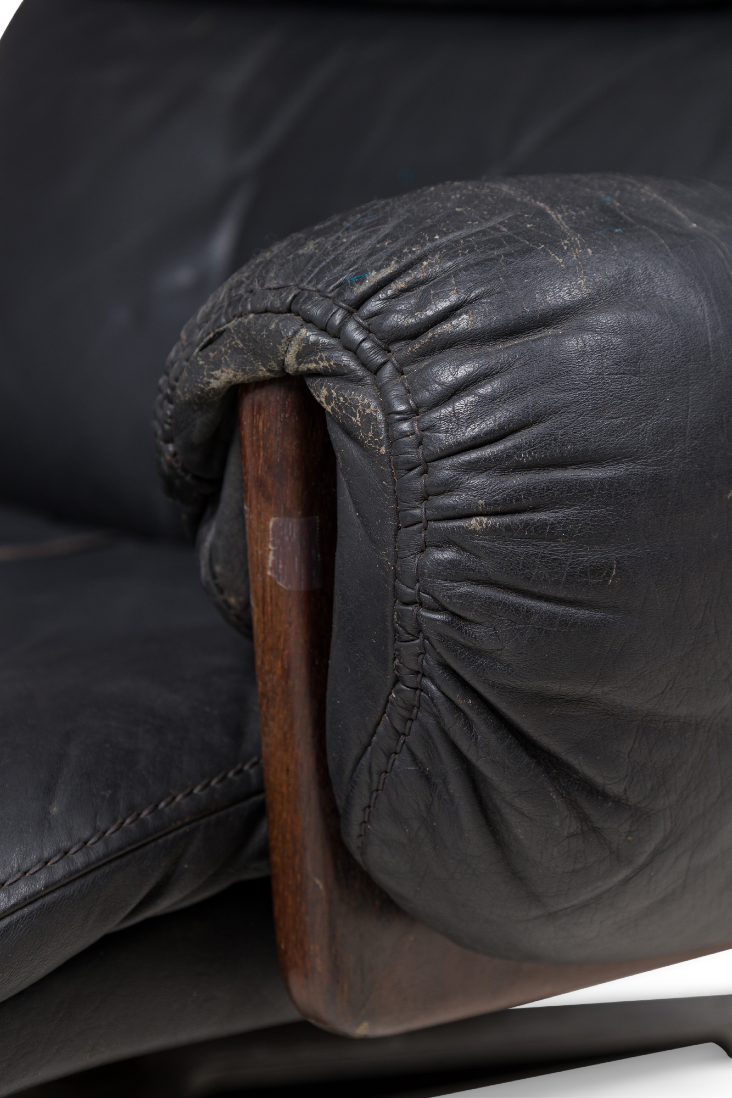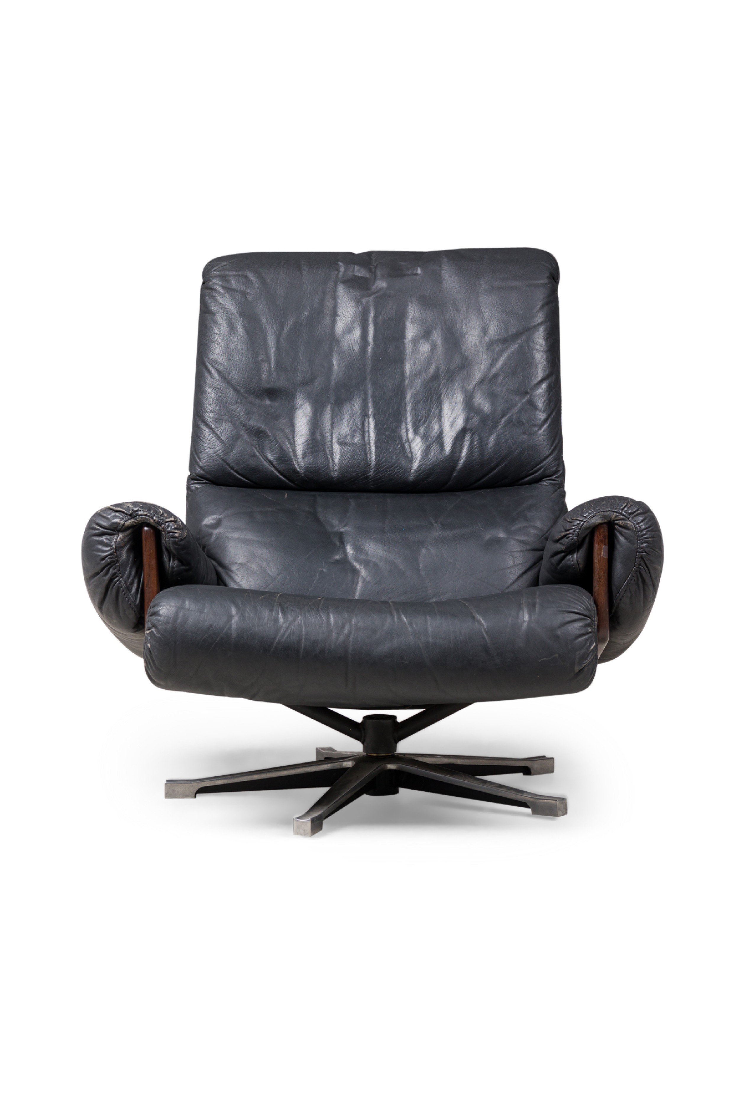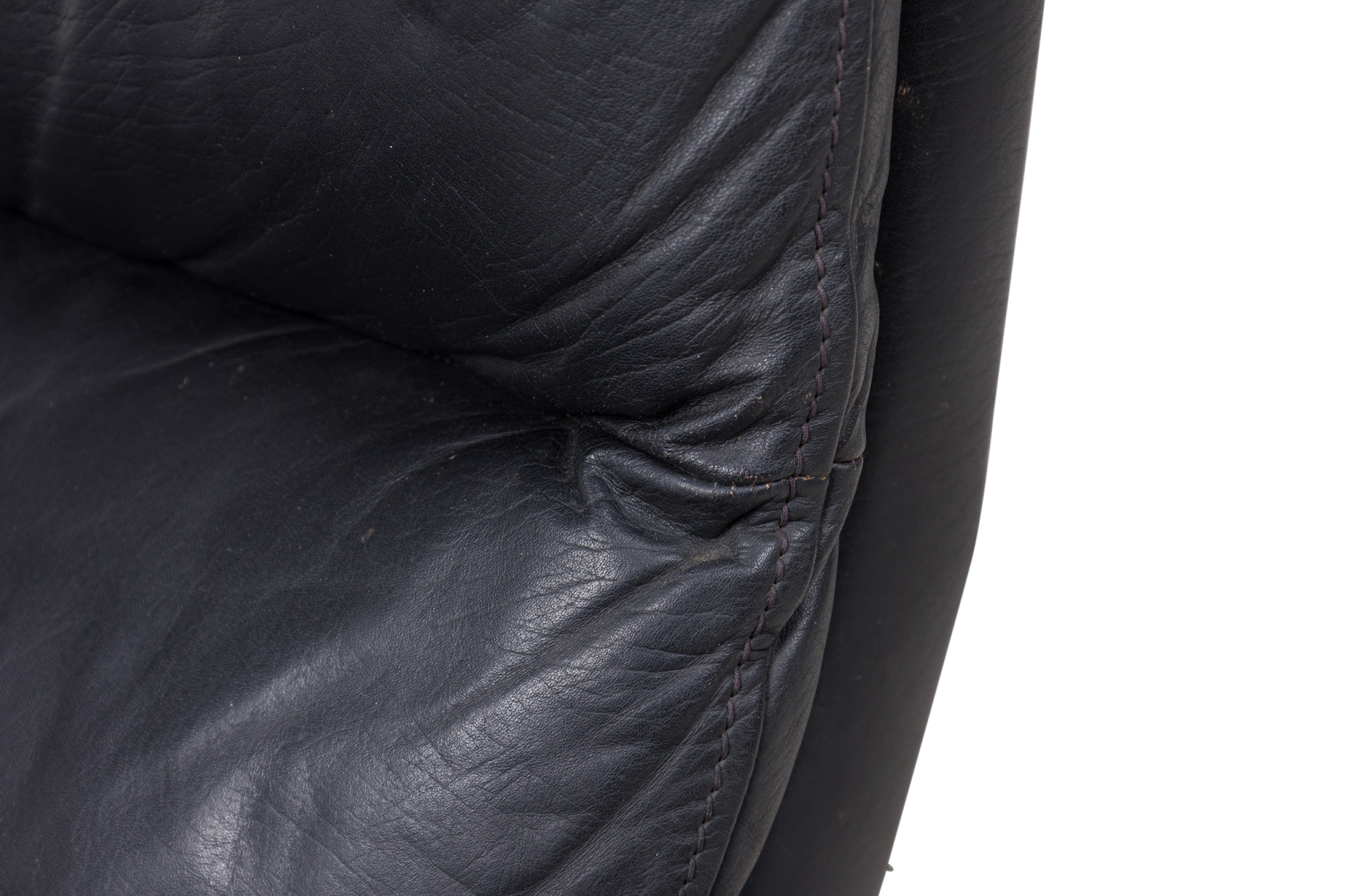 Mid-Century Swiss (1970s) metal swivel chair with incurved back, seat and arms upholstered in black leather, supported by a star-shaped, swivel base with small circular adjustable feet. (Matching ottoman: REG5054) (DE SEDE)