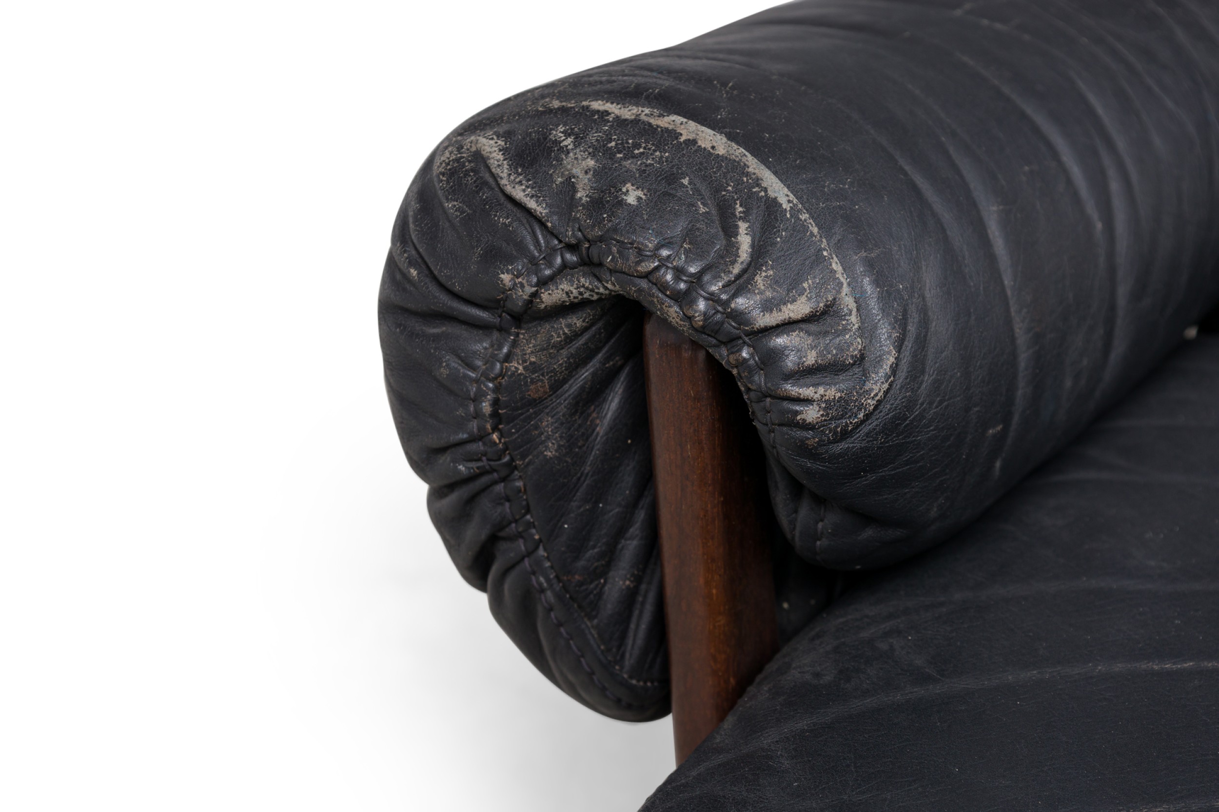 Mid-Century Swiss (1970s) metal swivel chair with incurved back, seat and arms upholstered in black leather, supported by a star-shaped, swivel base with small circular adjustable feet. (Matching ottoman: REG5054) (DE SEDE).