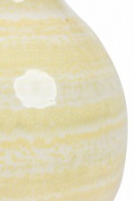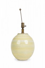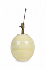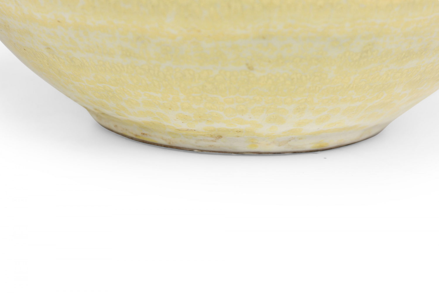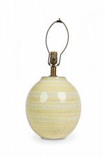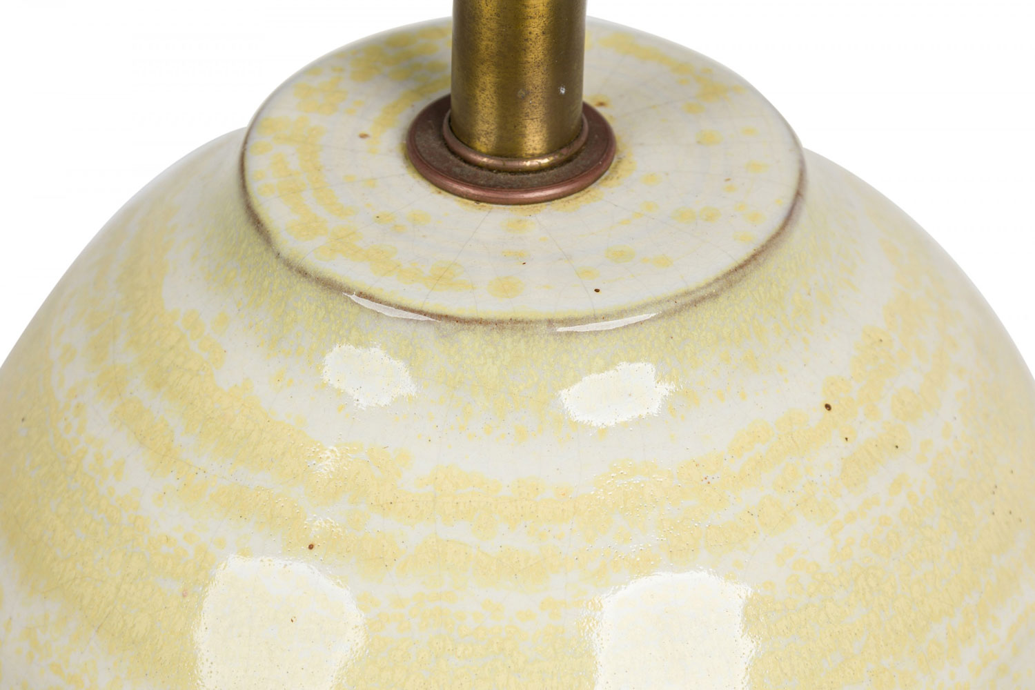 Mid-Century American ceramic table lamp in flared ovoid form with flattened top and embedded brass stem, harp and functional light switch socket, the body hand painted in textured canary yellow concentric rings peeking through the glossy, buttery popcorn-like white crackle glaze. (DESIGN TECHNICS).