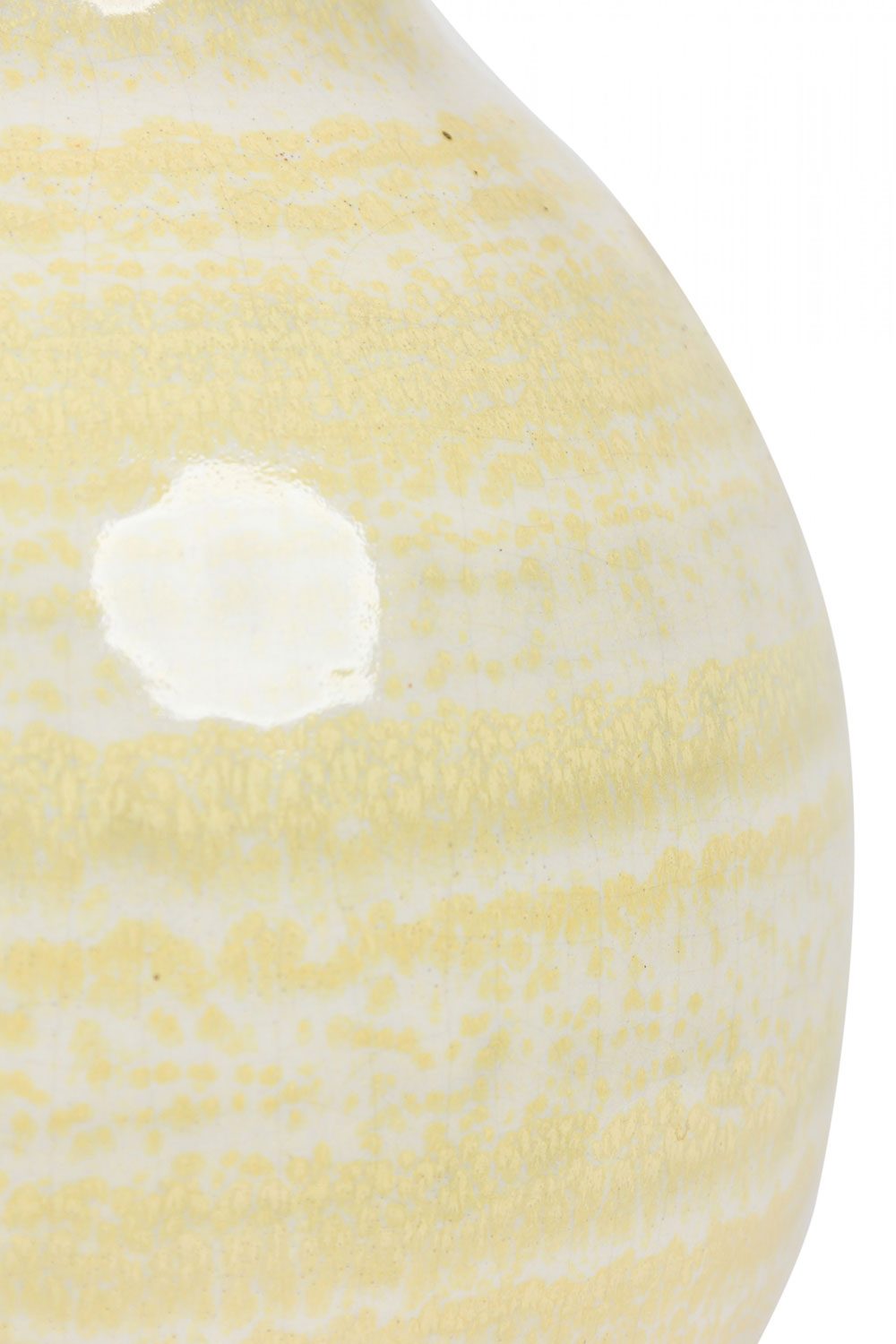 Mid-Century American ceramic table lamp in flared ovoid form with flattened top and embedded brass stem, harp and functional light switch socket, the body hand painted in textured canary yellow concentric rings peeking through the glossy, buttery popcorn-like white crackle glaze. (DESIGN TECHNICS)