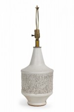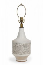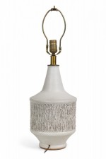 Mid-Century American ceramic table lamp in cylindrical form, tapering toward the top with a fitted brass functioning light switch, a heavily textured bark-like banded mid section ending in a tapered ring-footed bottom, fired in an opaque white matte glaze. (DESIGN TECHNICS) (Similar piece: DUL0044).