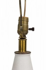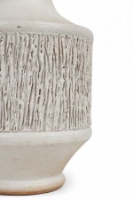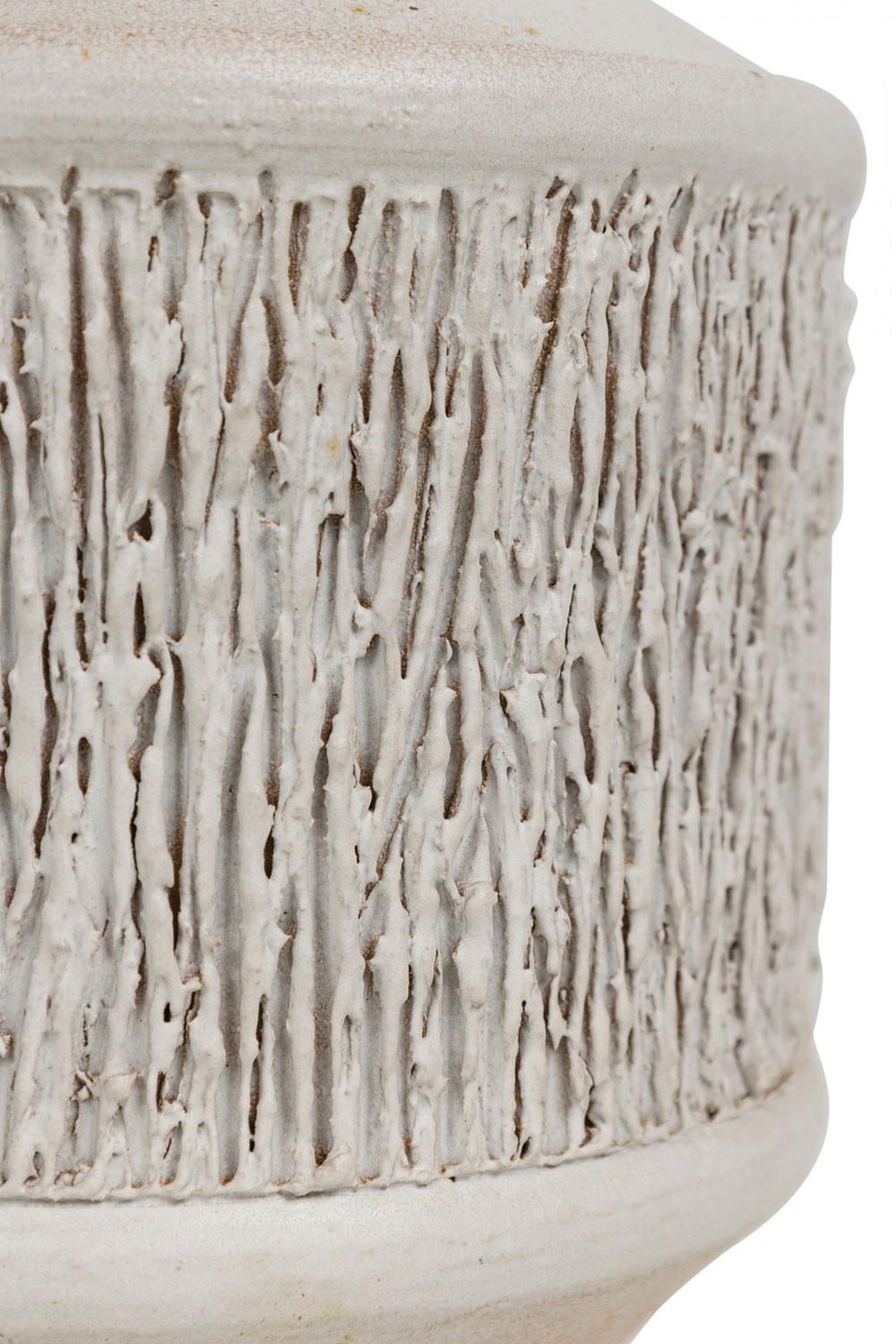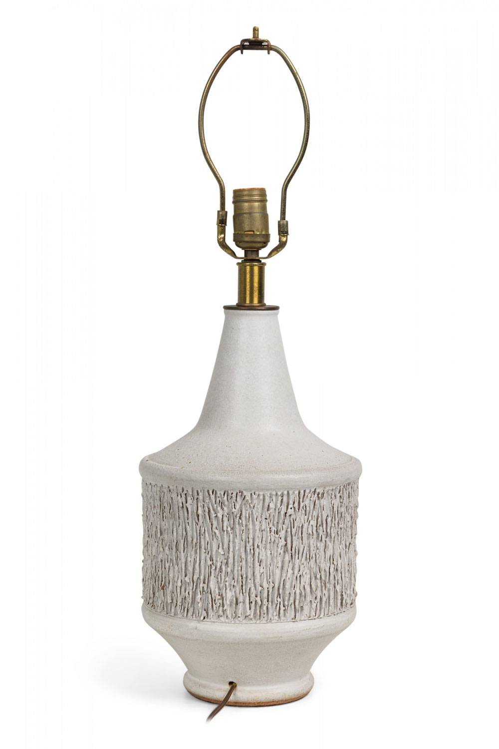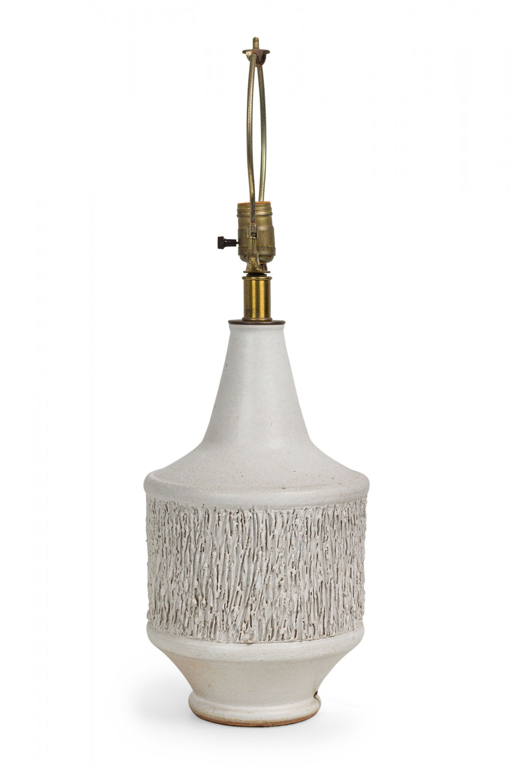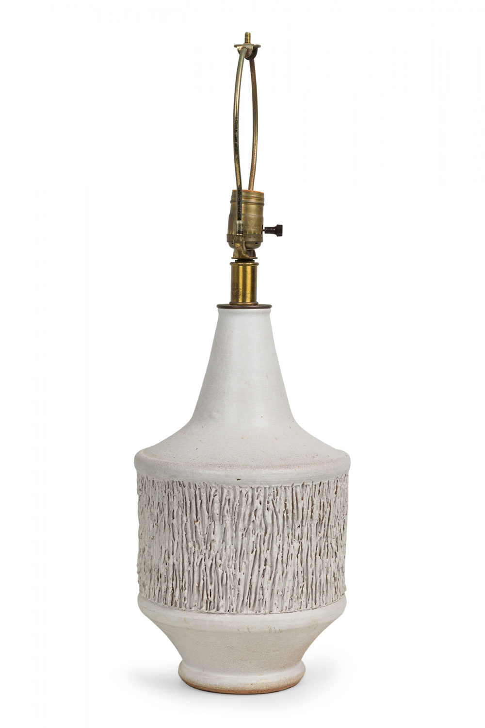 Mid-Century American ceramic table lamp in cylindrical form, tapering toward the top with a fitted brass functioning light switch, a heavily textured bark-like banded mid section ending in a tapered ring-footed bottom, fired in an opaque white matte glaze. (DESIGN TECHNICS) (Similar piece: DUL0044)