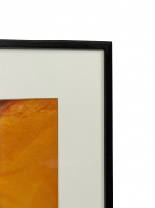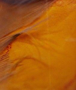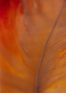 Color photograph in a black frame of a detail of an orange feather. Photography by Shelley Harrison.