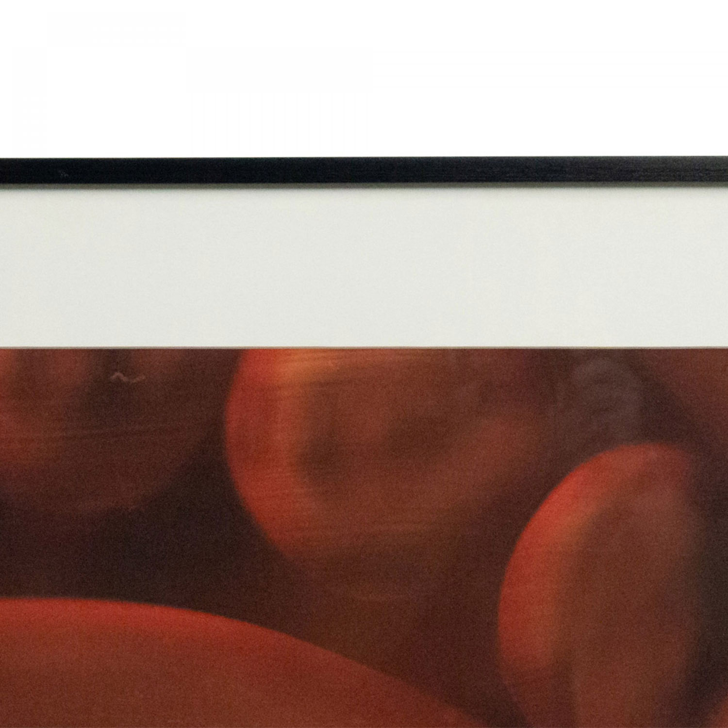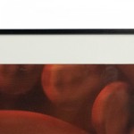 Color photograph in a black frame of red abstract shapes. Photograph by Shelley Harrison..