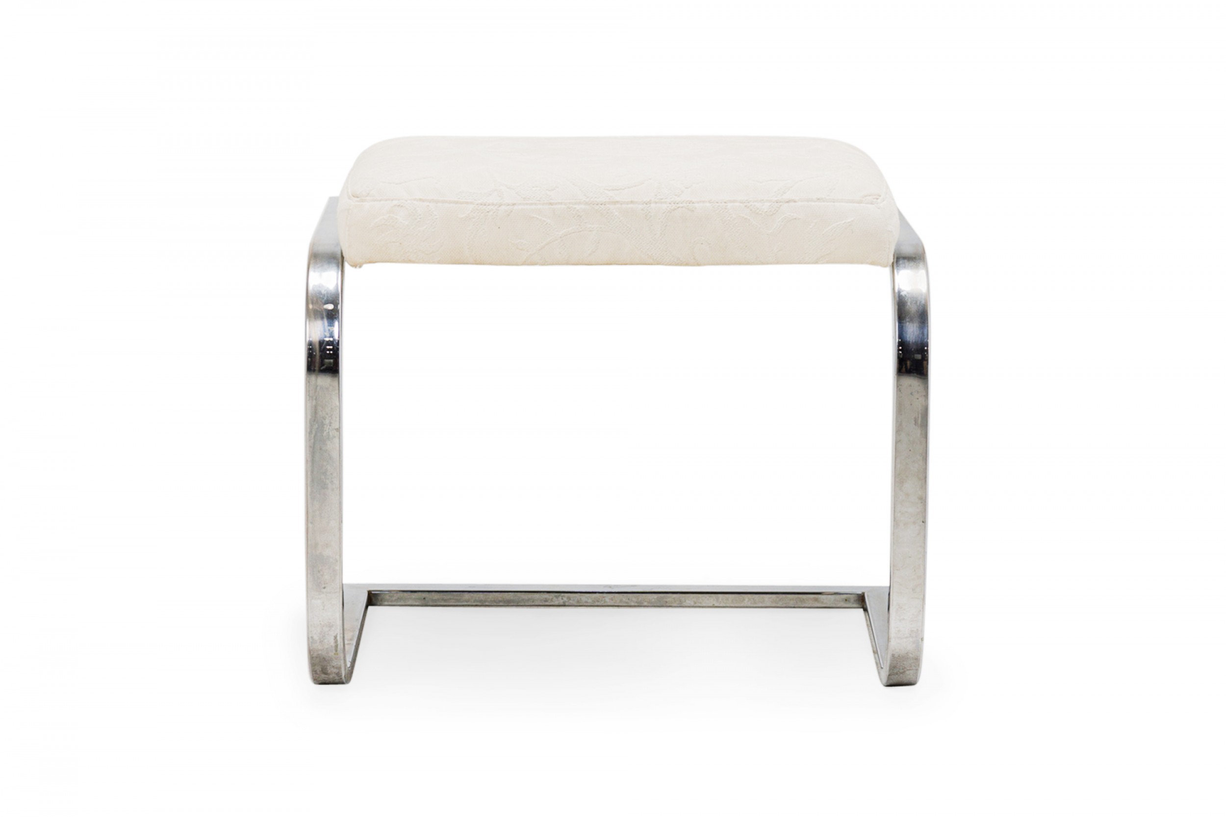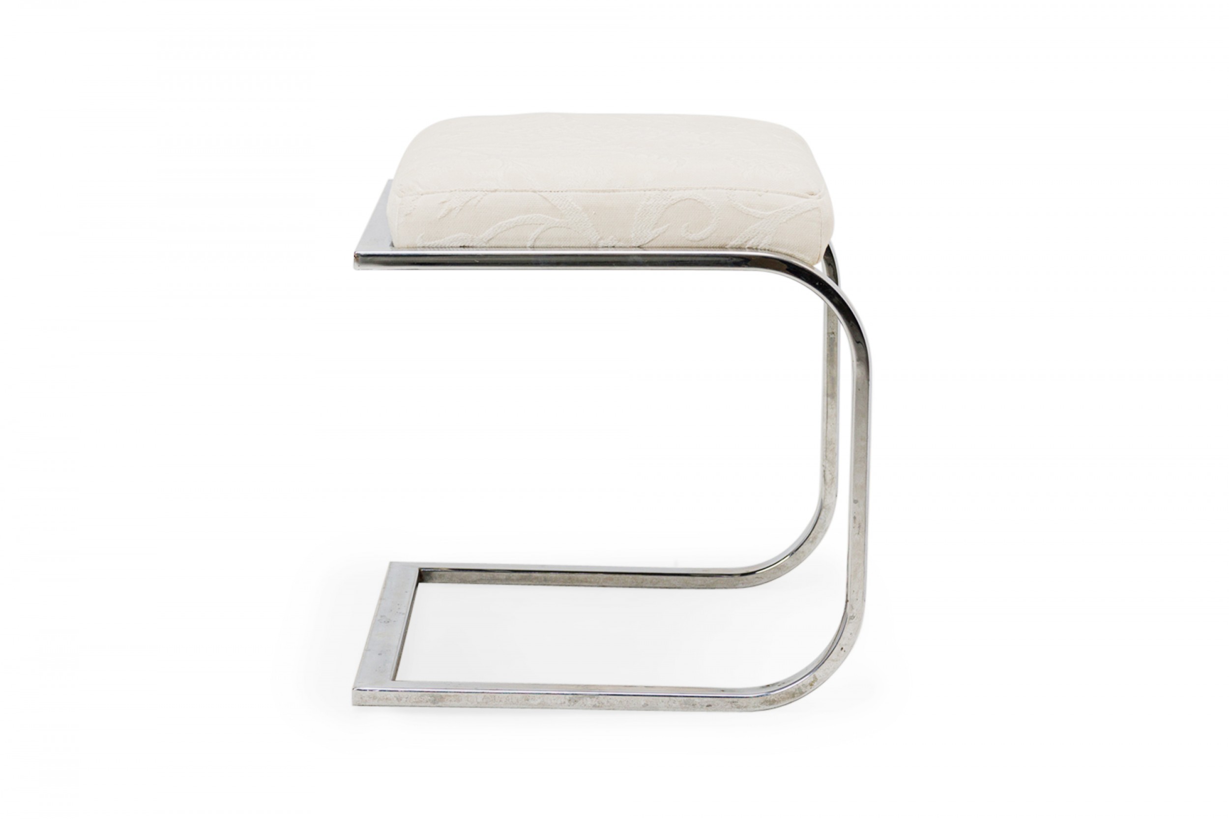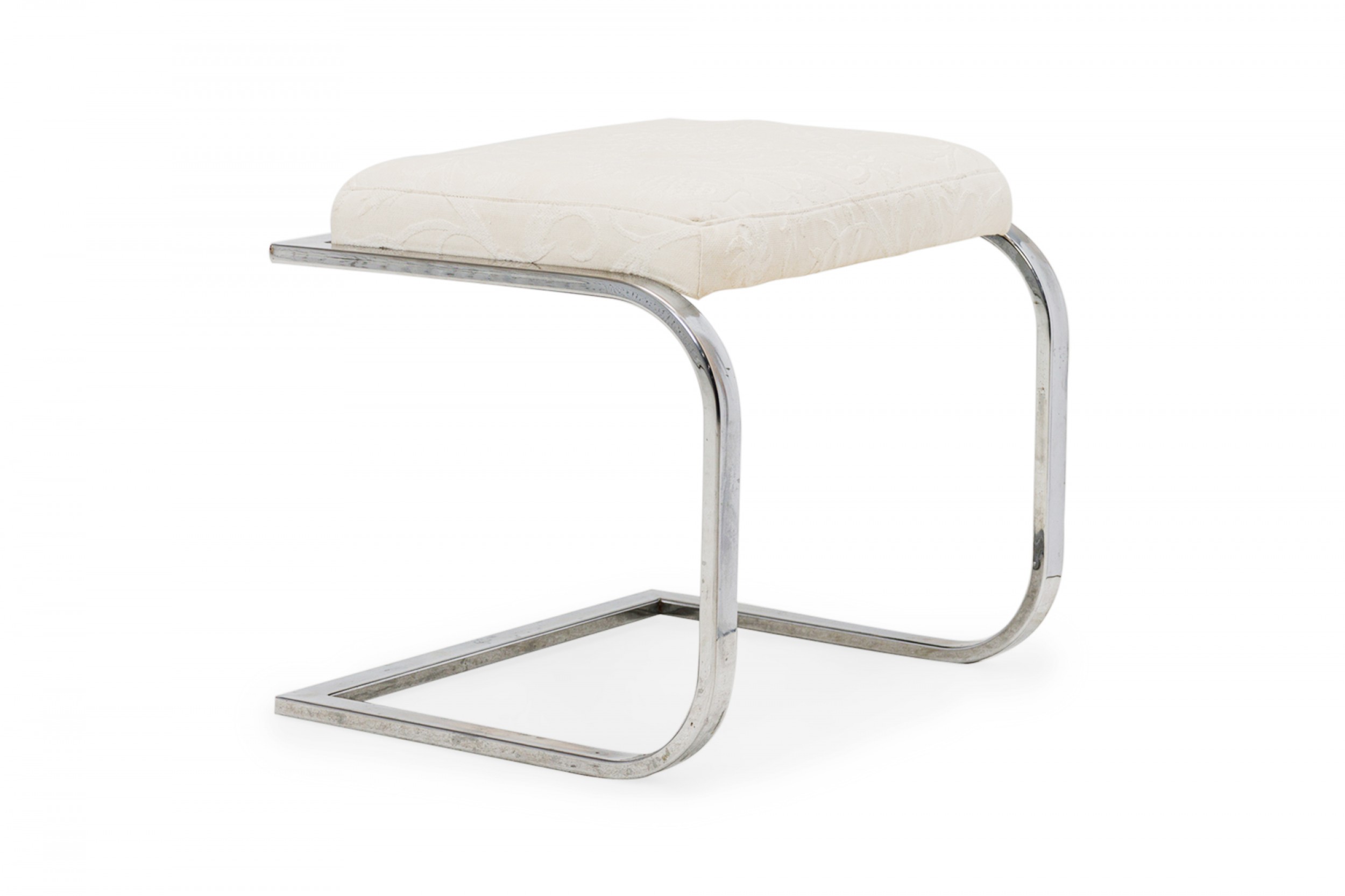 American Mid-Century cantilever design footstool with a curved square chrome tube base supporting a rectangular beige upholstered top with a faint floral pattern. (DIA DESIGN INSTITUTE OF AMERICA)