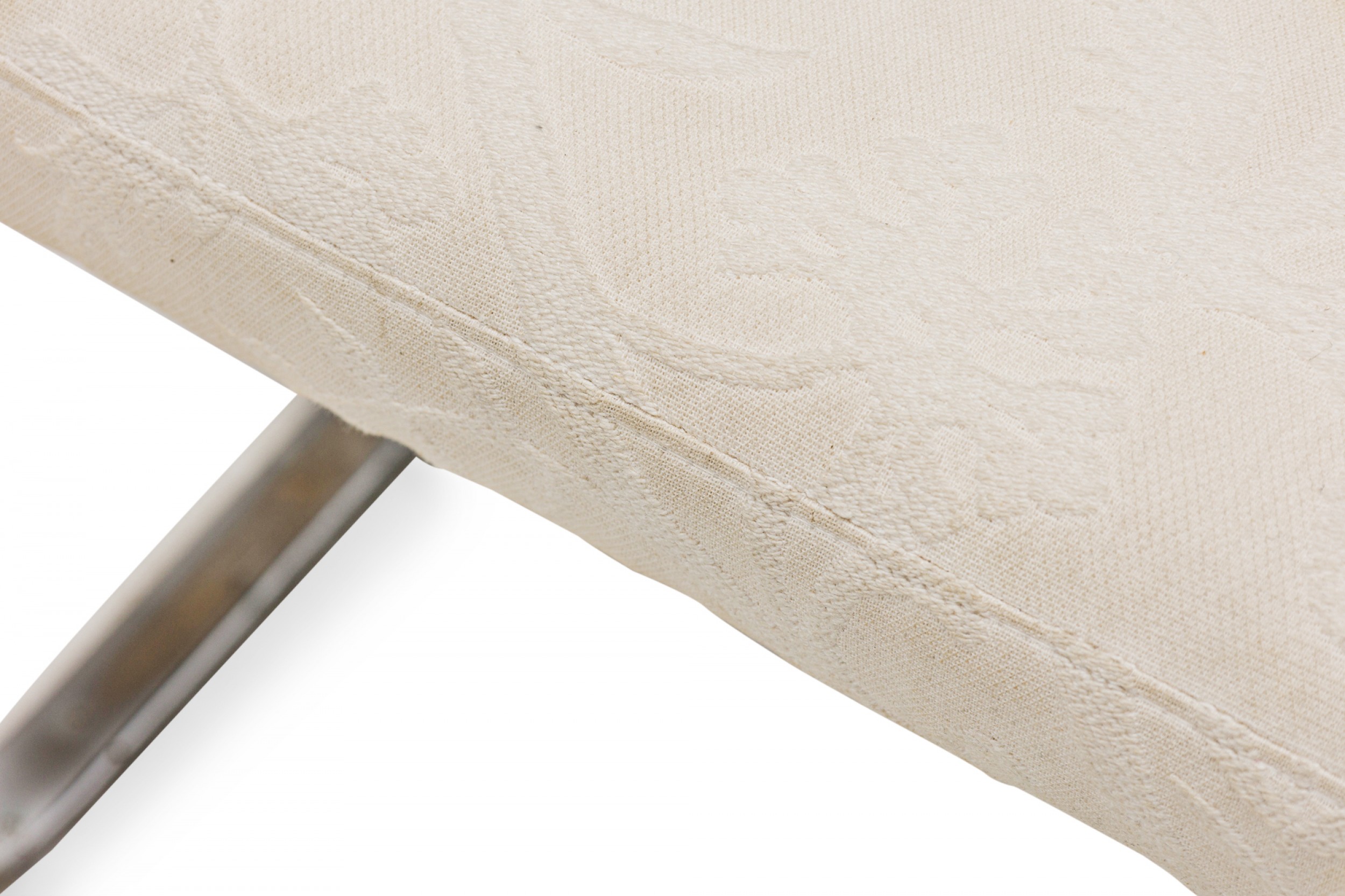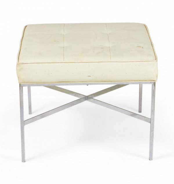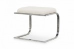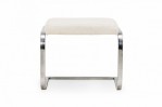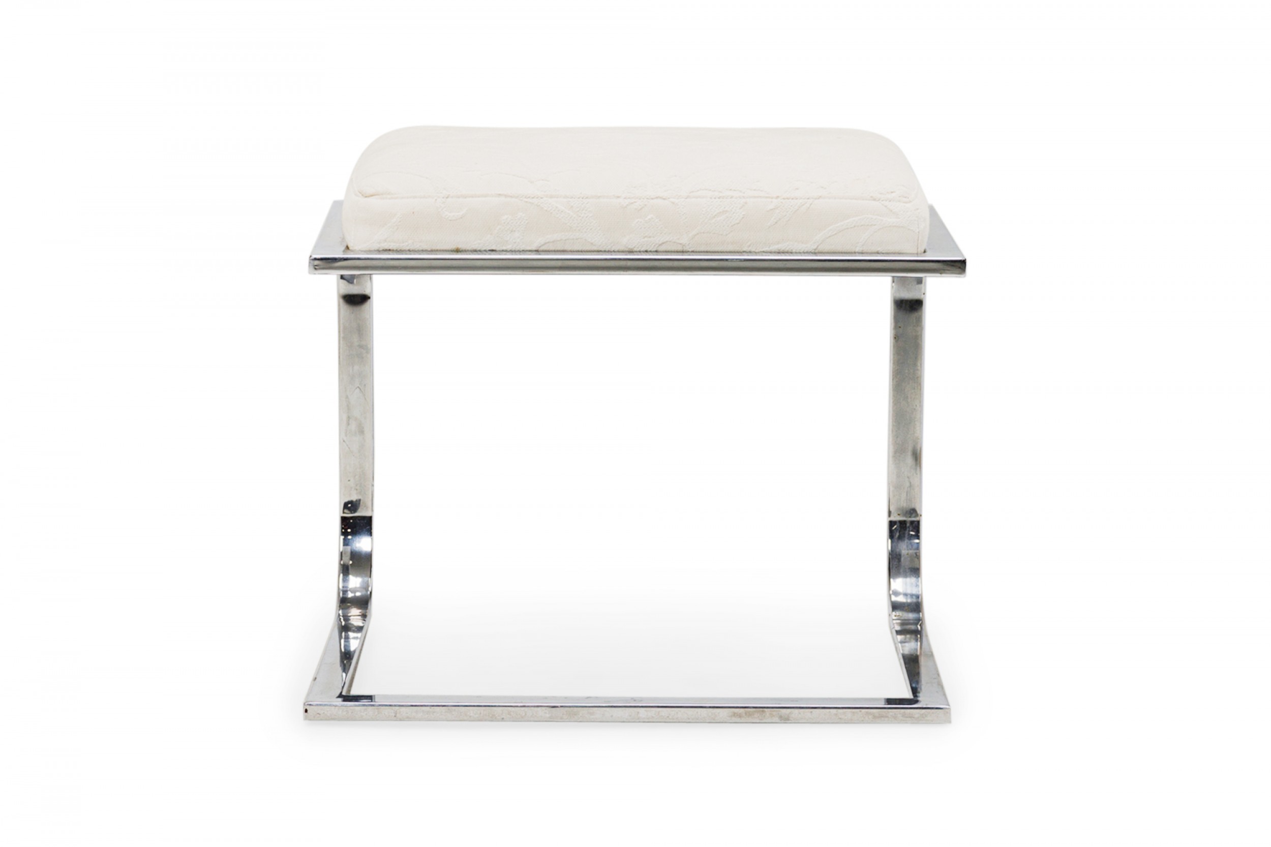 American Mid-Century cantilever design footstool with a curved square chrome tube base supporting a rectangular beige upholstered top with a faint floral pattern. (DIA DESIGN INSTITUTE OF AMERICA)