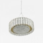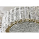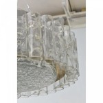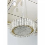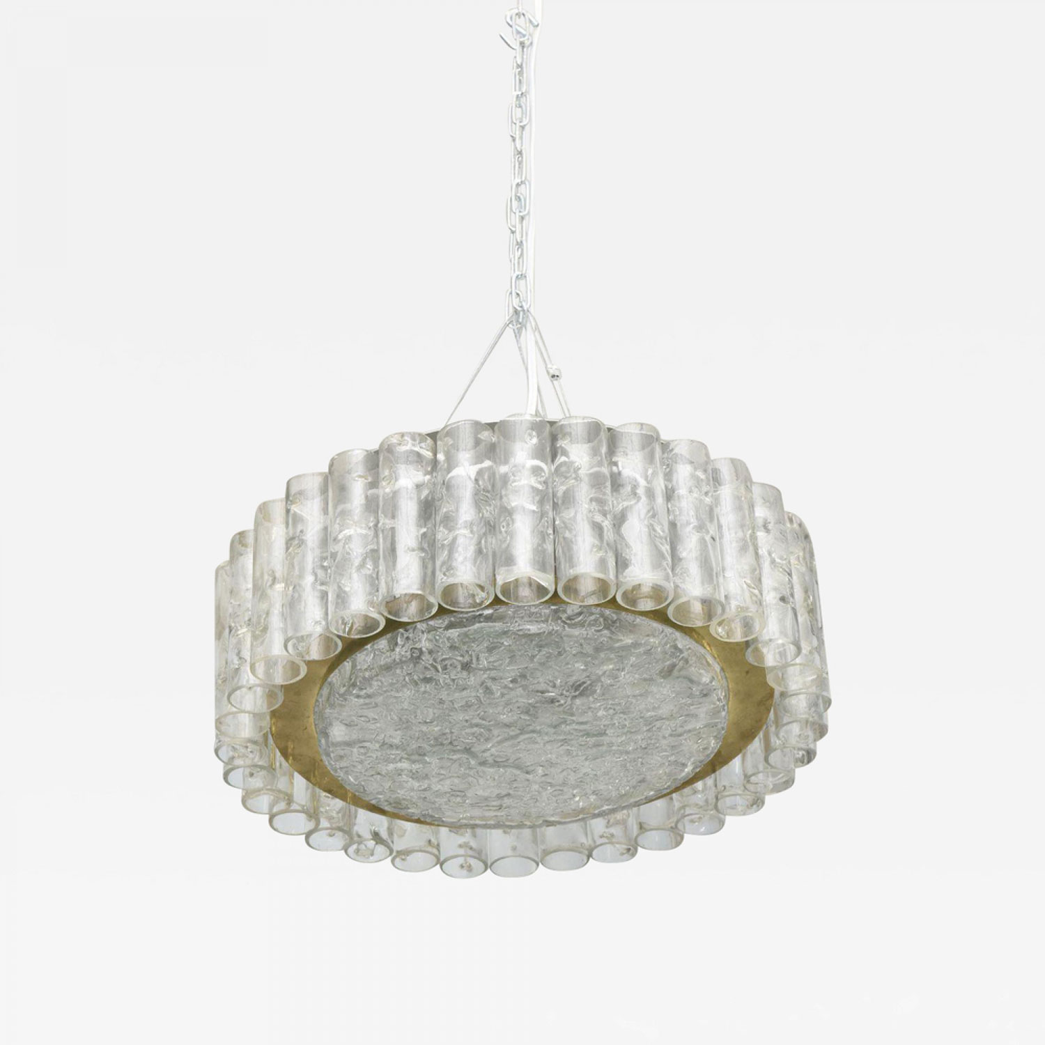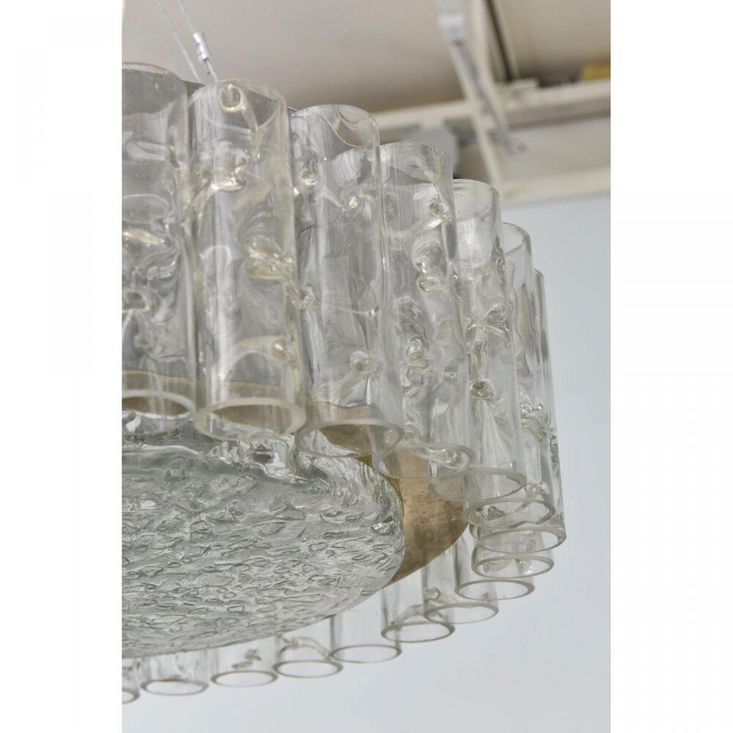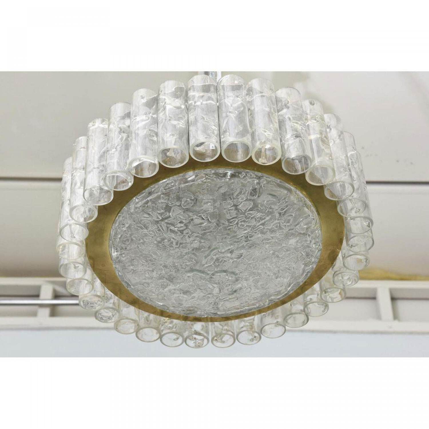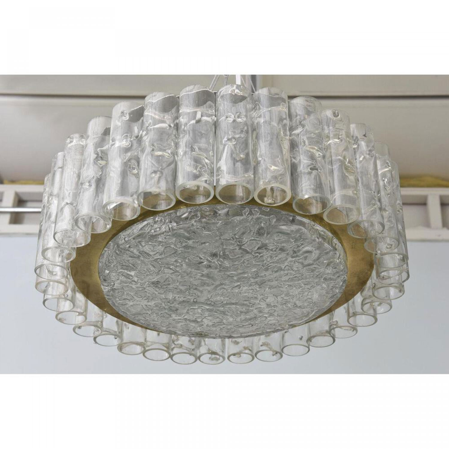 German Mid-Century Modern brass chandelier / ceiling light with clear textured blown glass cylinders surrounding a central blown glass light. (DORIA LEUCHTEN).