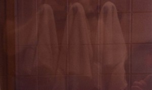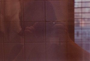 Double exposure color photograph of a person in a bathroom with a line of towels with a black frame and a white matte. Photograph by Shelley Harrison.