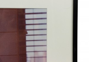 Double exposure color photograph of a person in a bathroom with a line of towels with a black frame and a white matte. Photograph by Shelley Harrison..