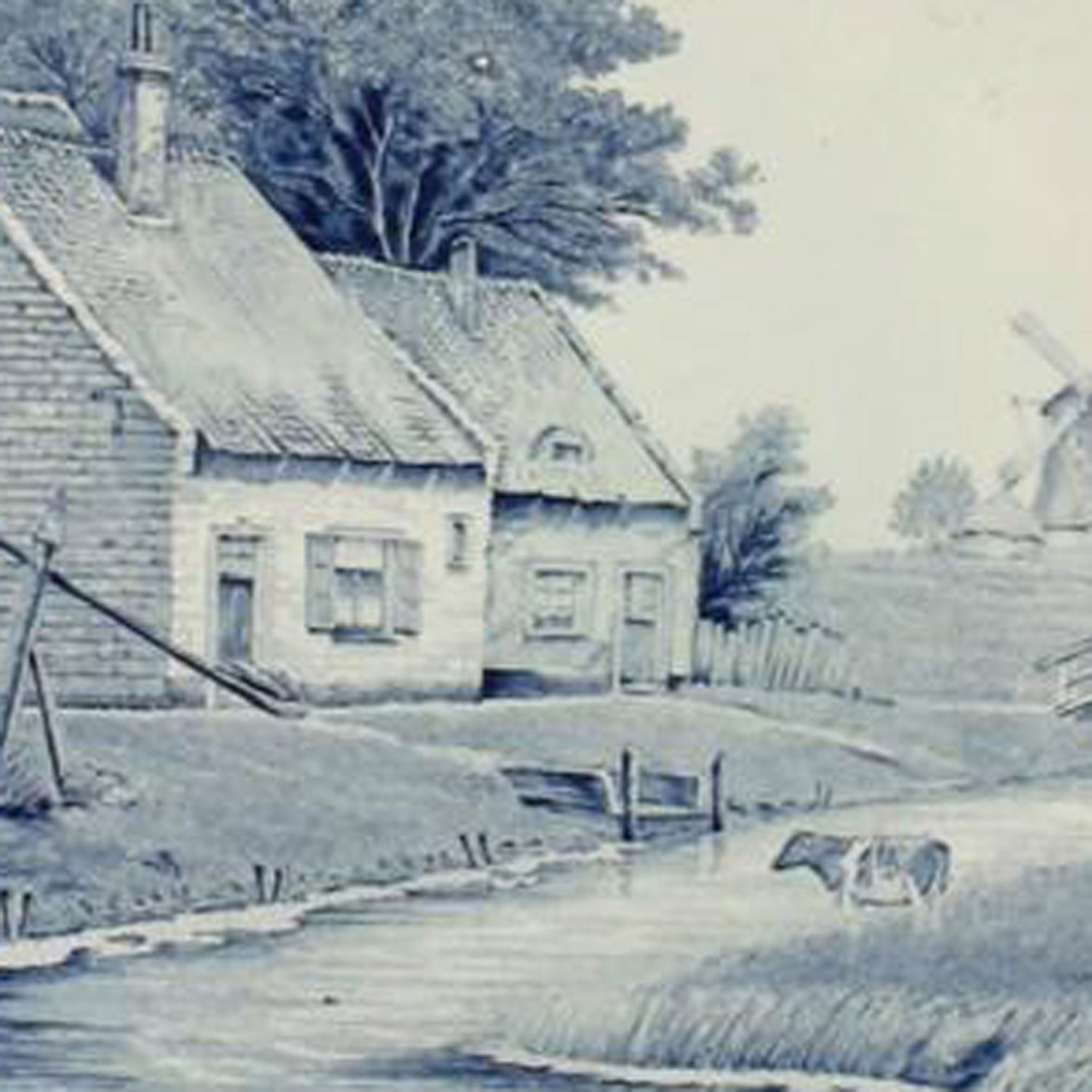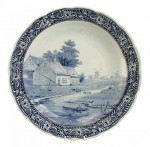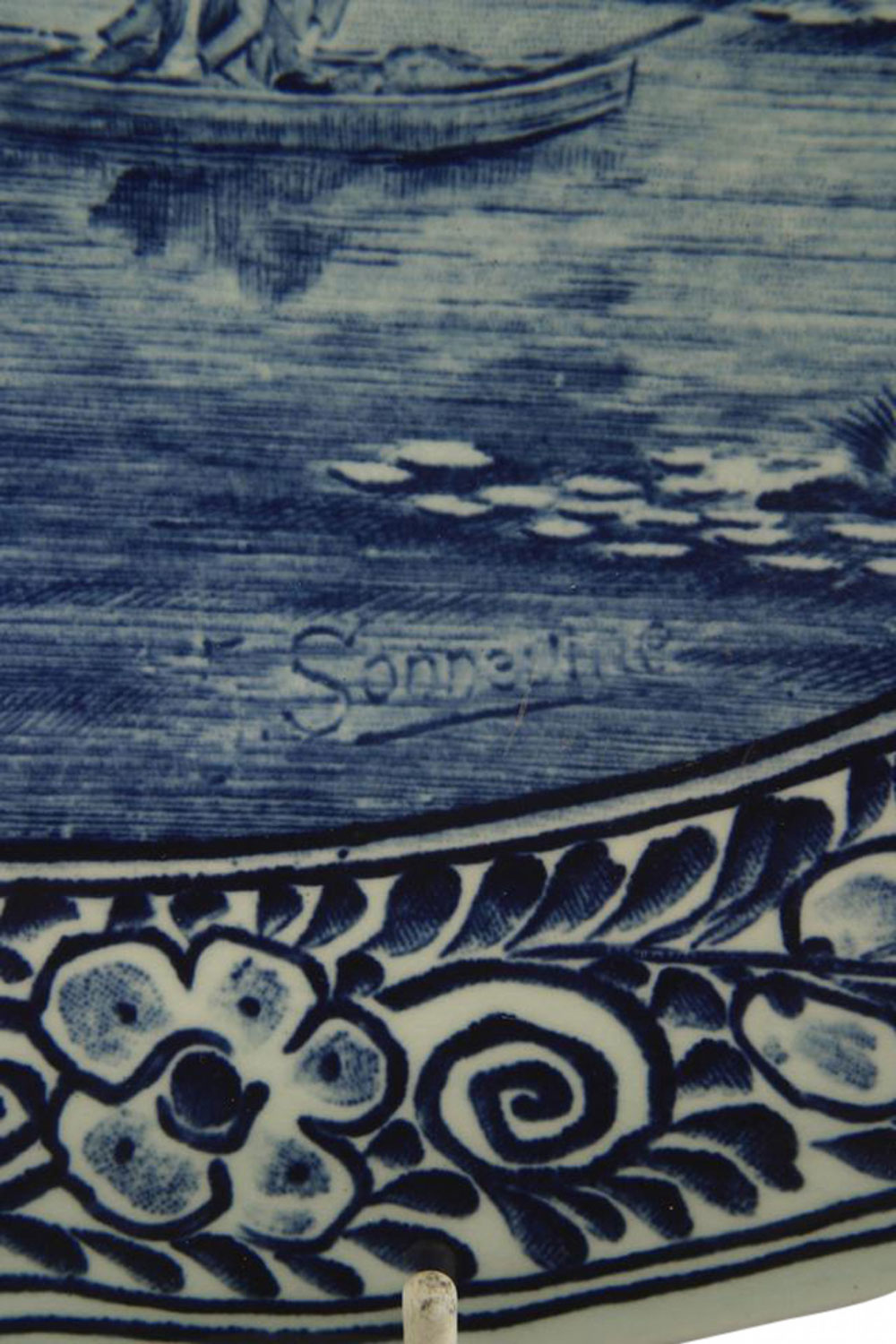 Dutch blue and white Delft porcelain wall plaque (19/20th Century) with scalloped edge and landscape scene of cottage by canal (signed T. Sonneville) (Related item: 043937B, 043937C)..