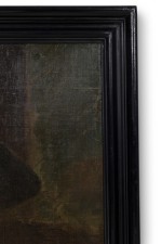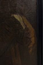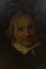 Dutch Old Master style (19th Cent) black framed oil painting portrait of man with large hat and hand draped over chair (Enrico Caruso Estate).