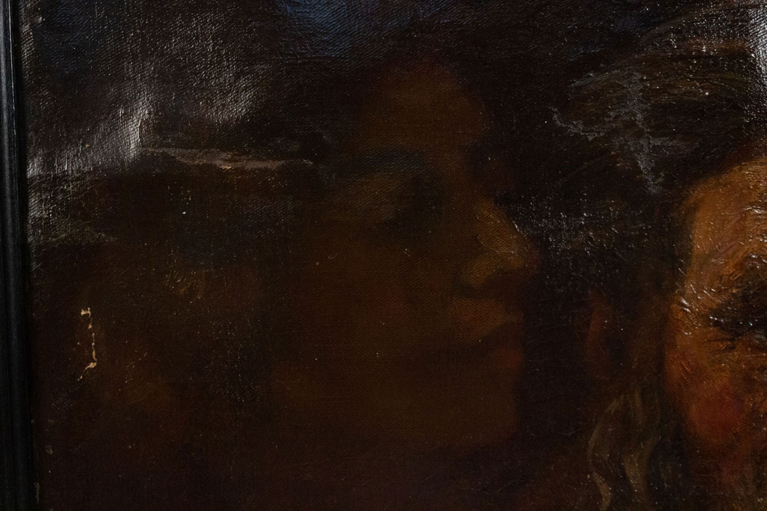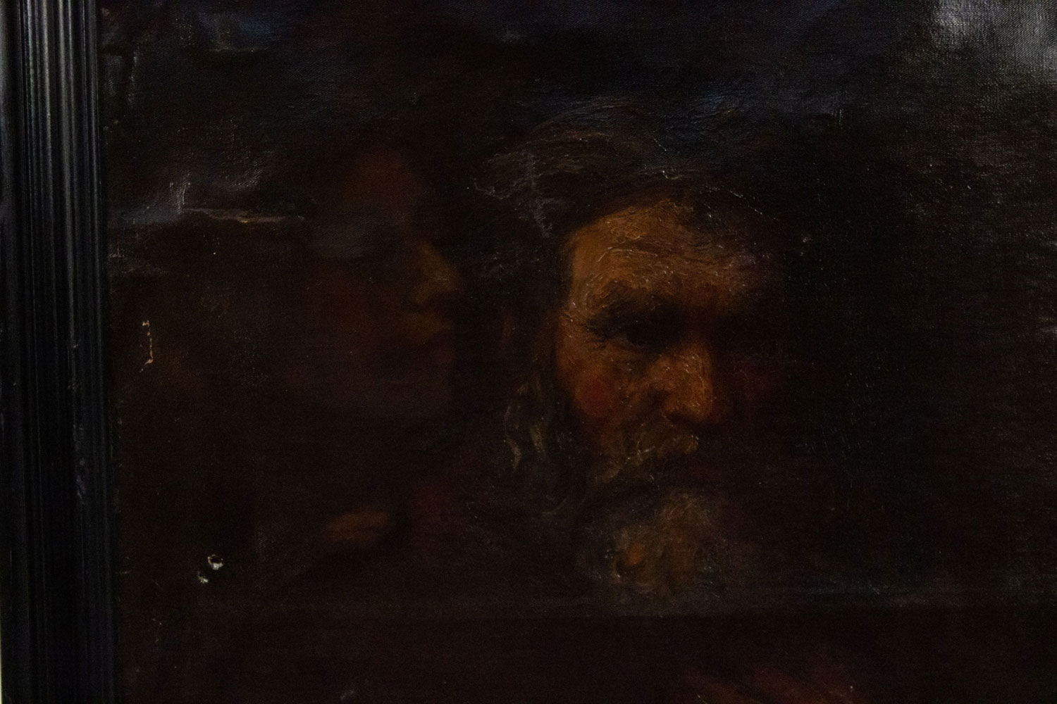 Dutch Old Master style (19th Cent) black framed oil painting portrait of old man writing in a book with lady in background (Enrico Caruso Estate).
