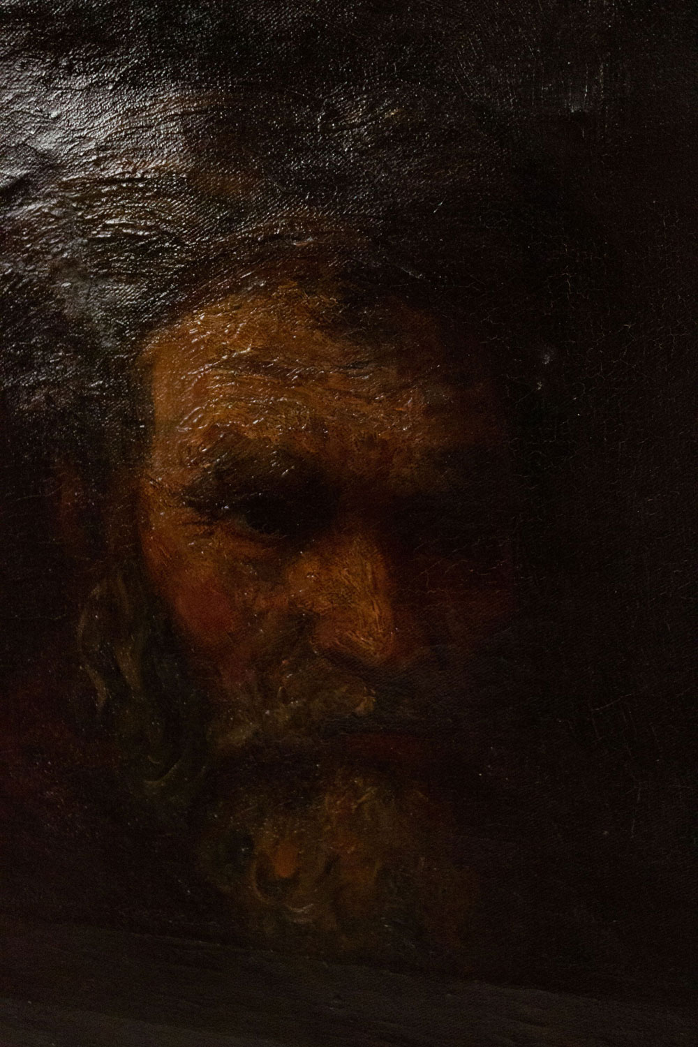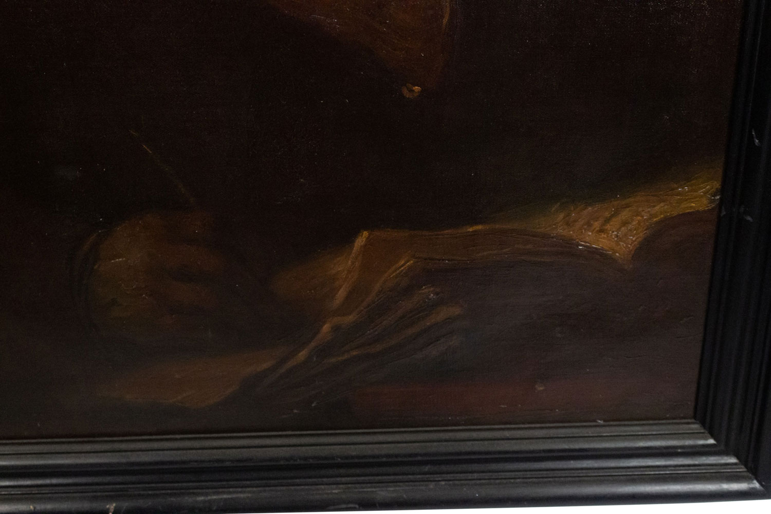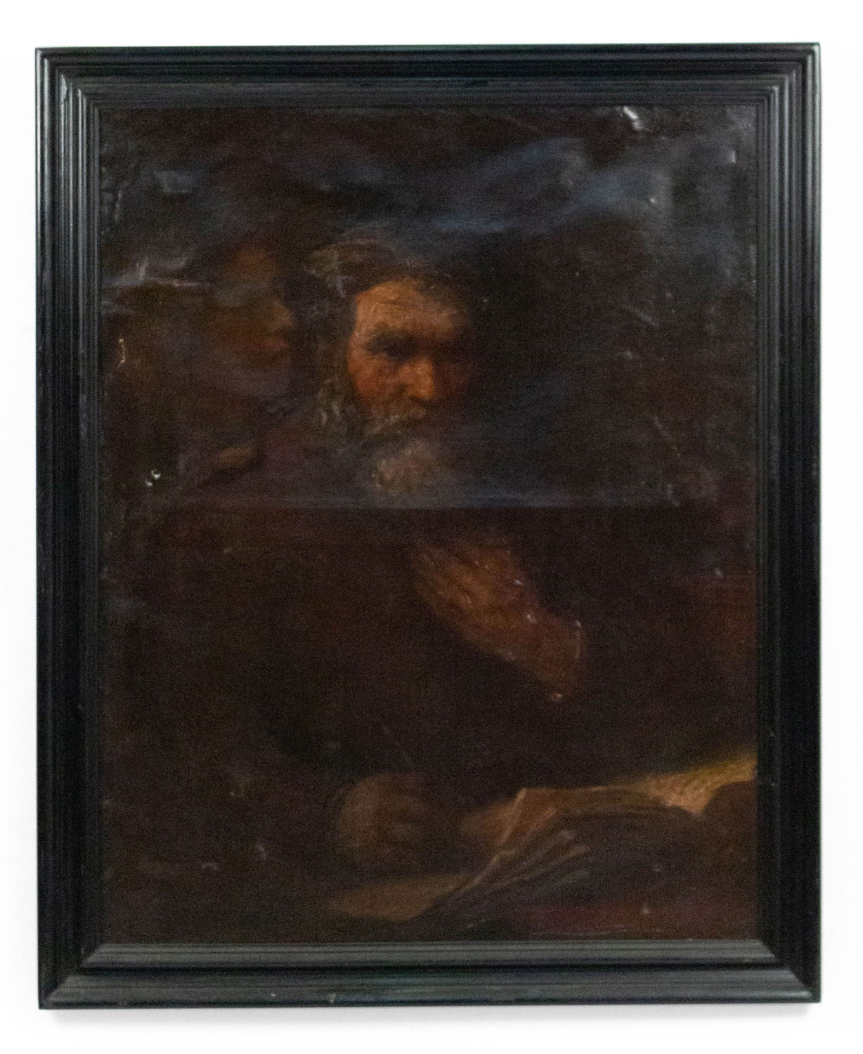 Dutch Old Master style (19th Cent) black framed oil painting portrait of old man writing in a book with lady in background (Enrico Caruso Estate)