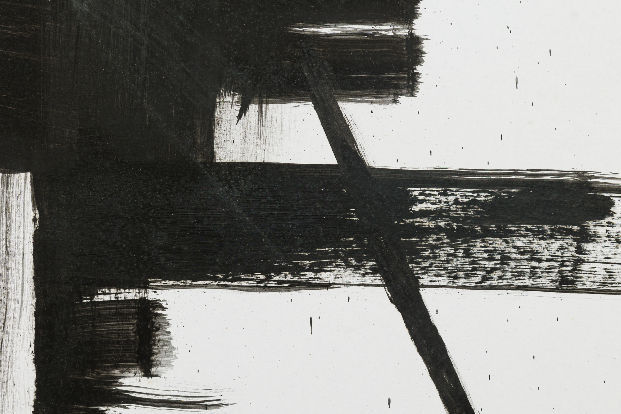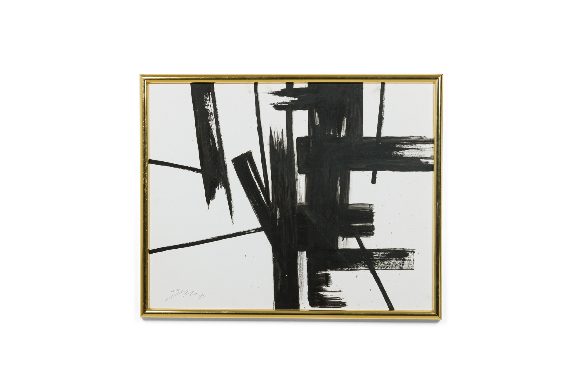 American Mid-Century abstract expressionist painting with black paint strokes against a white background in a black and gilt frame (signed: ED ELLER).