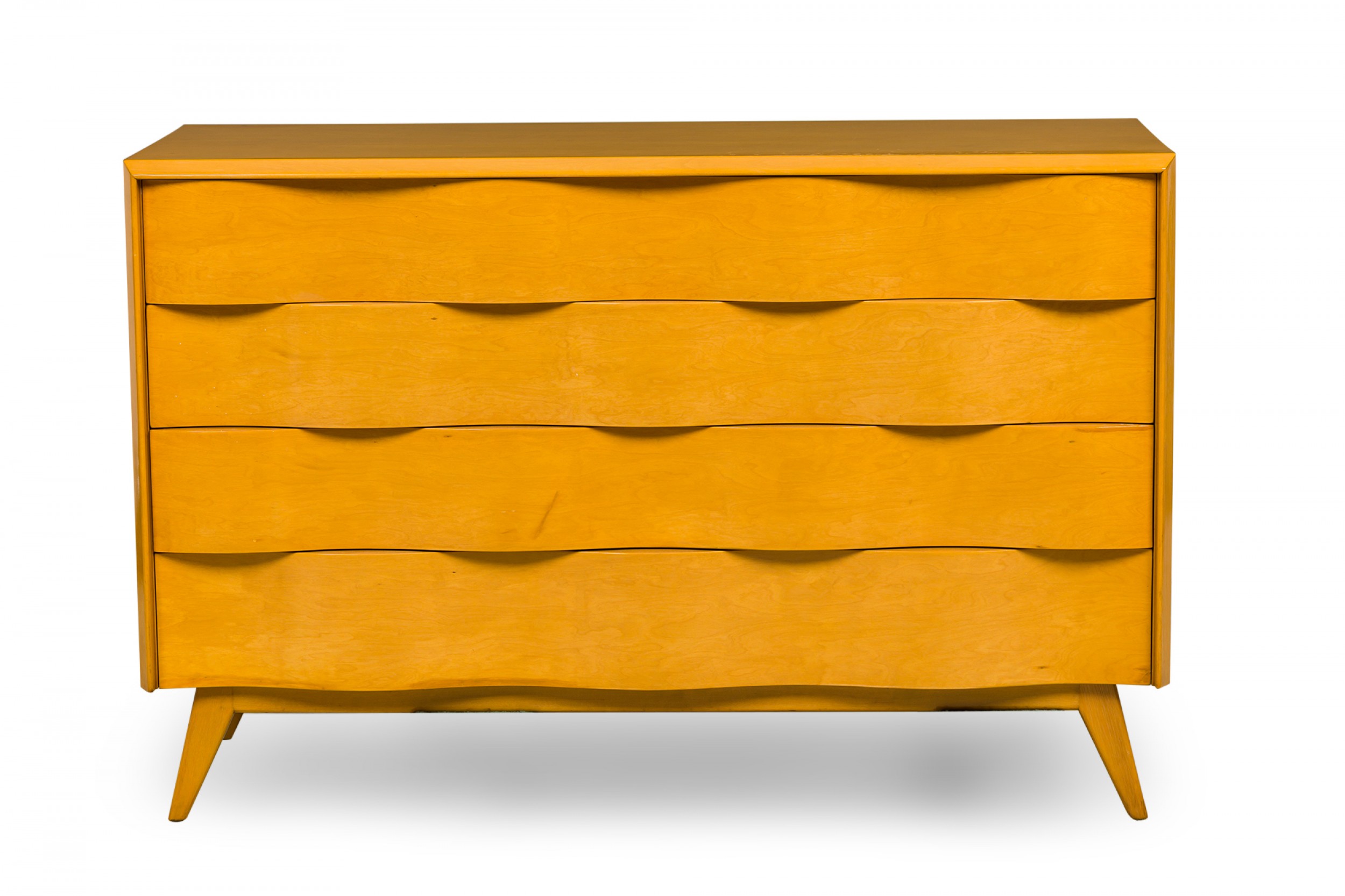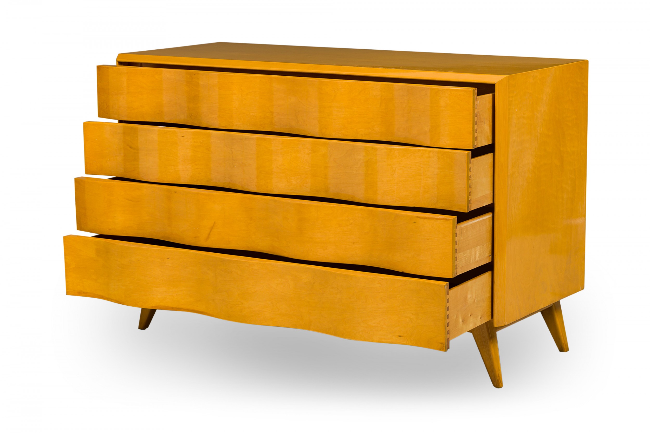 Swedish Mid-Century (1940s) burled birch rectangular chest featuring 4 undulating wavefront pullout drawers, resting on 4 short, tapered splayed legs. (EDMOND J. SPENCE).