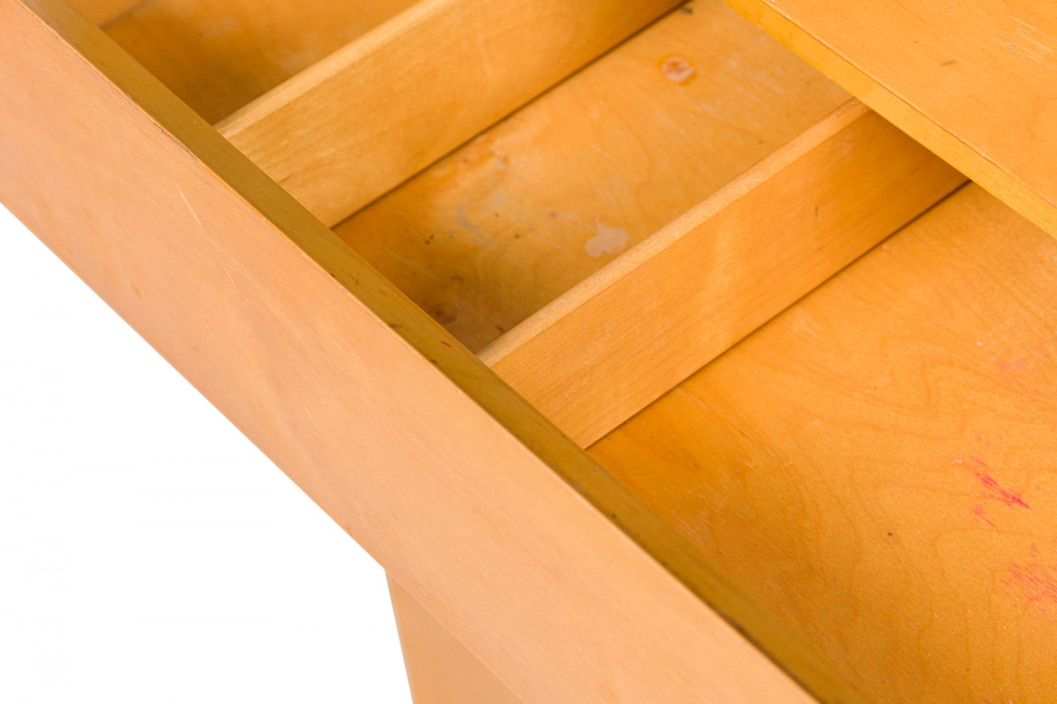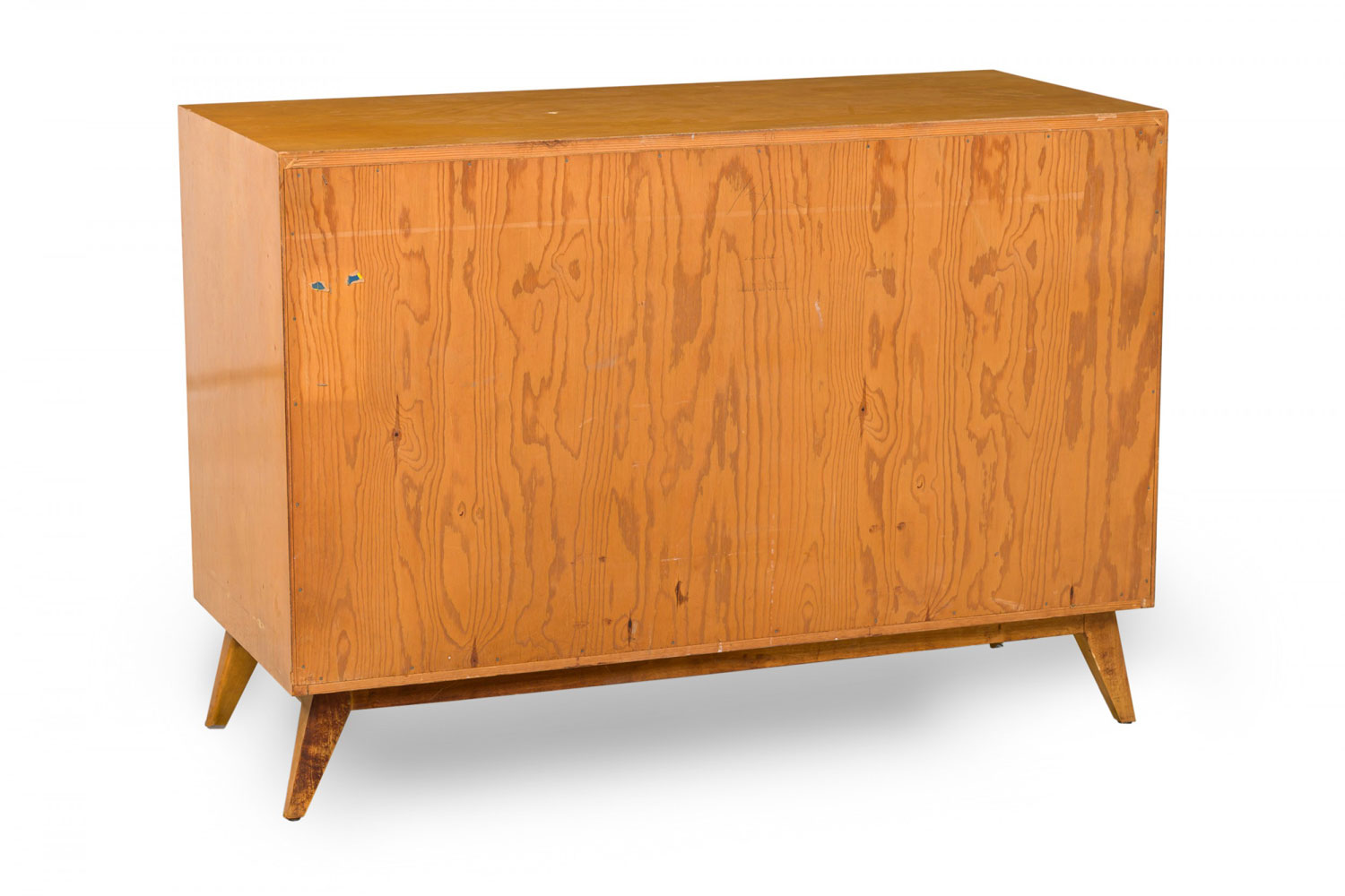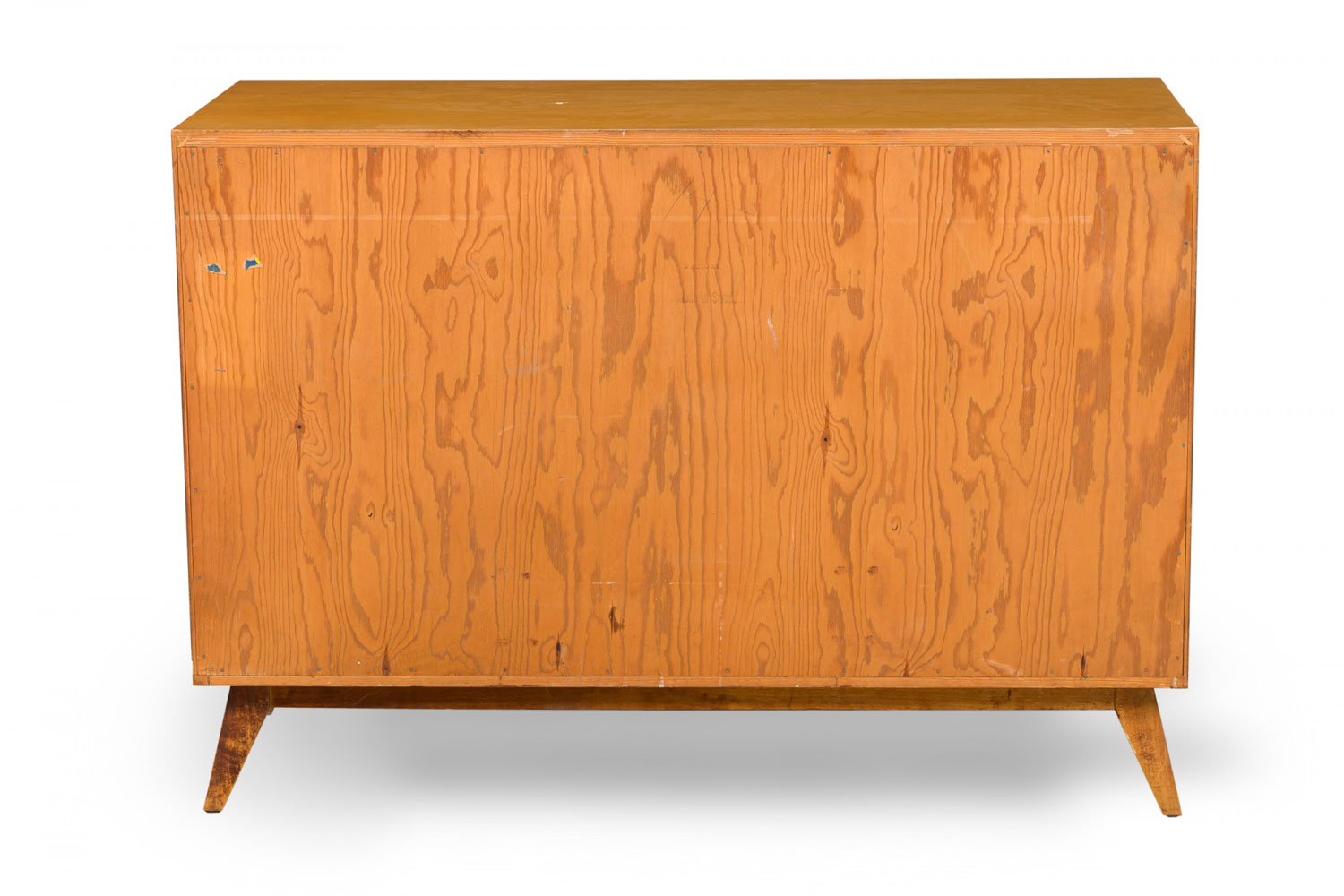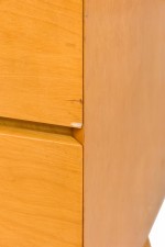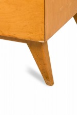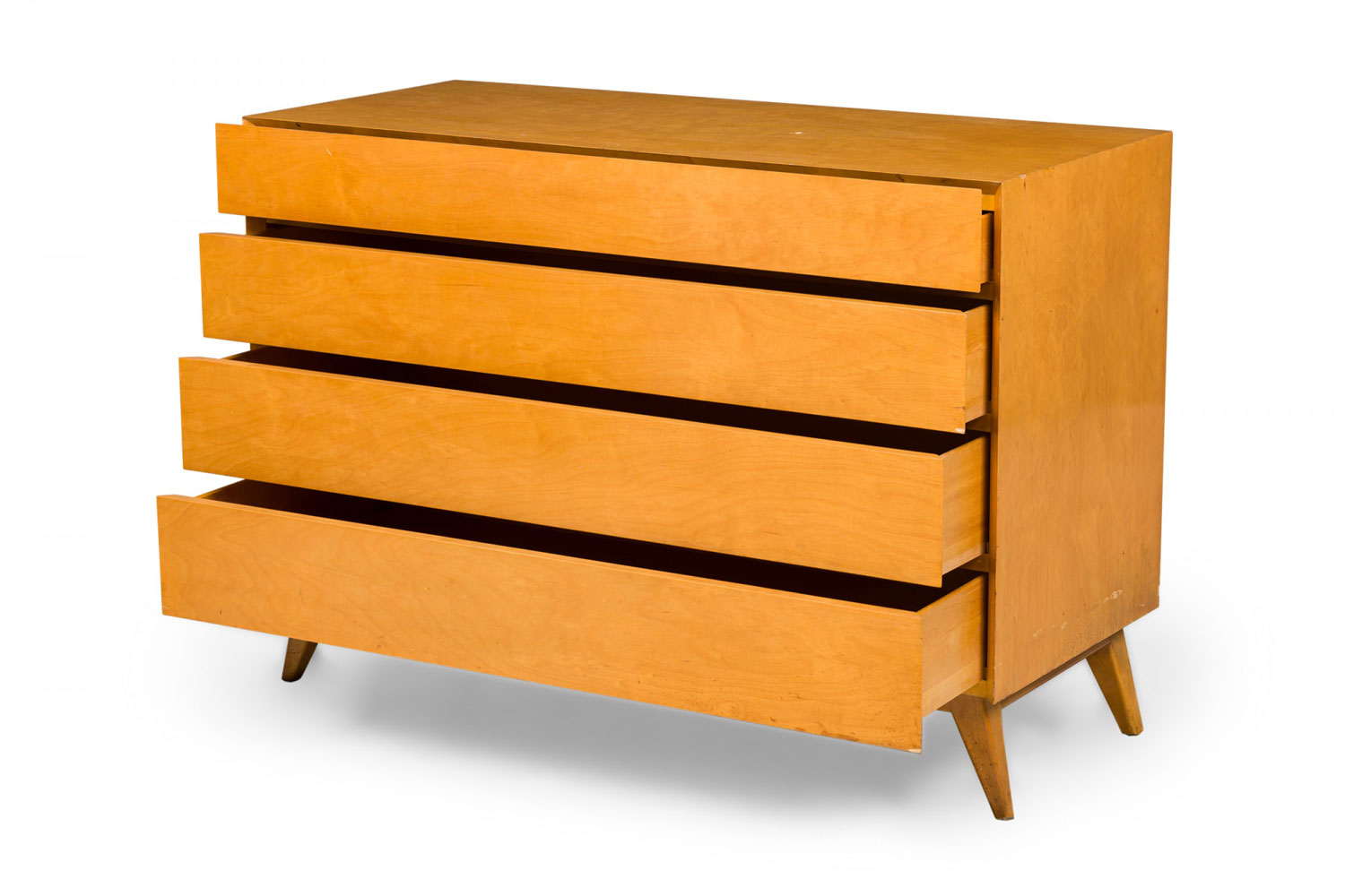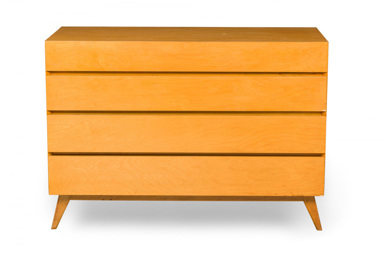 Mid-Century American 4-drawer rectangular wooden cabinet's first drawer is divided into five compartments. Each drawer is neatly aligned with an inward bevel, standing on four tapered, splayed legs. (EDMOND SPENCE)(Similar cabinet with additional top section: DUF0915A)