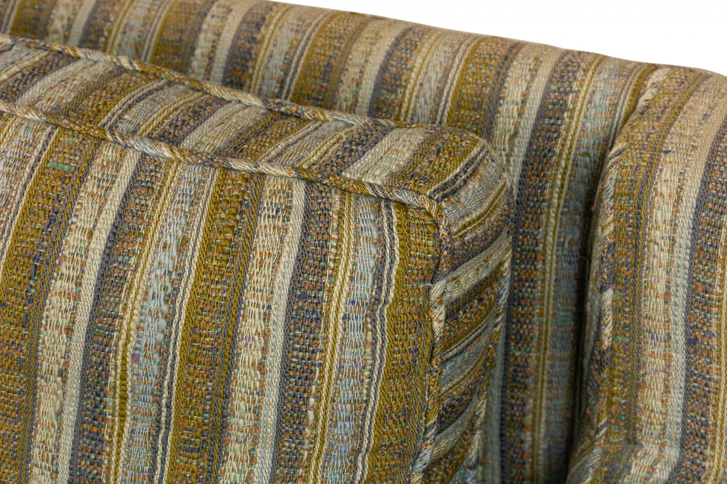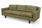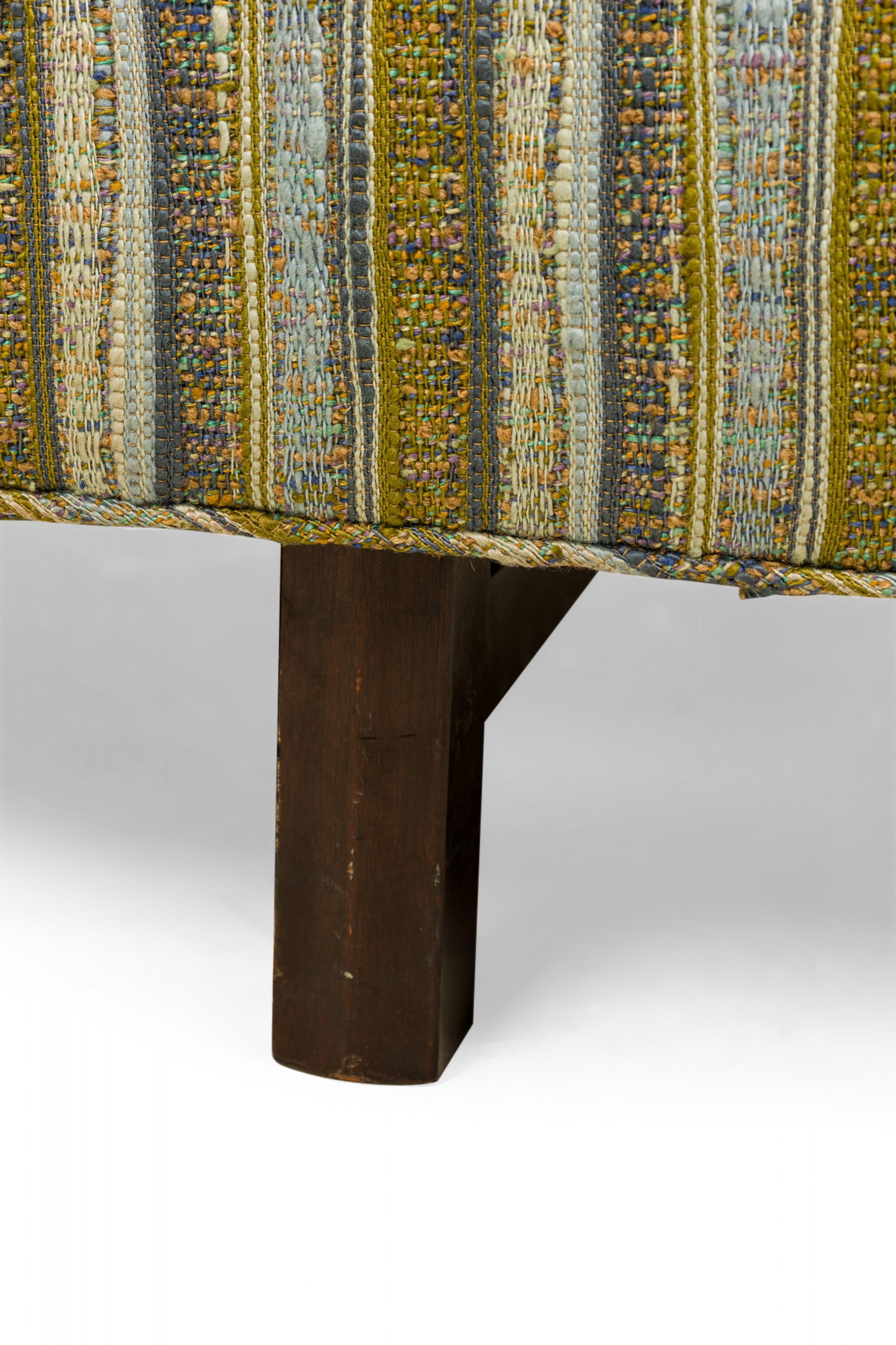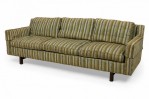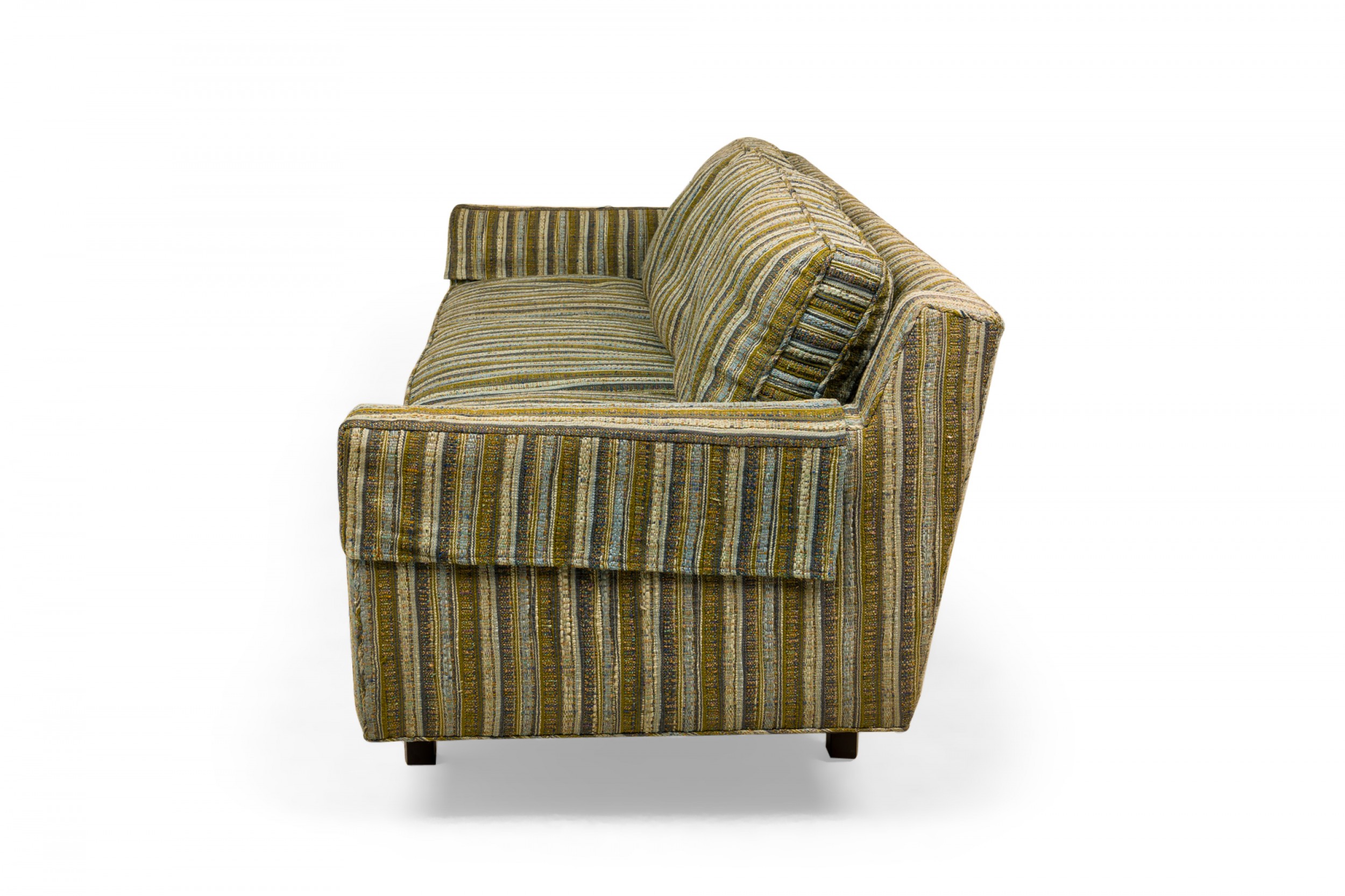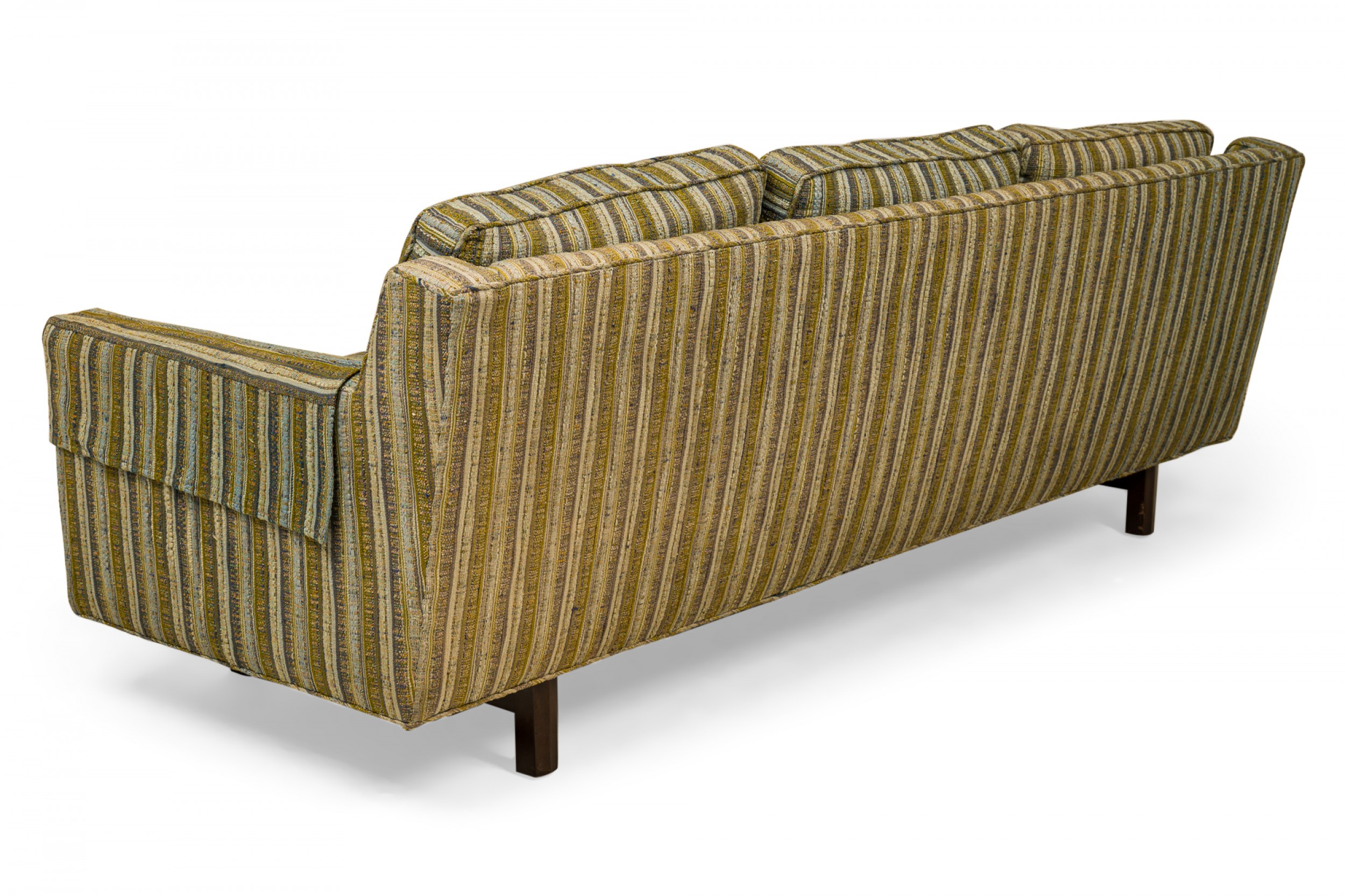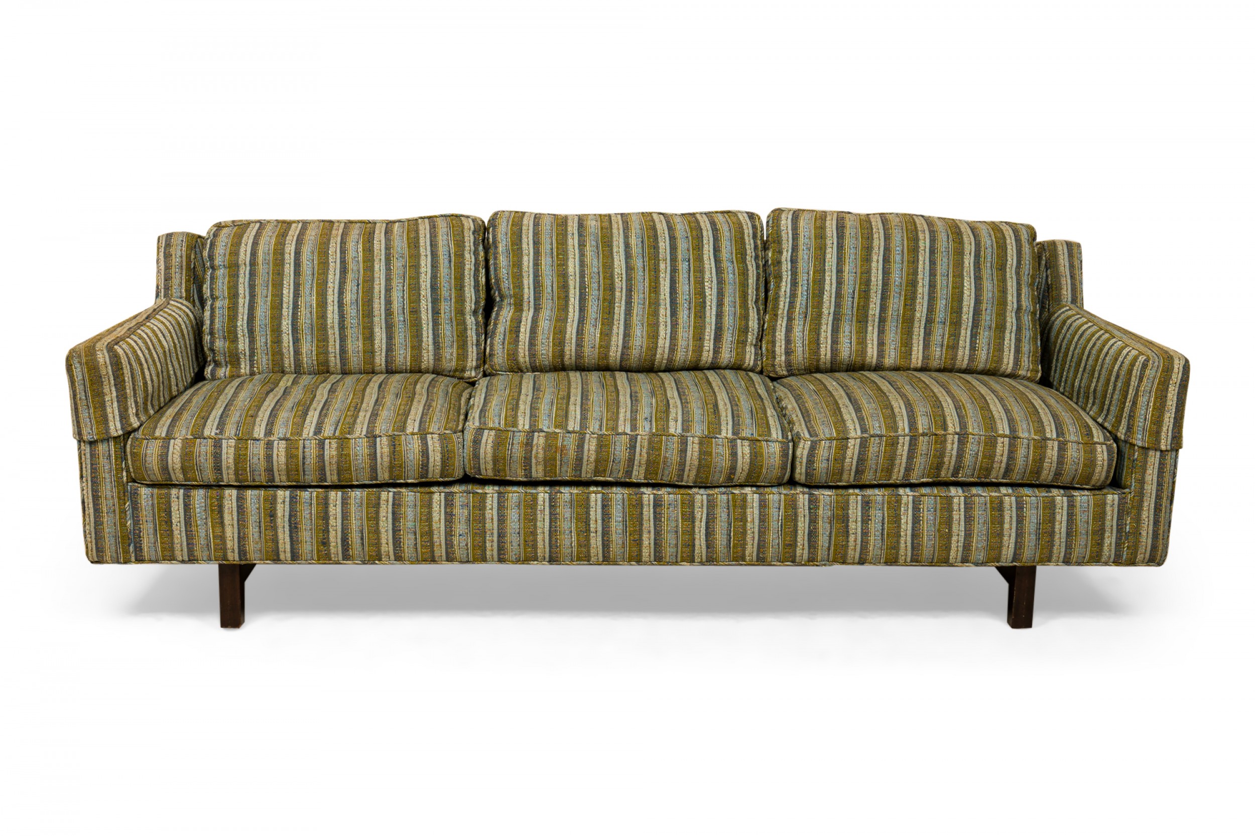 American Mid-Century 3-seat sofa with beige, light green, and brown striped upholstery with three back and three seat cushions. (EDWARD WORMLEY FOR DUNBAR FURNITURE COMPANY)