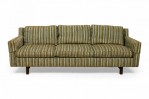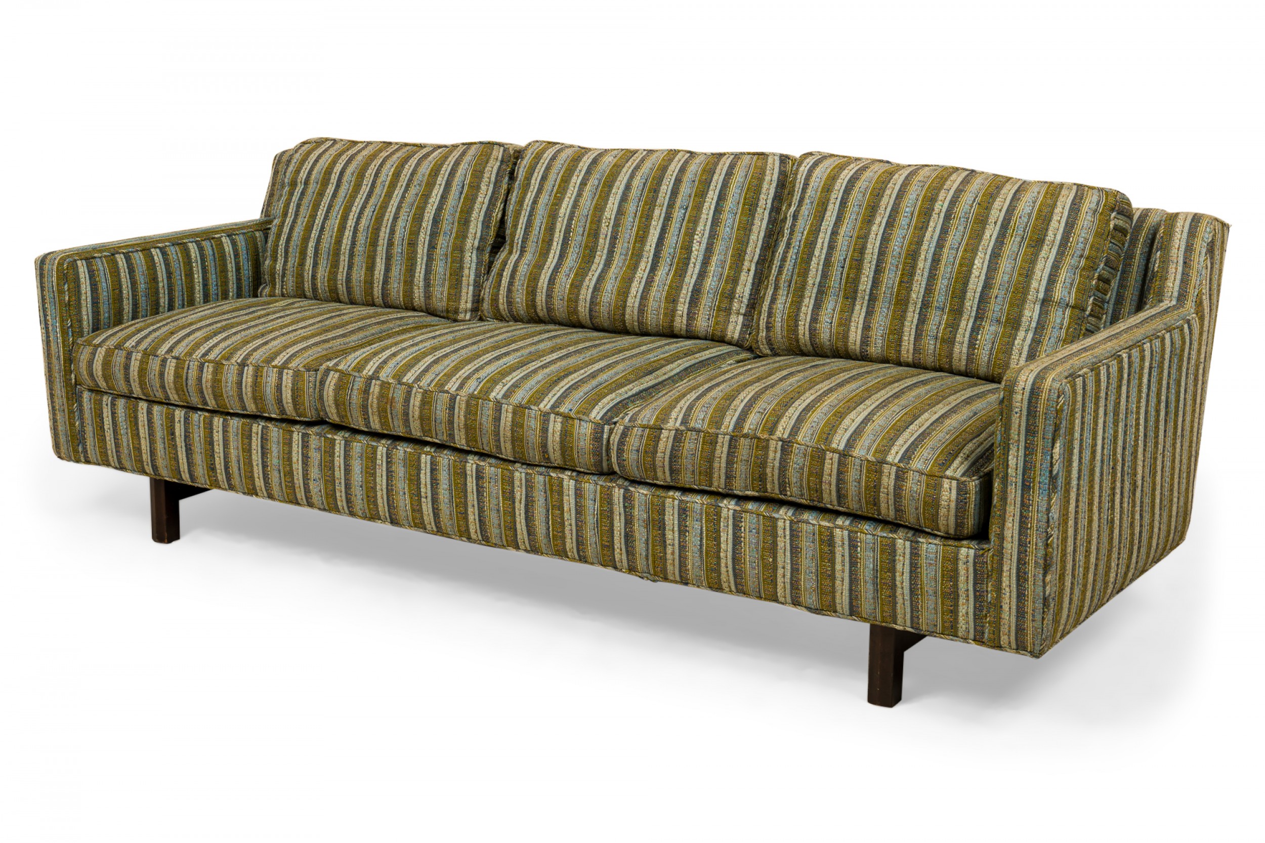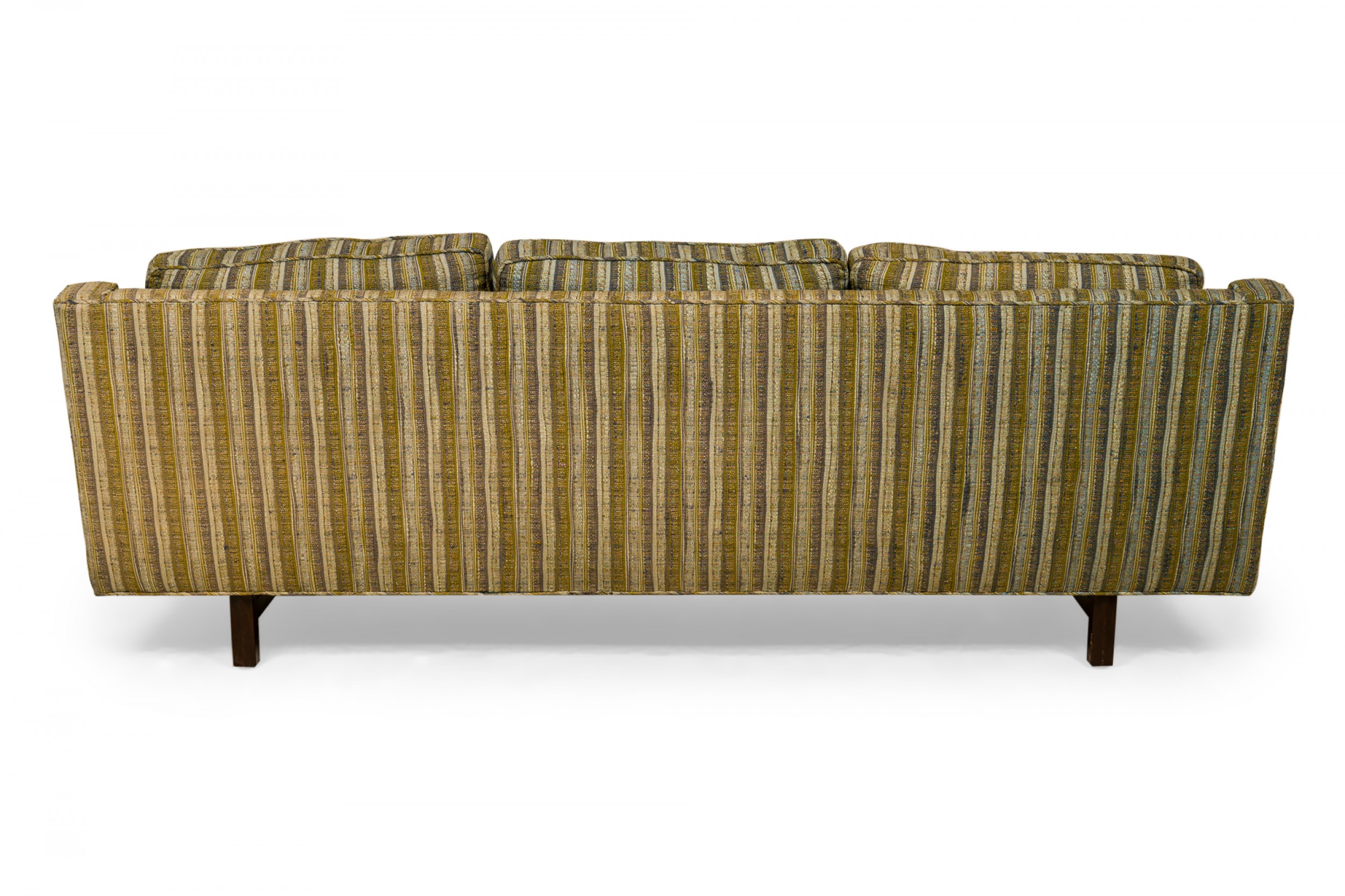 American Mid-Century 3-seat sofa with beige, light green, and brown striped upholstery with three back and three seat cushions. (EDWARD WORMLEY FOR DUNBAR FURNITURE COMPANY).