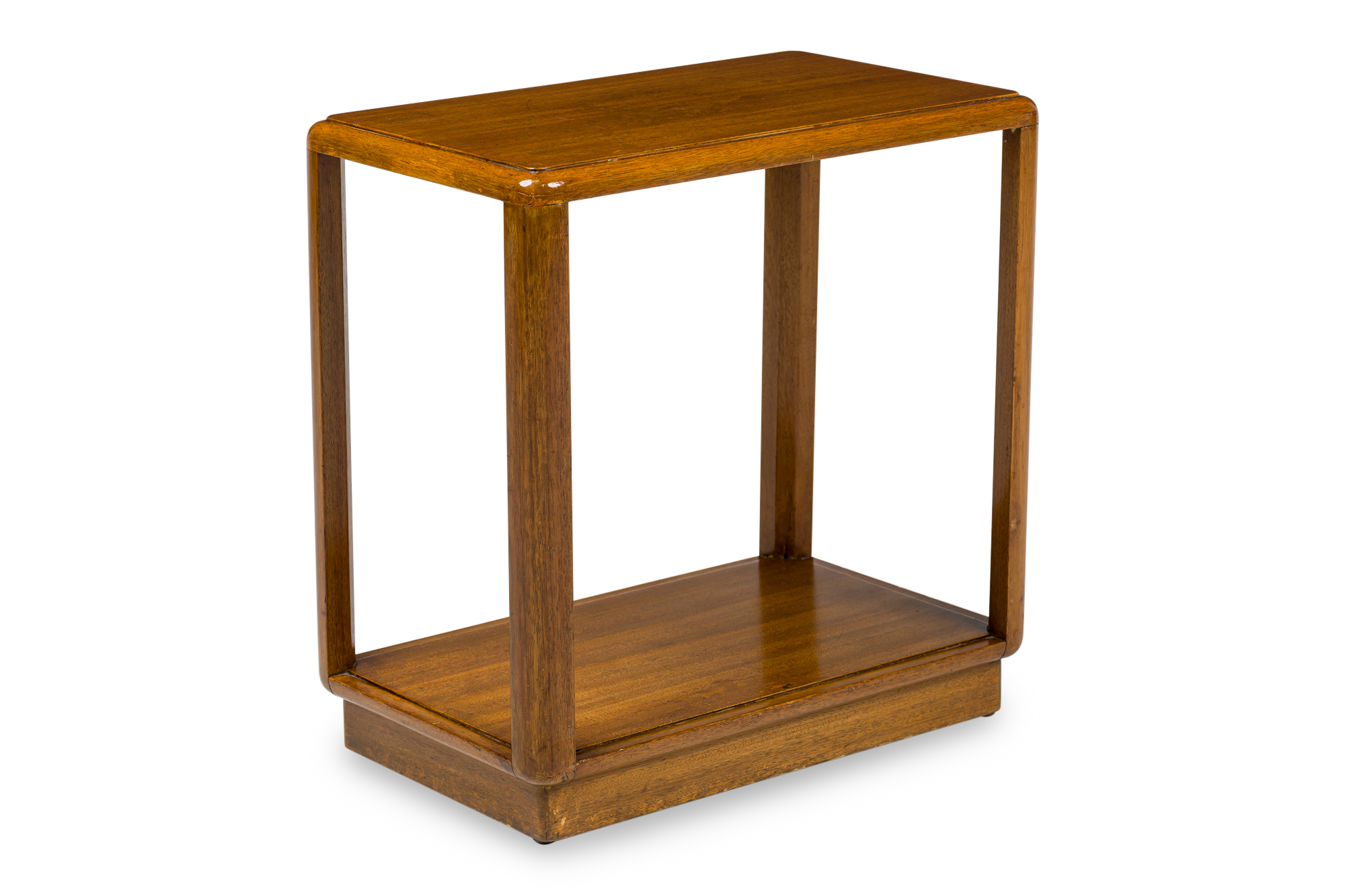 American Mid-Century blond wood end / side table with a rectangular top with rounded corners, a pedestal base, and an open frame design. (EDWARD WORMLEY FOR DUNBAR FURNITURE COMPANY)(Similar tables: DUF0752, DUF0753, DUF0754, DUF0755)