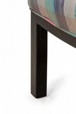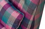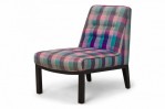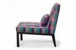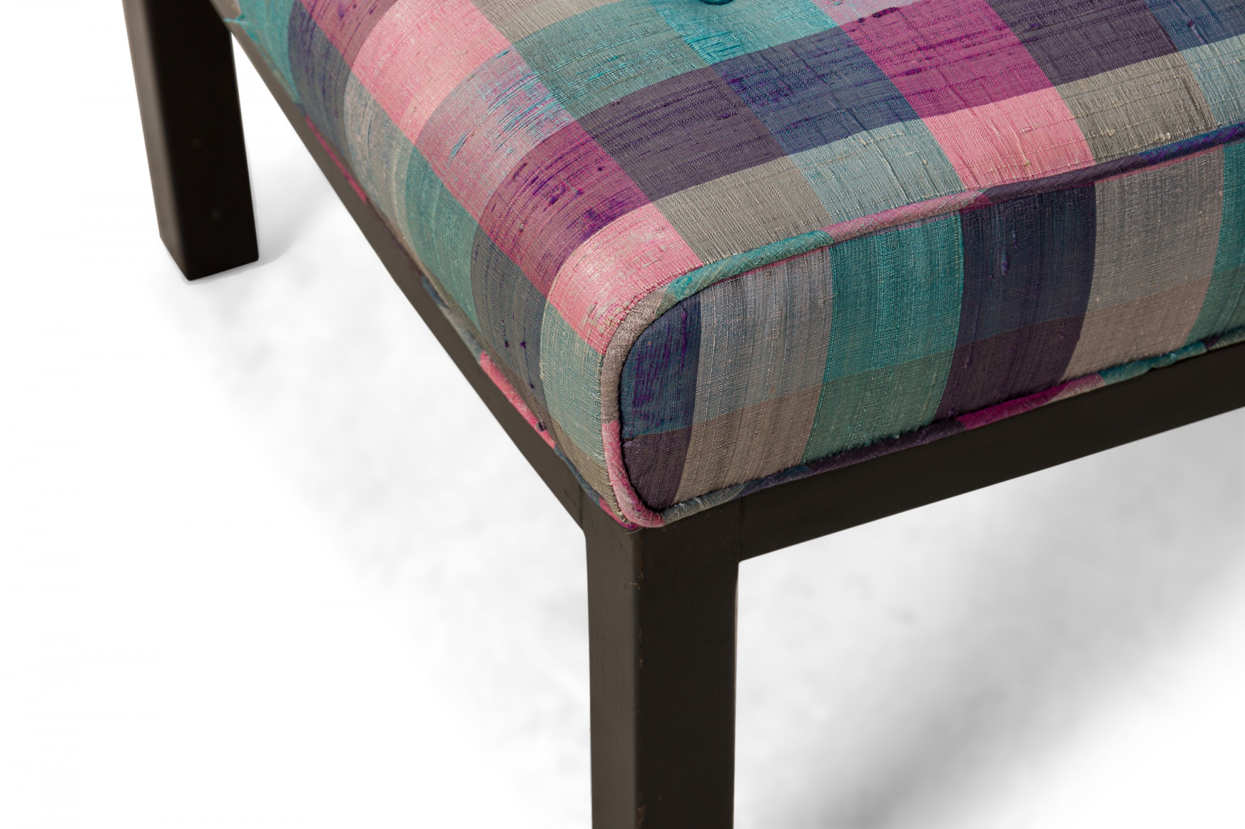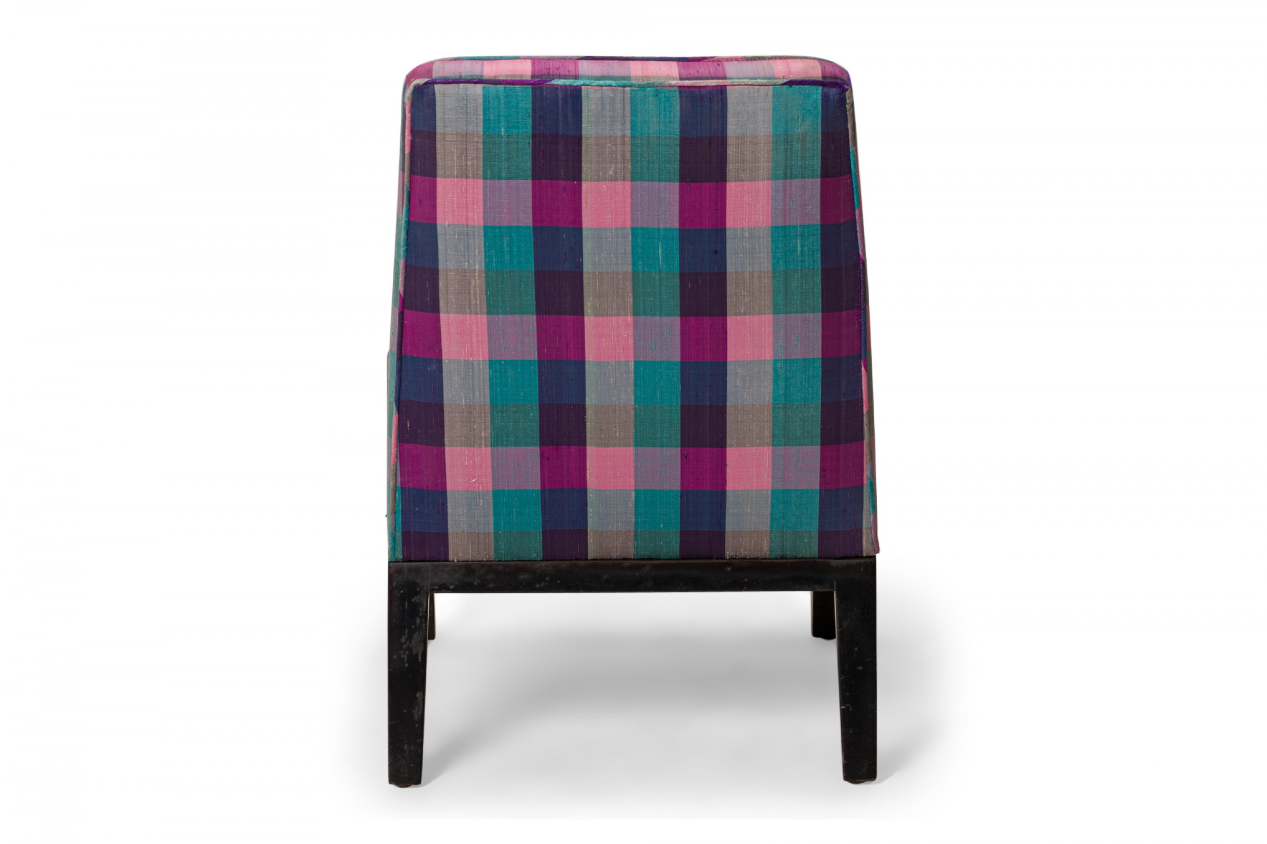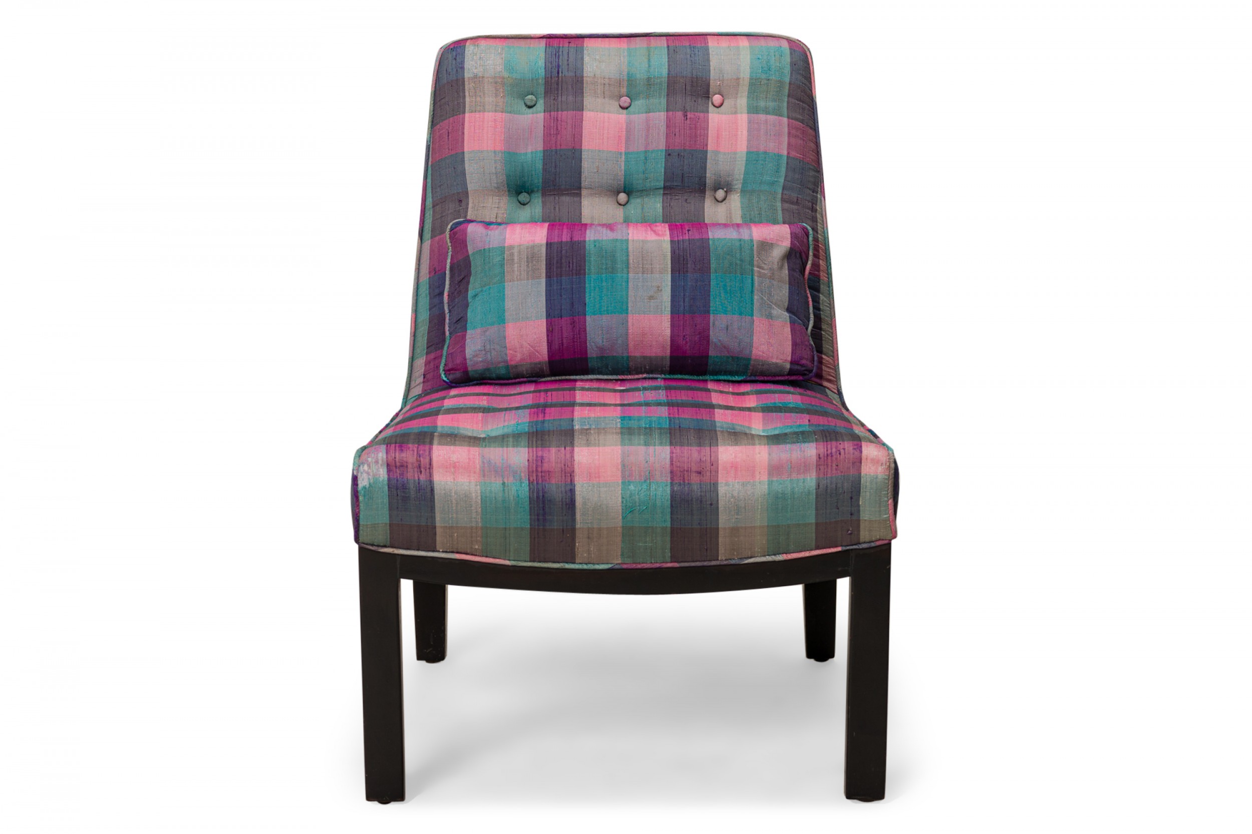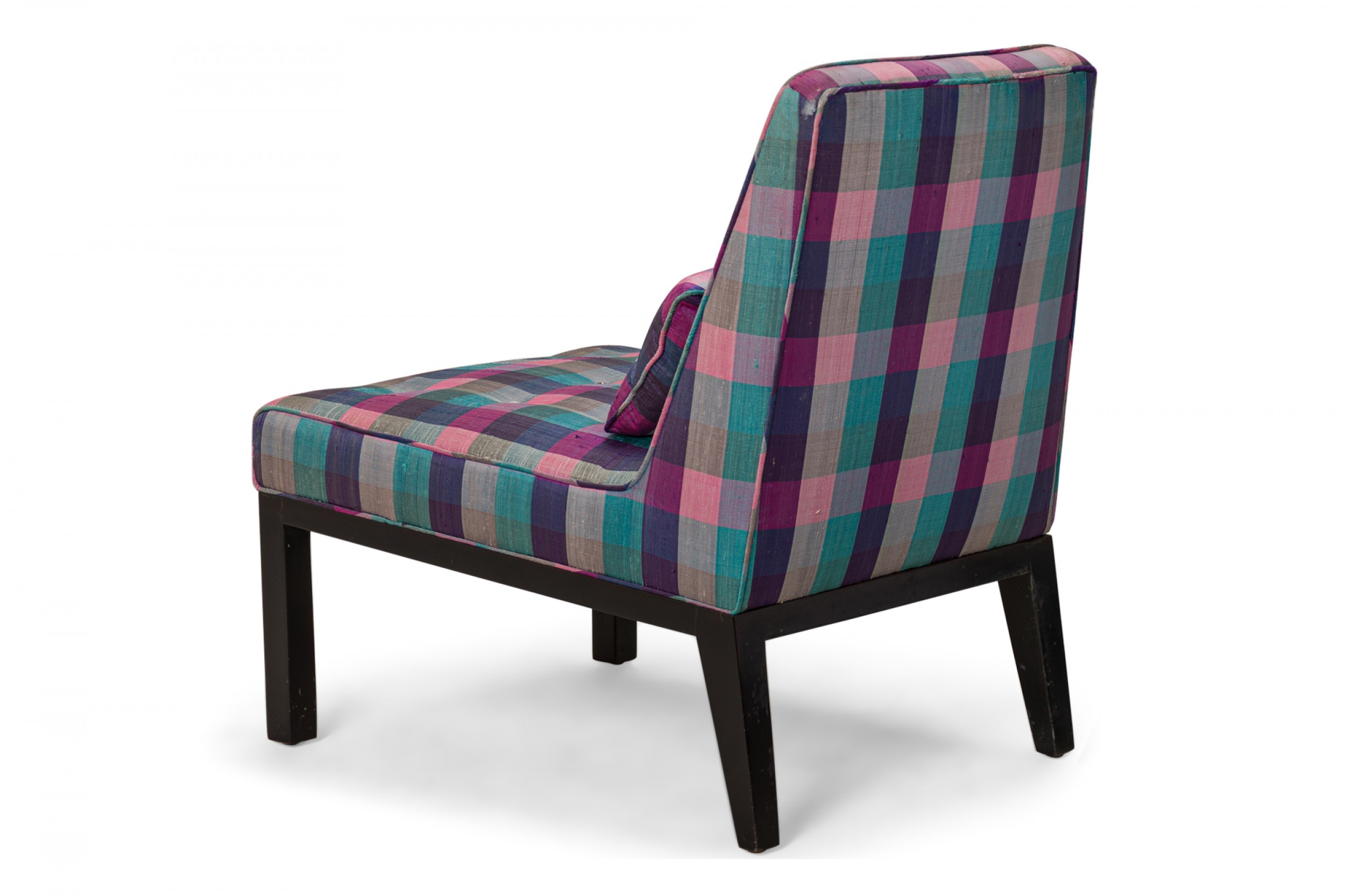American Mid-Century slipper / side chair with purple, pink, and blue plaid fabric upholstery with button tufting and a matching rectangular throw pillow, resting on four square ebonized wooden legs. (EDWARD WORMLEY FOR DUNBAR FURNITURE COMPANY)(Similar piece: DUF0542).