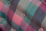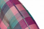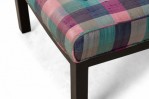 American Mid-Century slipper / side chair with purple, pink, and blue plaid fabric upholstery with button tufting and a matching rectangular throw pillow, resting on four square ebonized wooden legs. (EDWARD WORMLEY FOR DUNBAR FURNITURE COMPANY)(Similar piece: DUF0542)