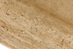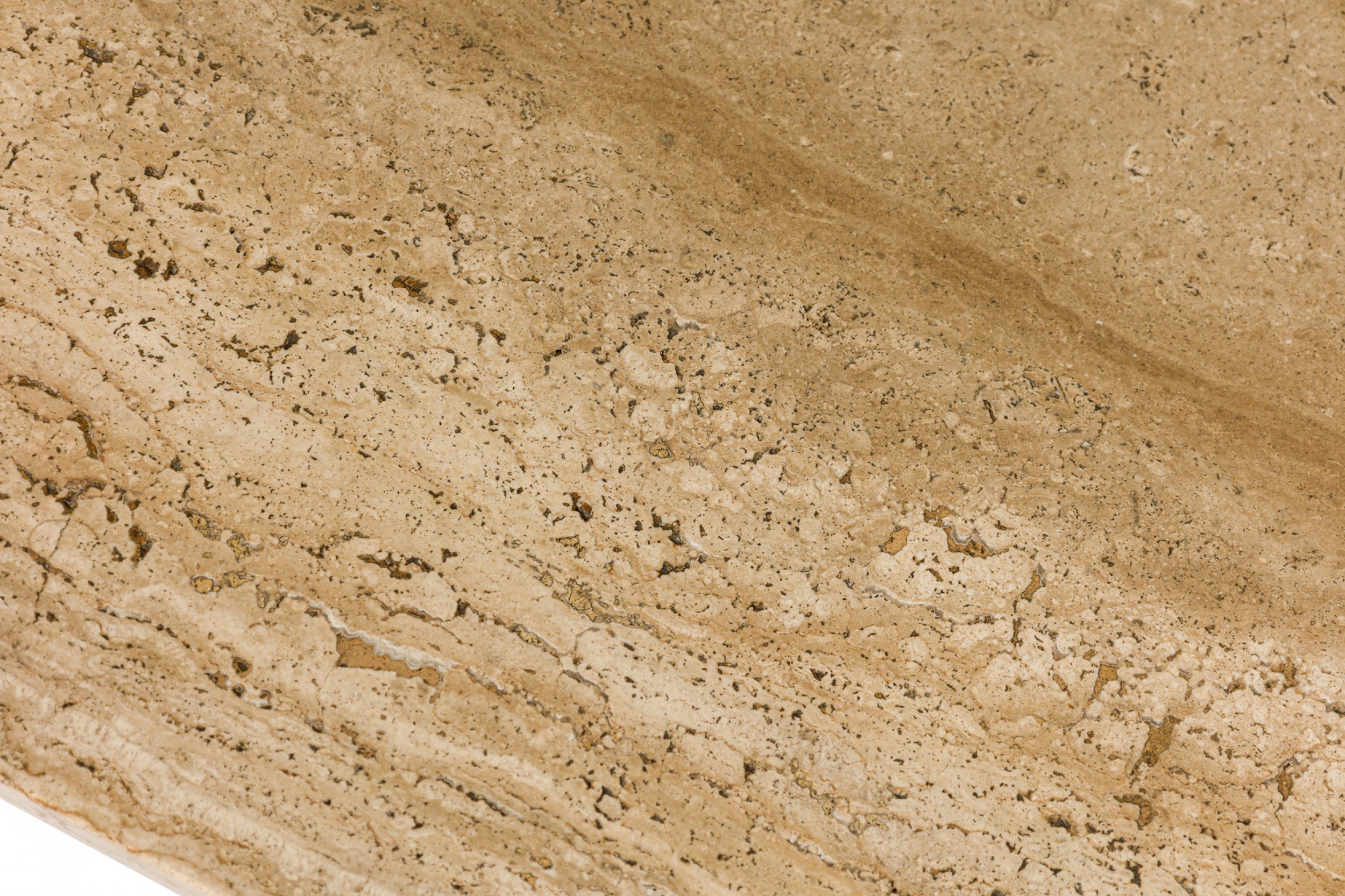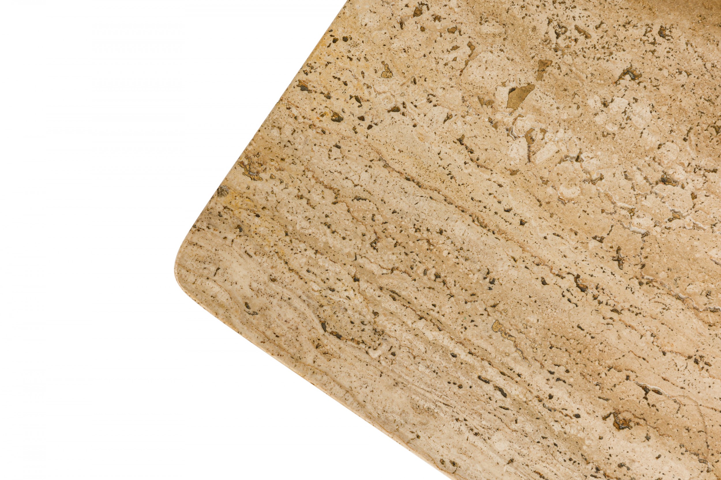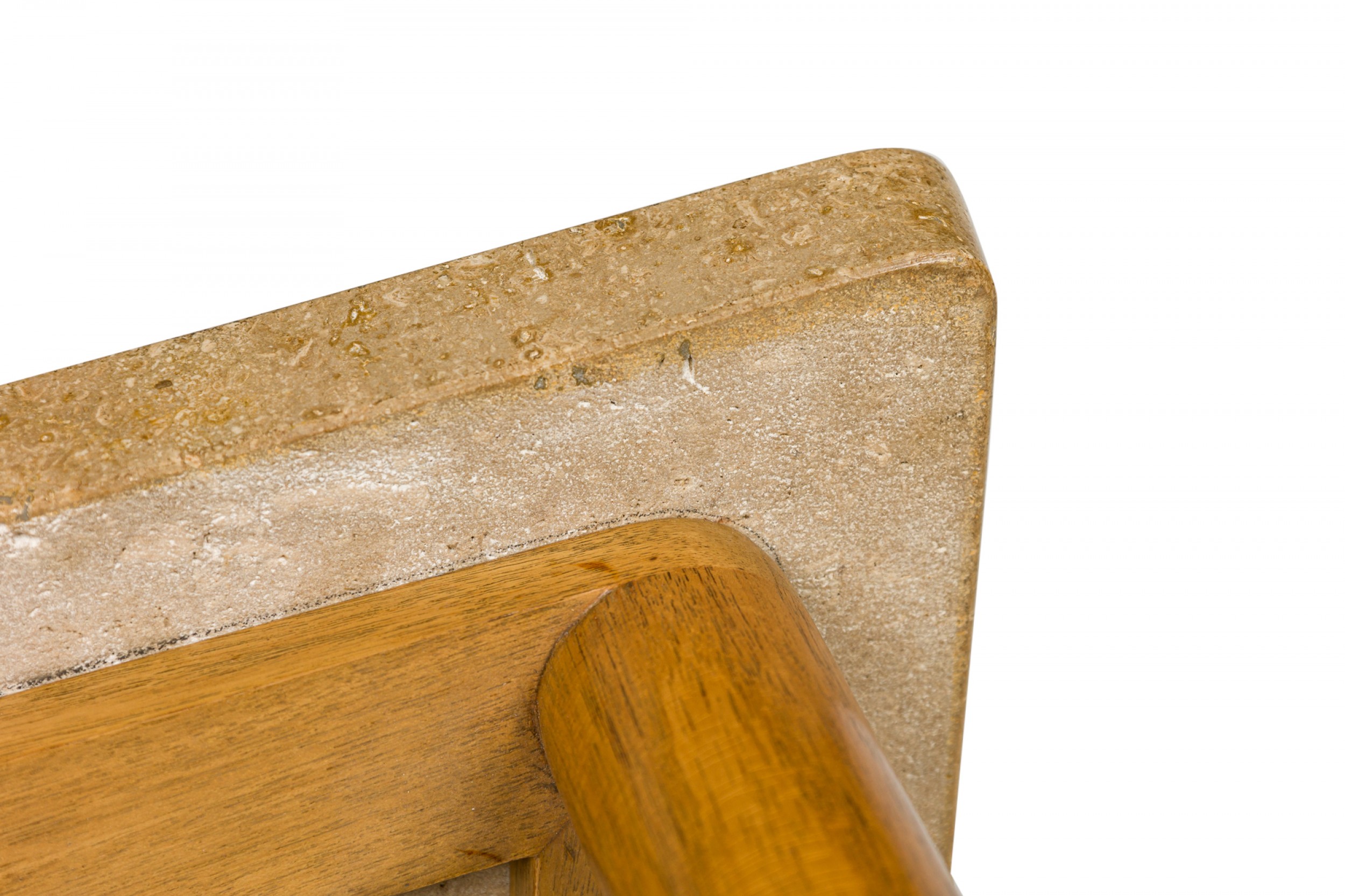 Style: Mid-Century Materials & Techniques: Leather, travertine, wood Category: Tables Condition: Some staining to leather feet. Good; Wear consistent with age and use