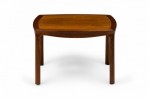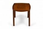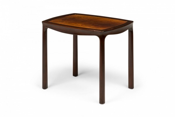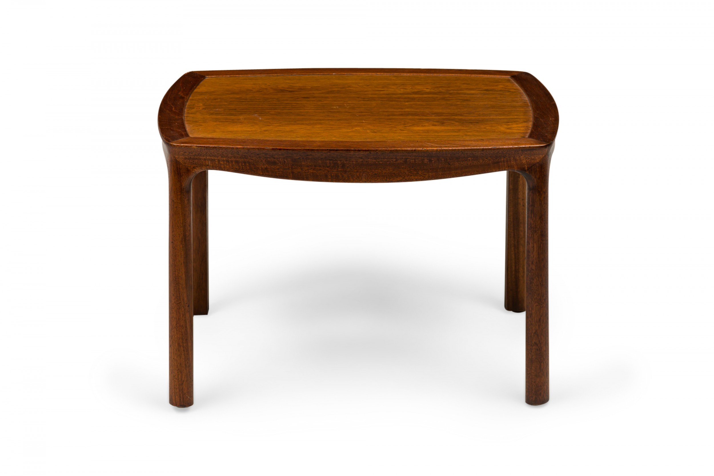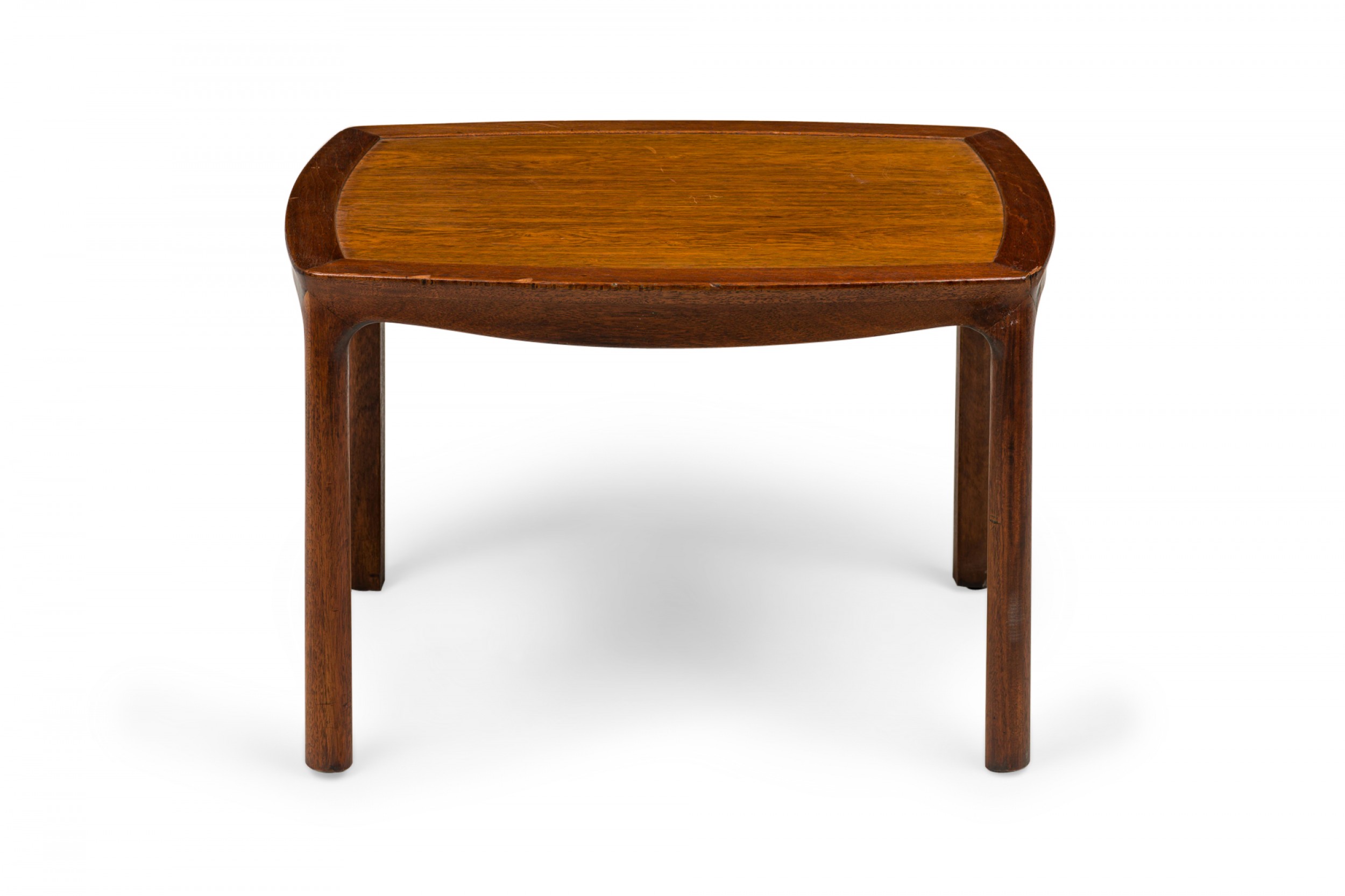 American Mid-Century low end / side table with a slightly rounded rectangular top with a lighter stained wooden inset top supported by a darker wooden frame with a shaped apron with four rounded legs. (EDWARD WORMLEY FOR DUNBAR FURNITURE COMPANY)(Similar table: DUF0713).