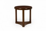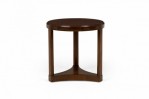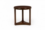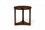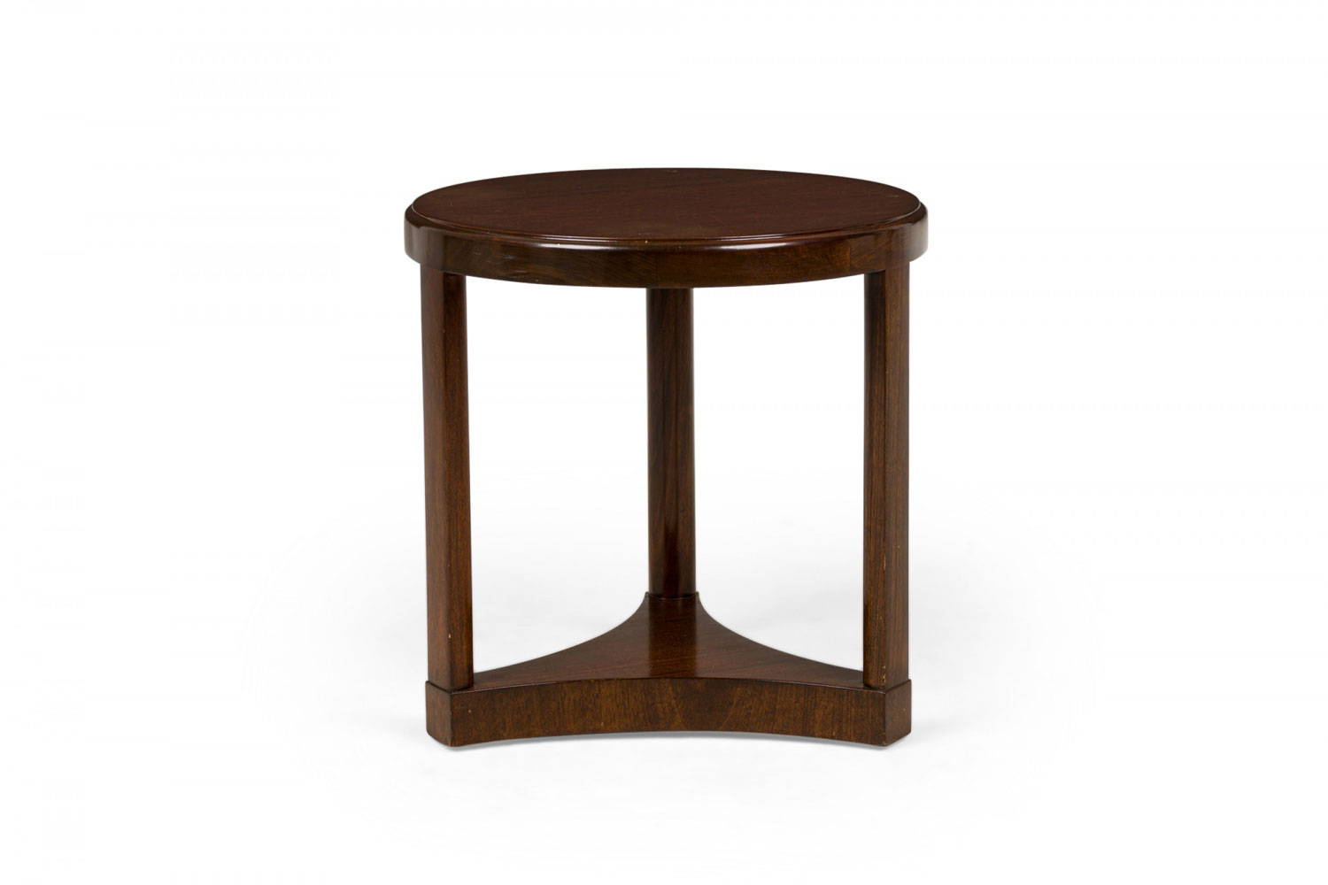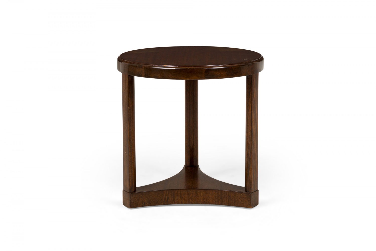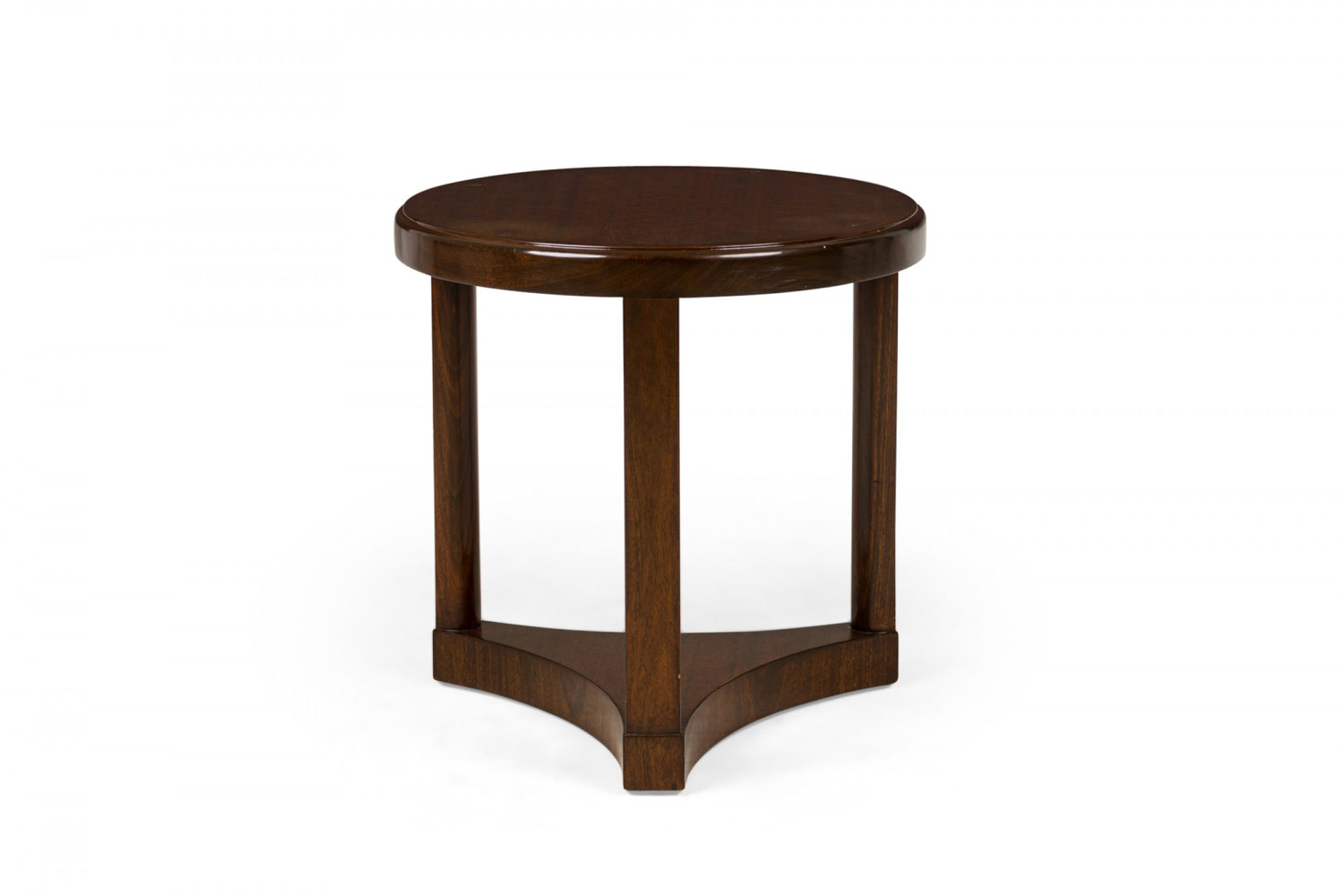 Mid-Century American wood circular end / side table with beveled top, standing on three legs united by a concave triangular base. (EDWARD WORMLEY FOR DUNBAR FURNITURE COMPANY).