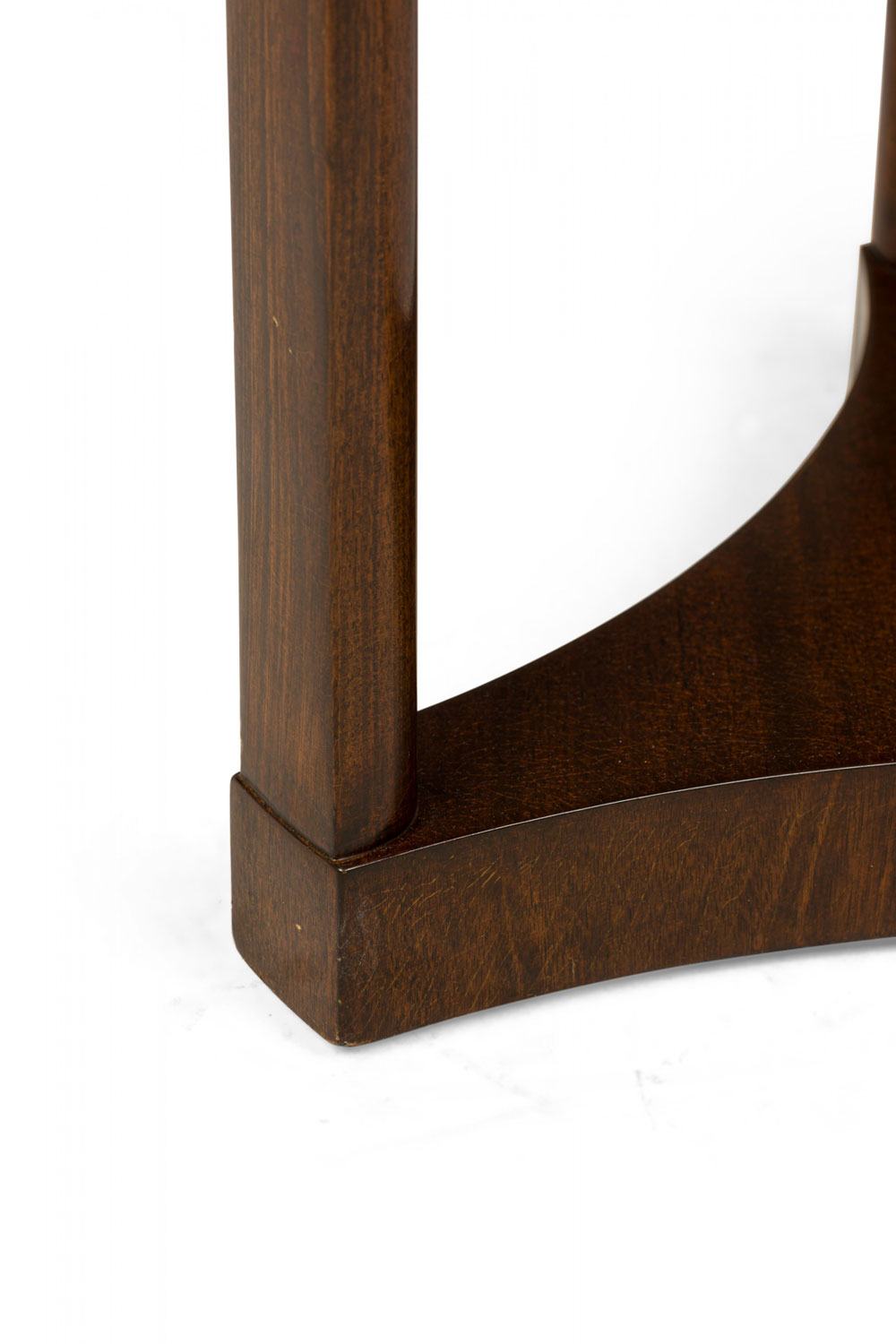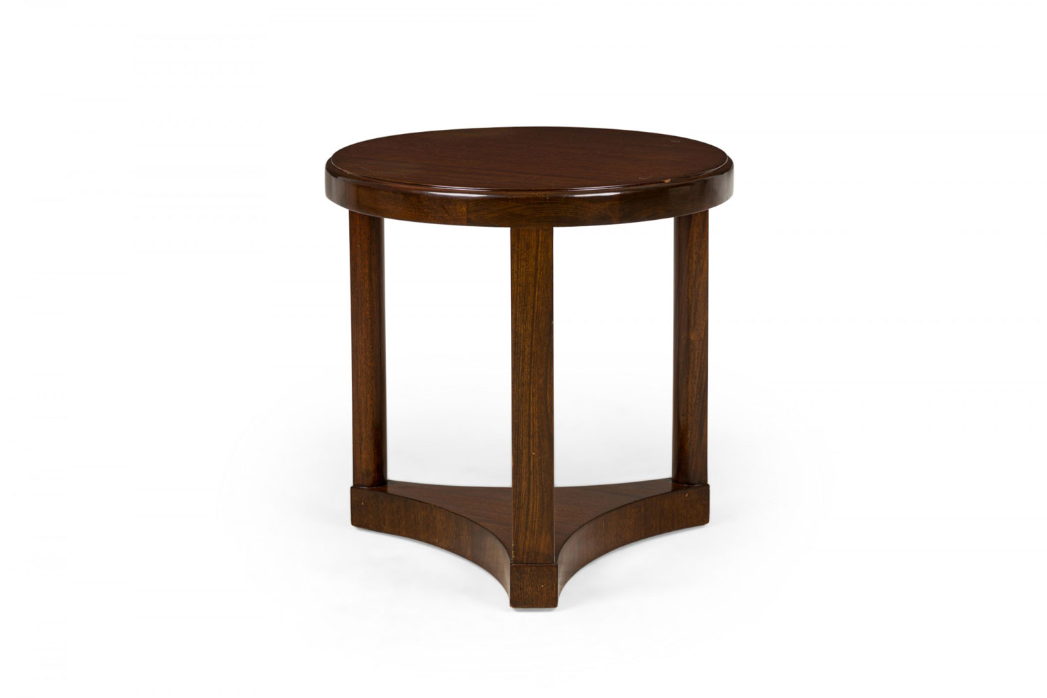 Mid-Century American wood circular end / side table with beveled top, standing on three legs united by a concave triangular base. (EDWARD WORMLEY FOR DUNBAR FURNITURE COMPANY)