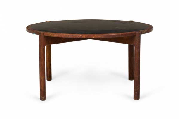 Style: Mid-Century Materials & Techniques: Enamel, metal, painted, wood Category: Tables Condition: Corrosion on metal base Good; Wear consistent with age and use
