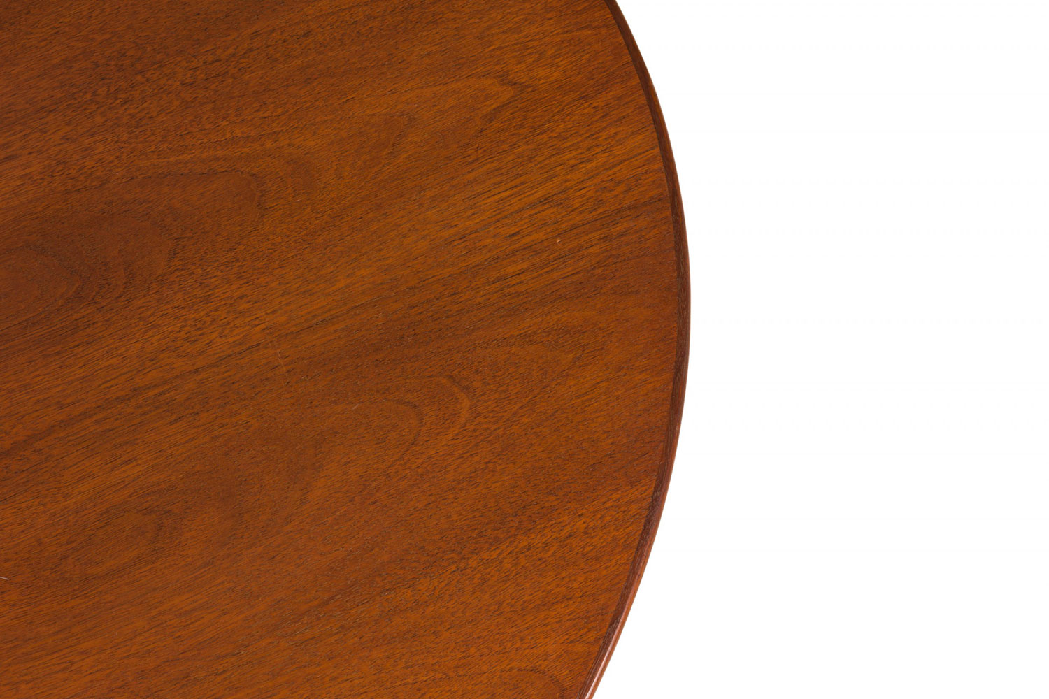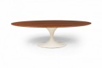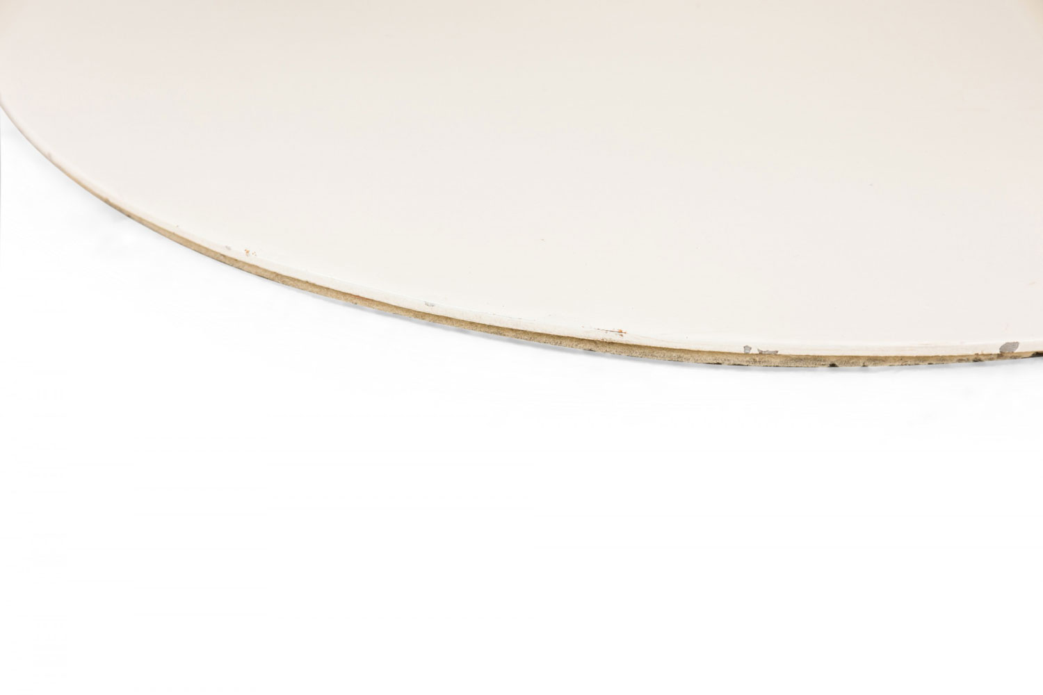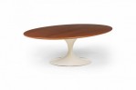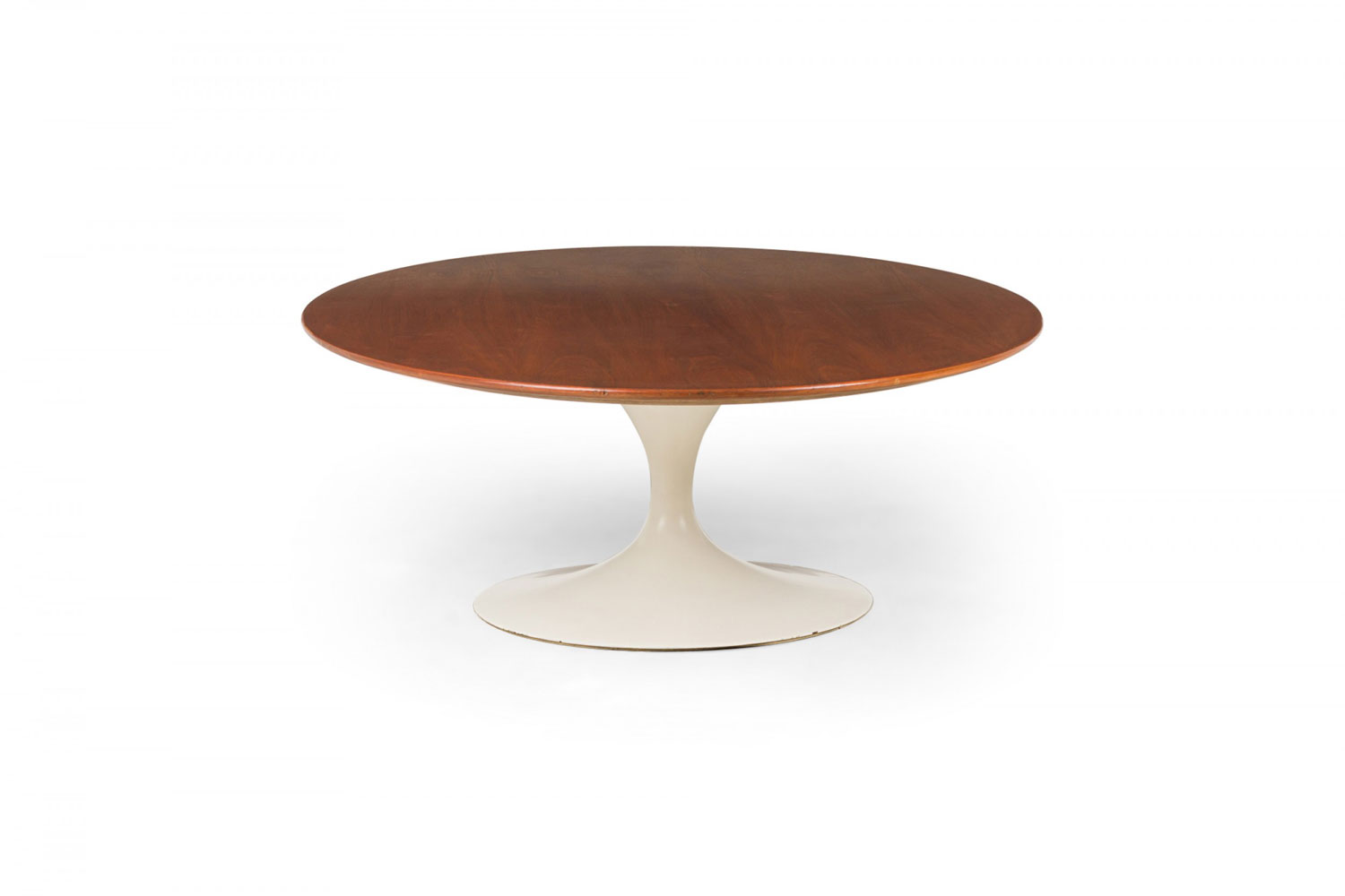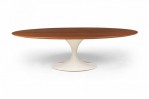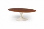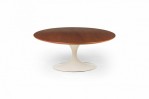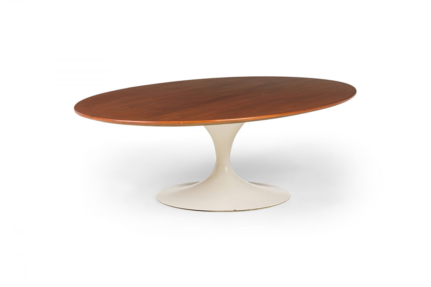 Mid-Century (Late 1950s) Finnish "Tulip" wooden oval coffee table top supported by a white enameled circular metal base. (EERO SAARINEN FOR KNOLL INTERNATIONAL)