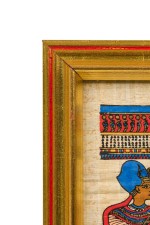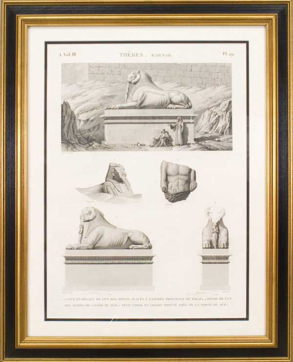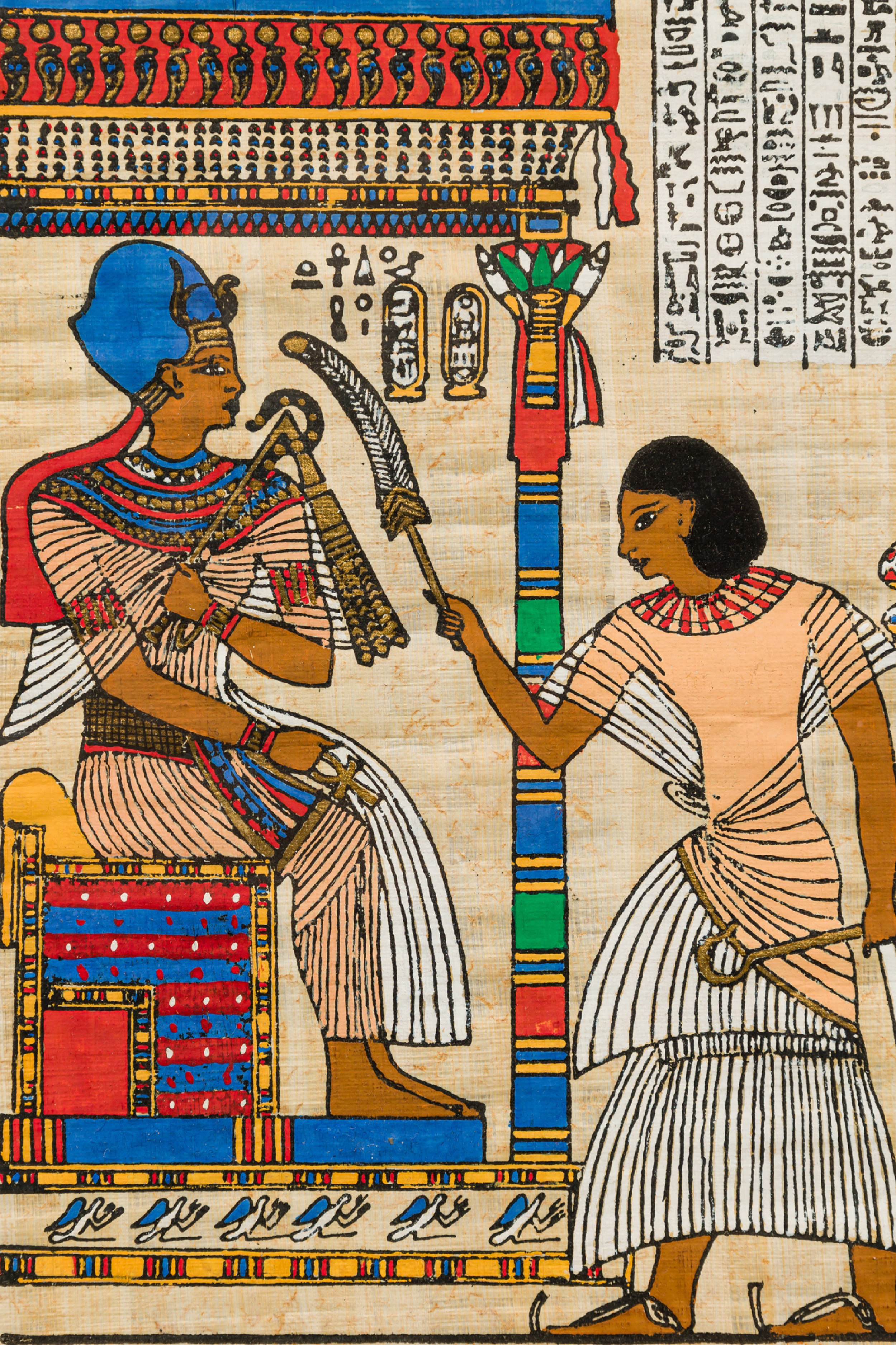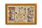 Egyptian (Mid-Century) print of people serving a pharaoh with hieroglyphs and vases with tops resembling animal heads in gold and red trim frame.