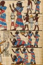 Egyptian (Mid-Century) print of people serving a pharaoh with hieroglyphs and vases with tops resembling animal heads in gold and red trim frame