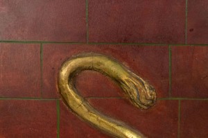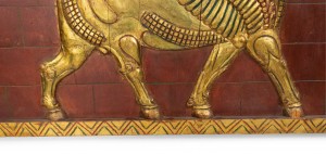 Egyptian style (20th Century) painted red and gold wall plaque with winged bull..