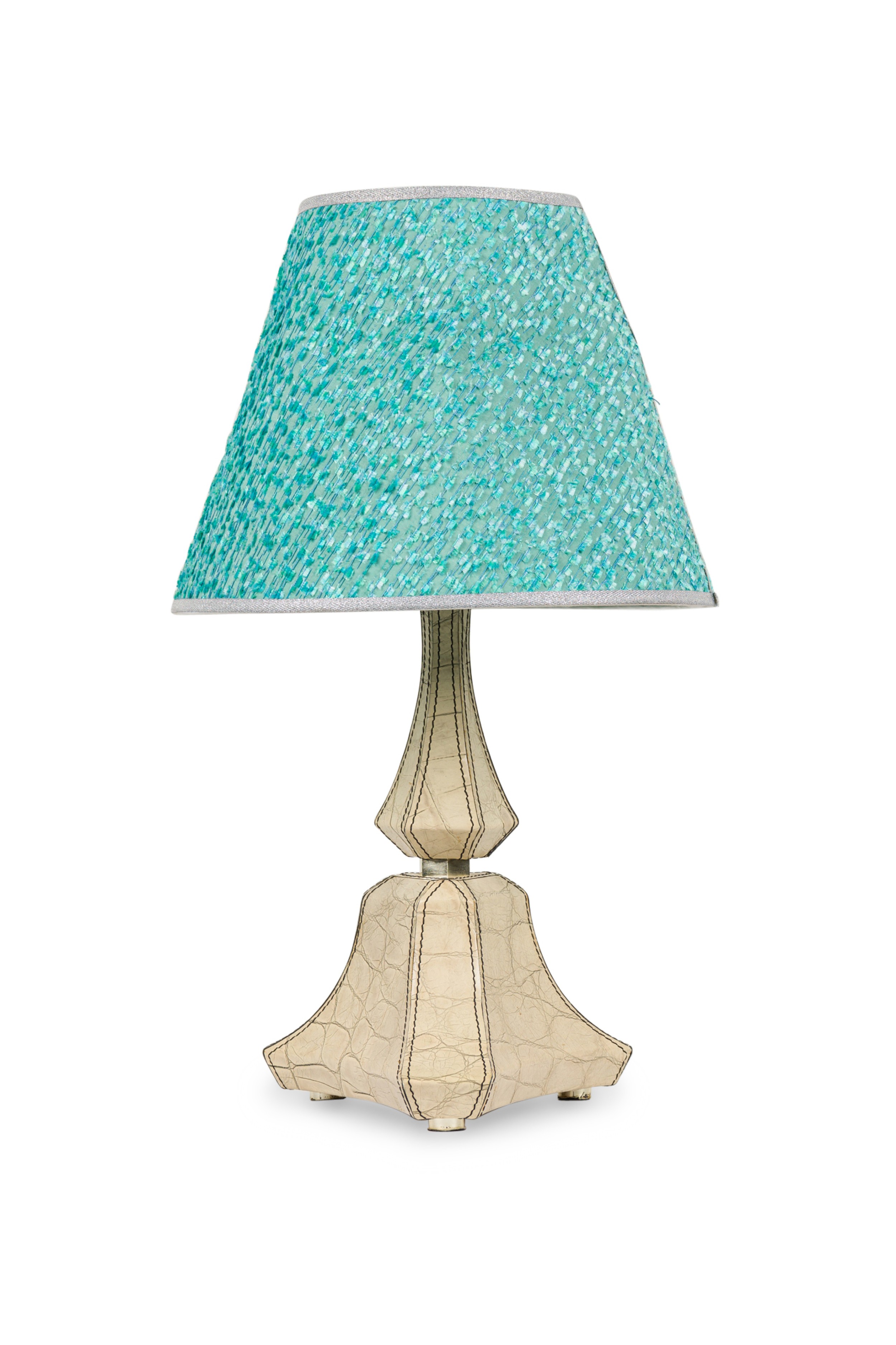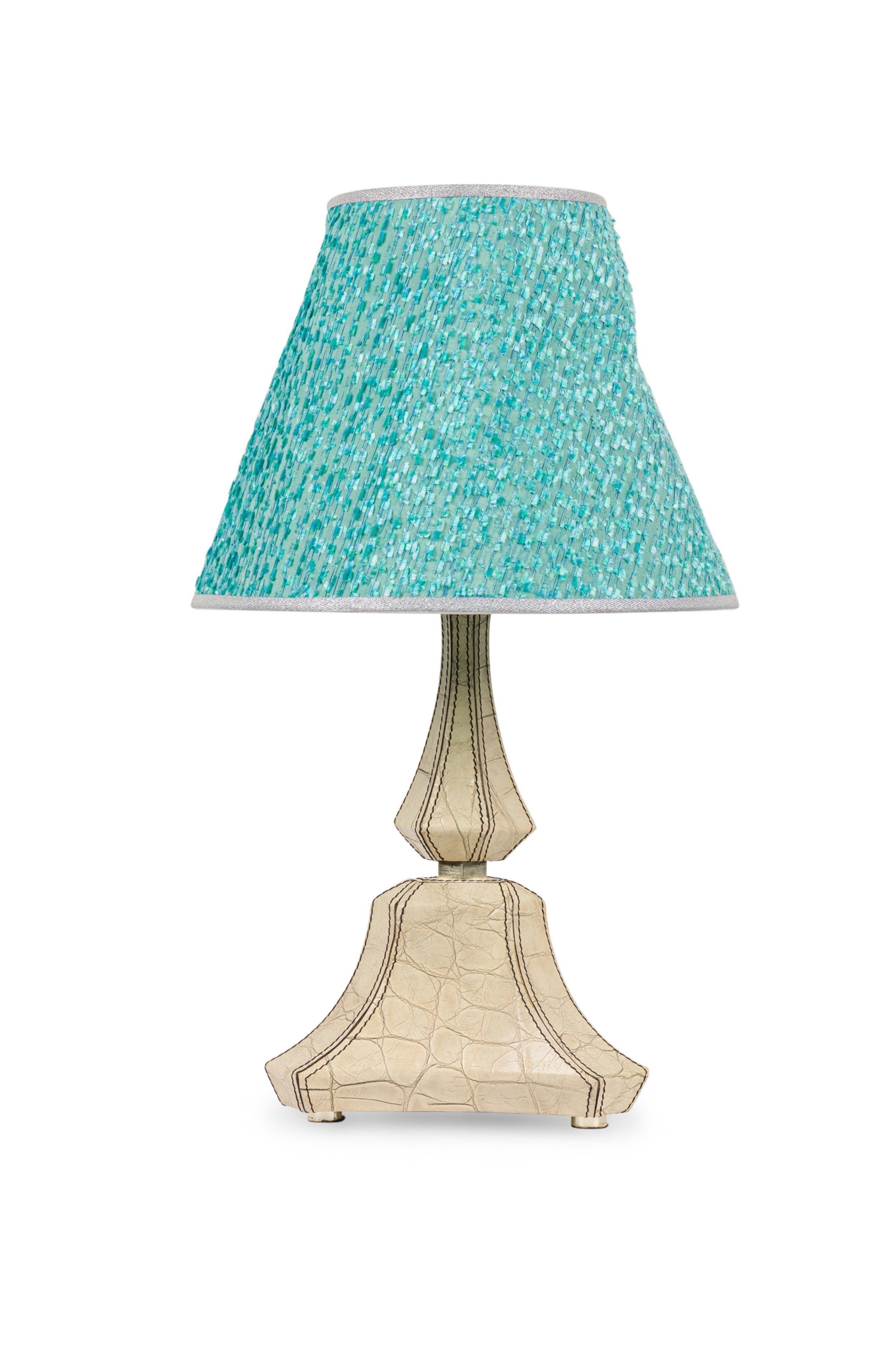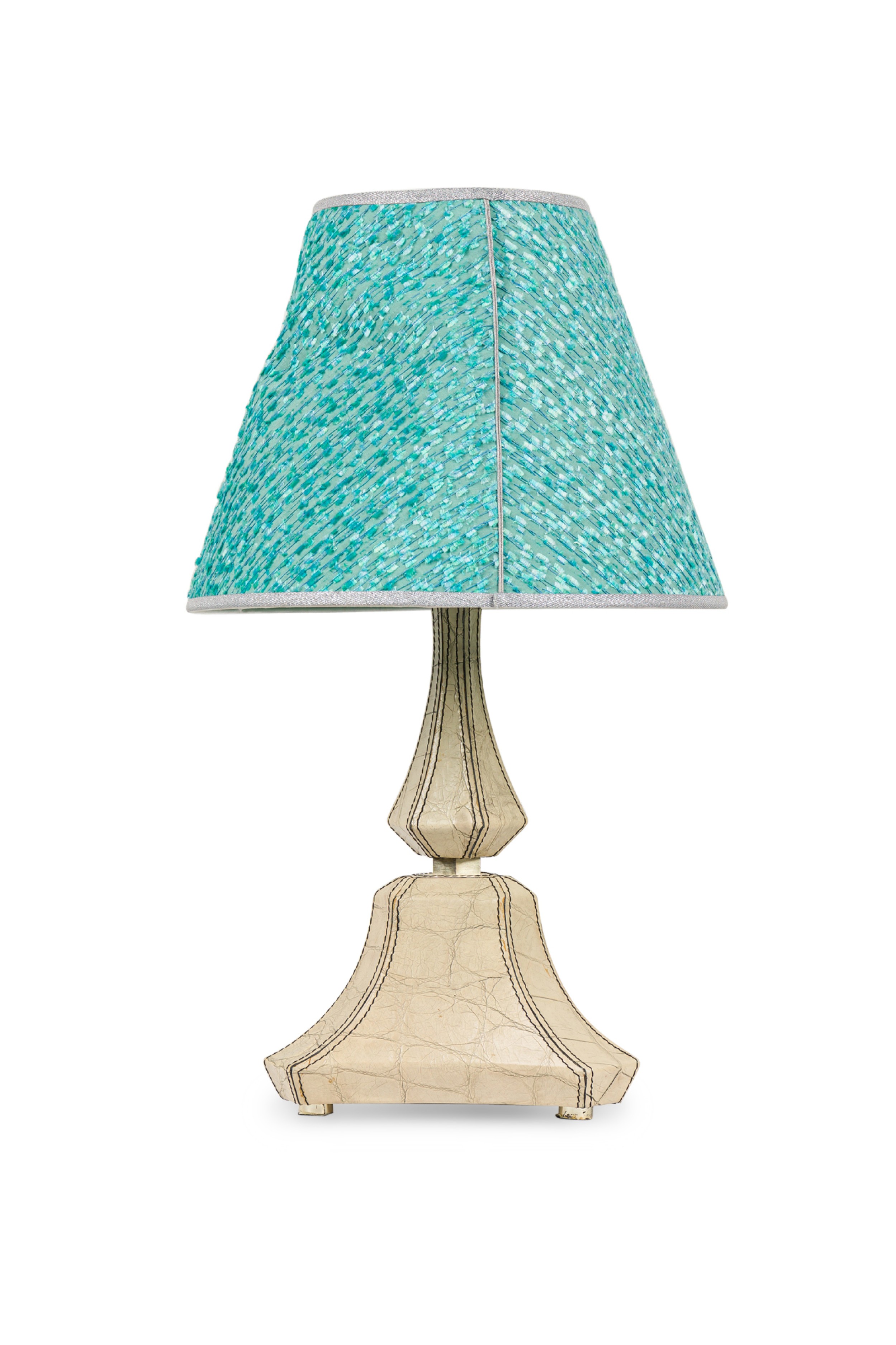 American Mid-Century table / vanity lamp with a tapered triangular shaped base over a narrow 6 sided tapered upper section all covered in embossed off-white faux reptile leather with round metal feet (with blue shade) (KARL SPRINGER) (Companion pieces: REG4872A, REG5081, REG4872)