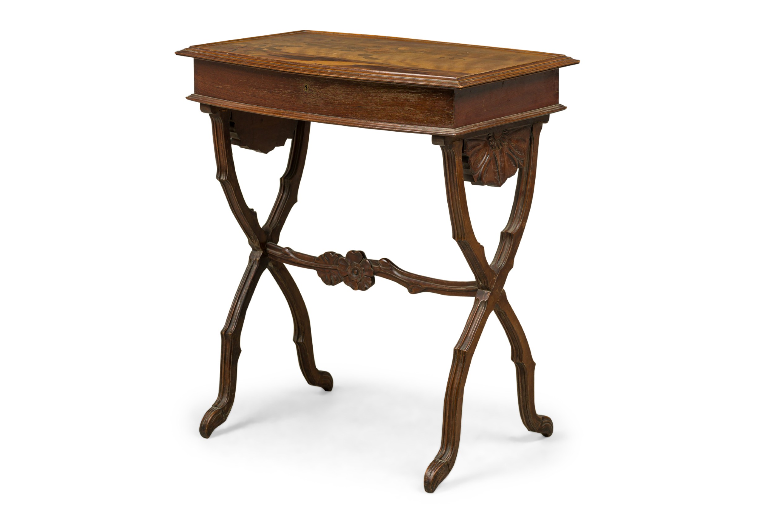 French Art Nouveau occasional / dressing table with an elaborate inlaid floral and pastoral design that lifts on two brass hinges to reveal an interior mirror and inlaid floral design above segmented compartments, and resting on a floral carved stretcher supporting 2 pair of crossed legs. (EMILE GALLE)