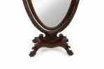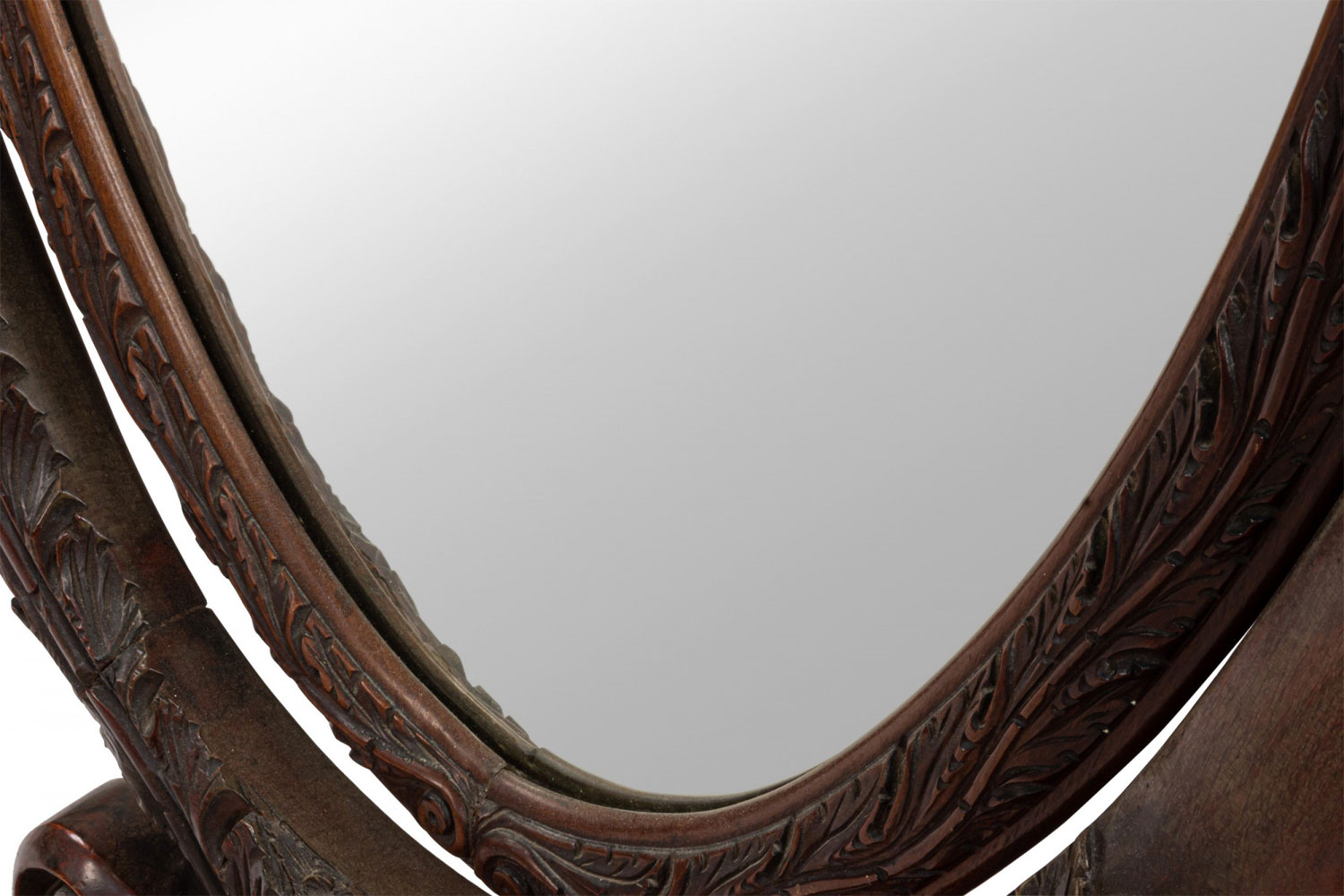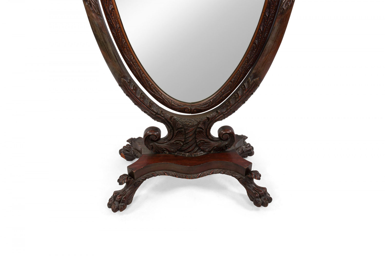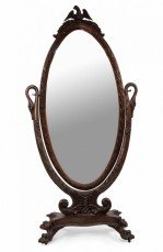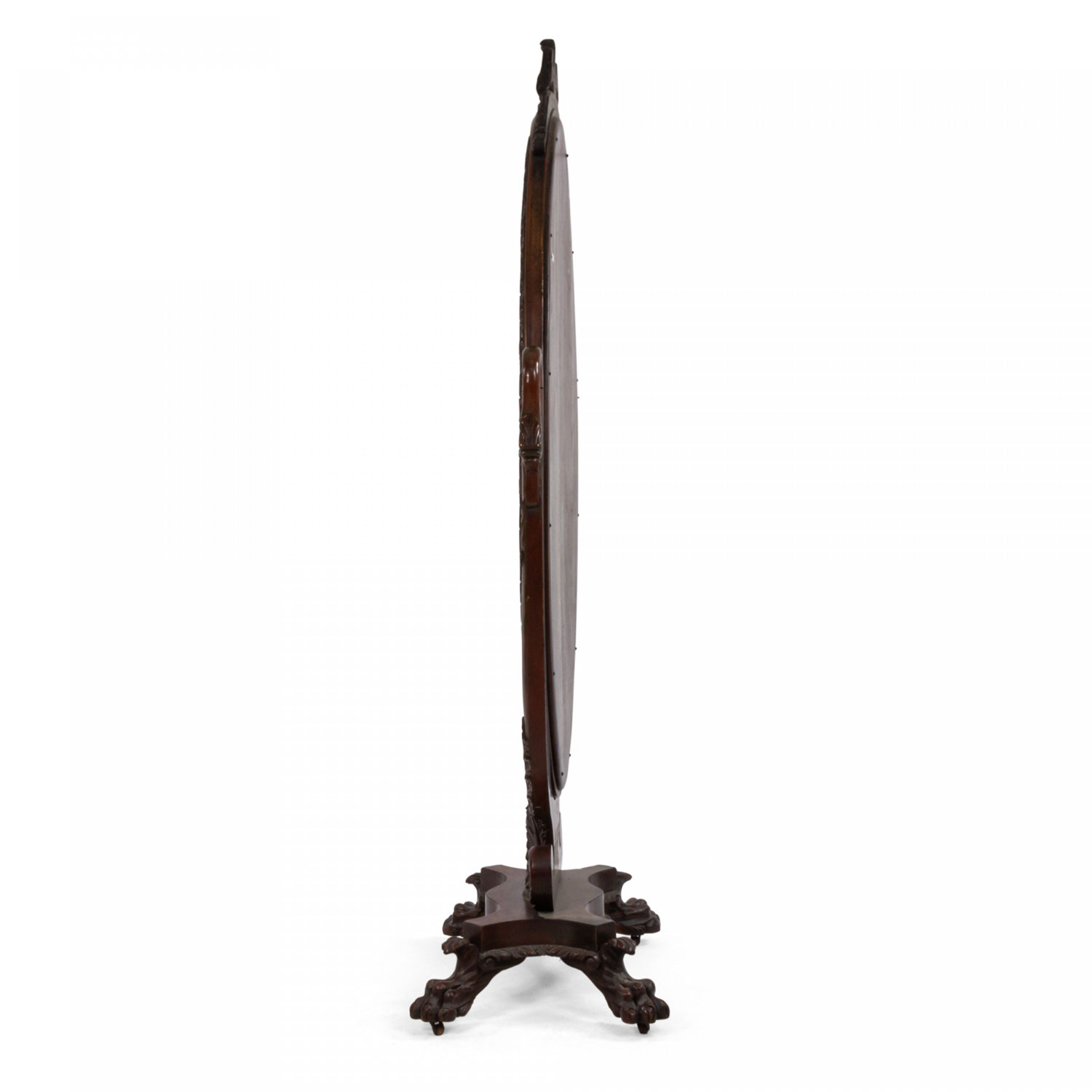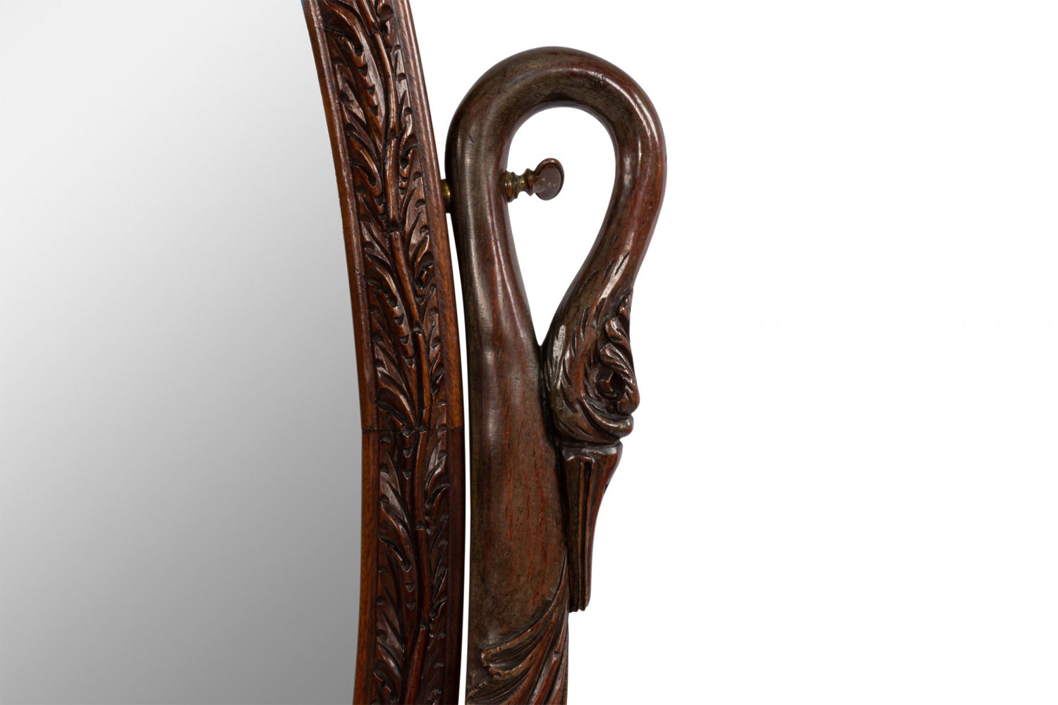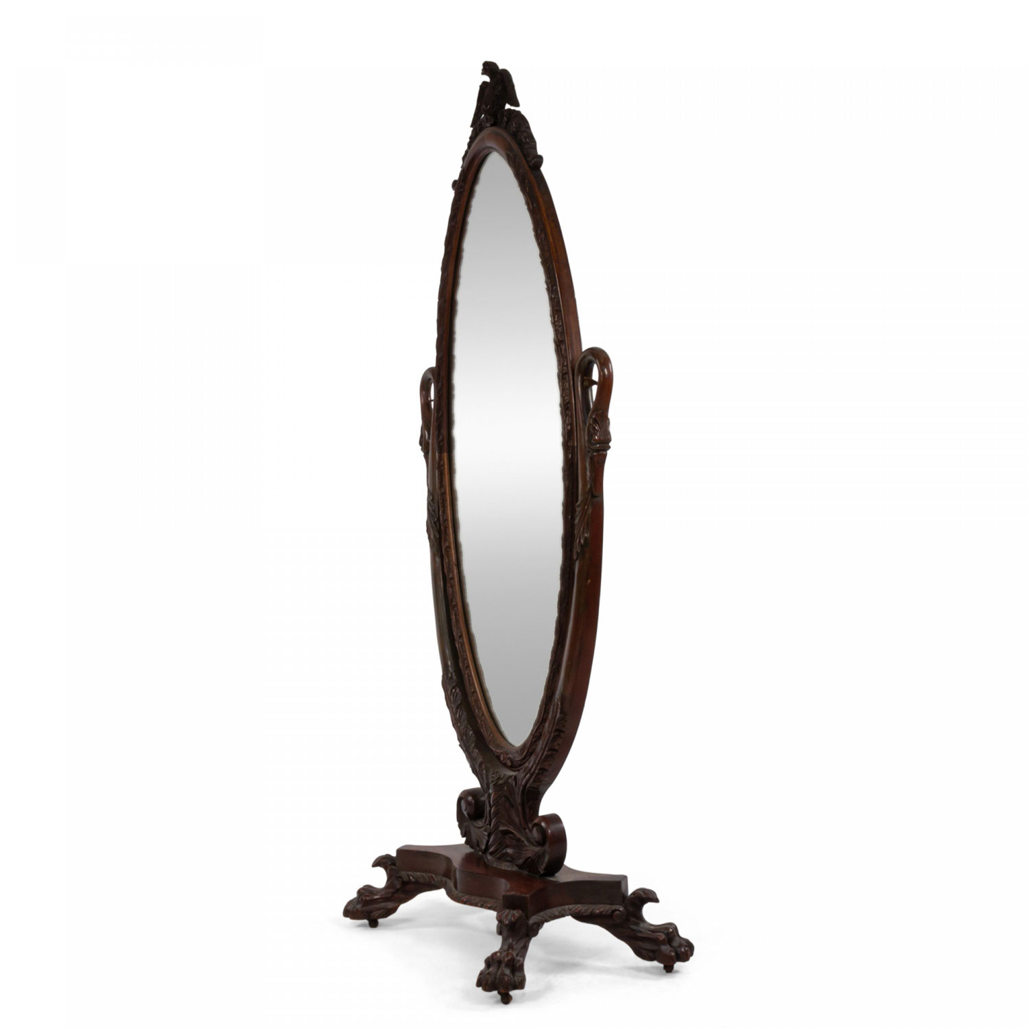 American Empire-style (first quarter 20th Century) mahogany cheval mirror flanked by carved swans on a scalloped base with paw feet and an eagle finial.