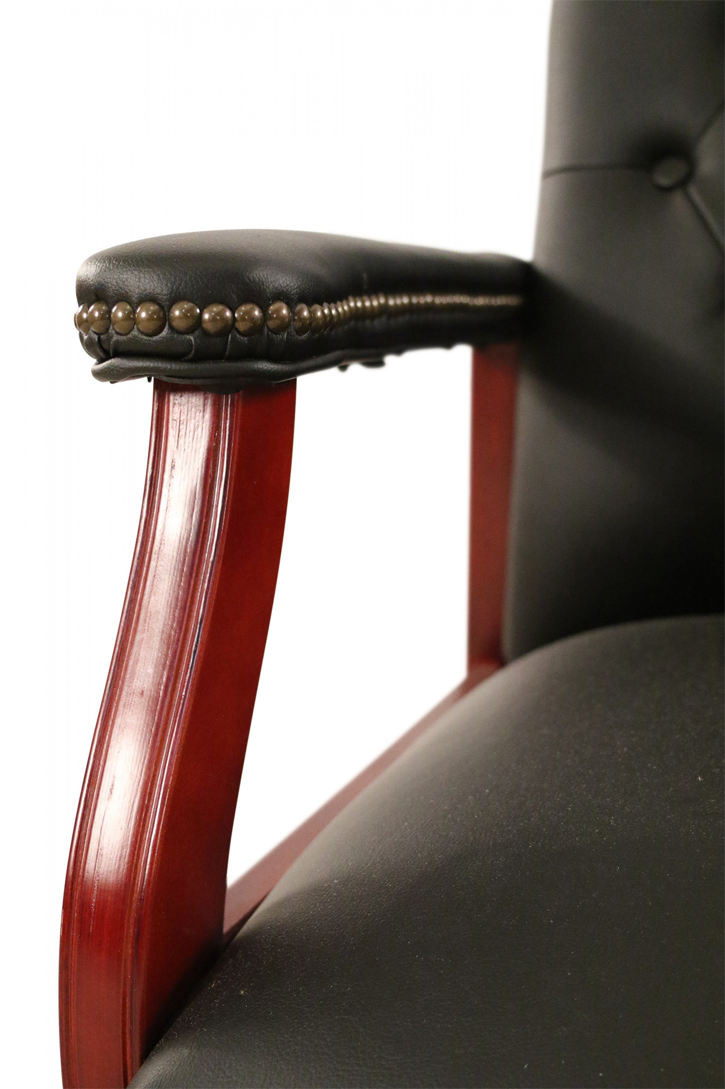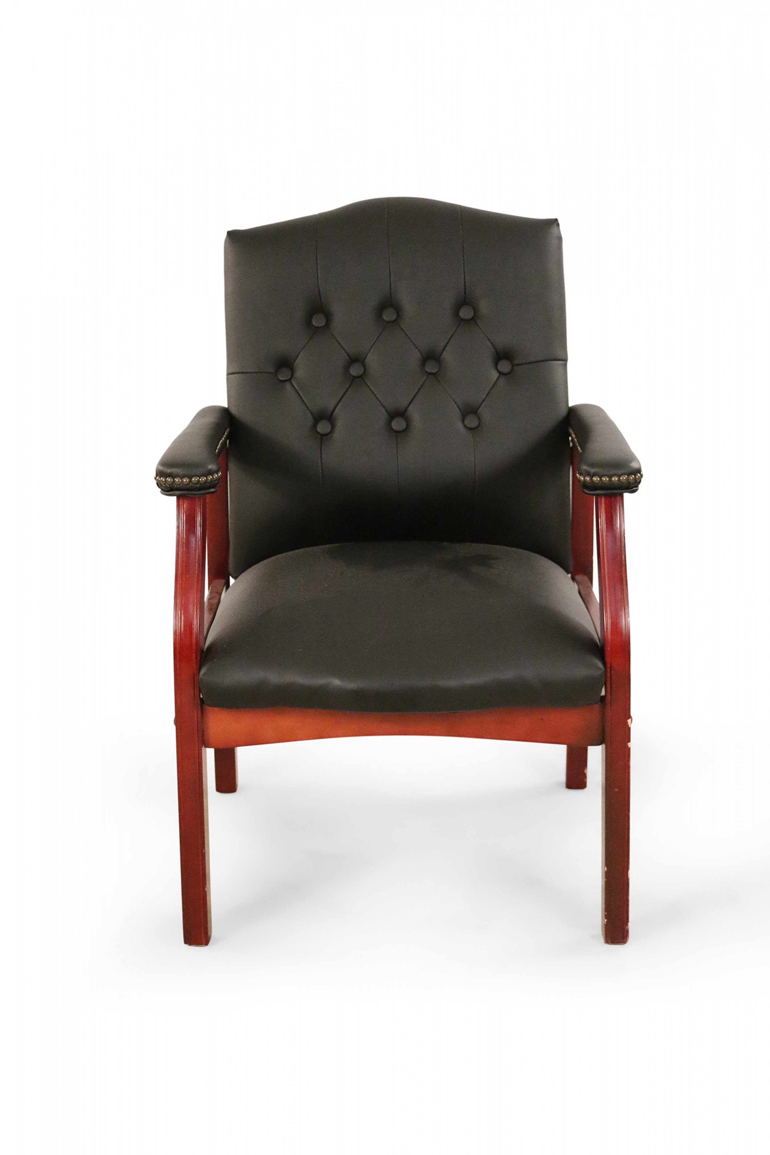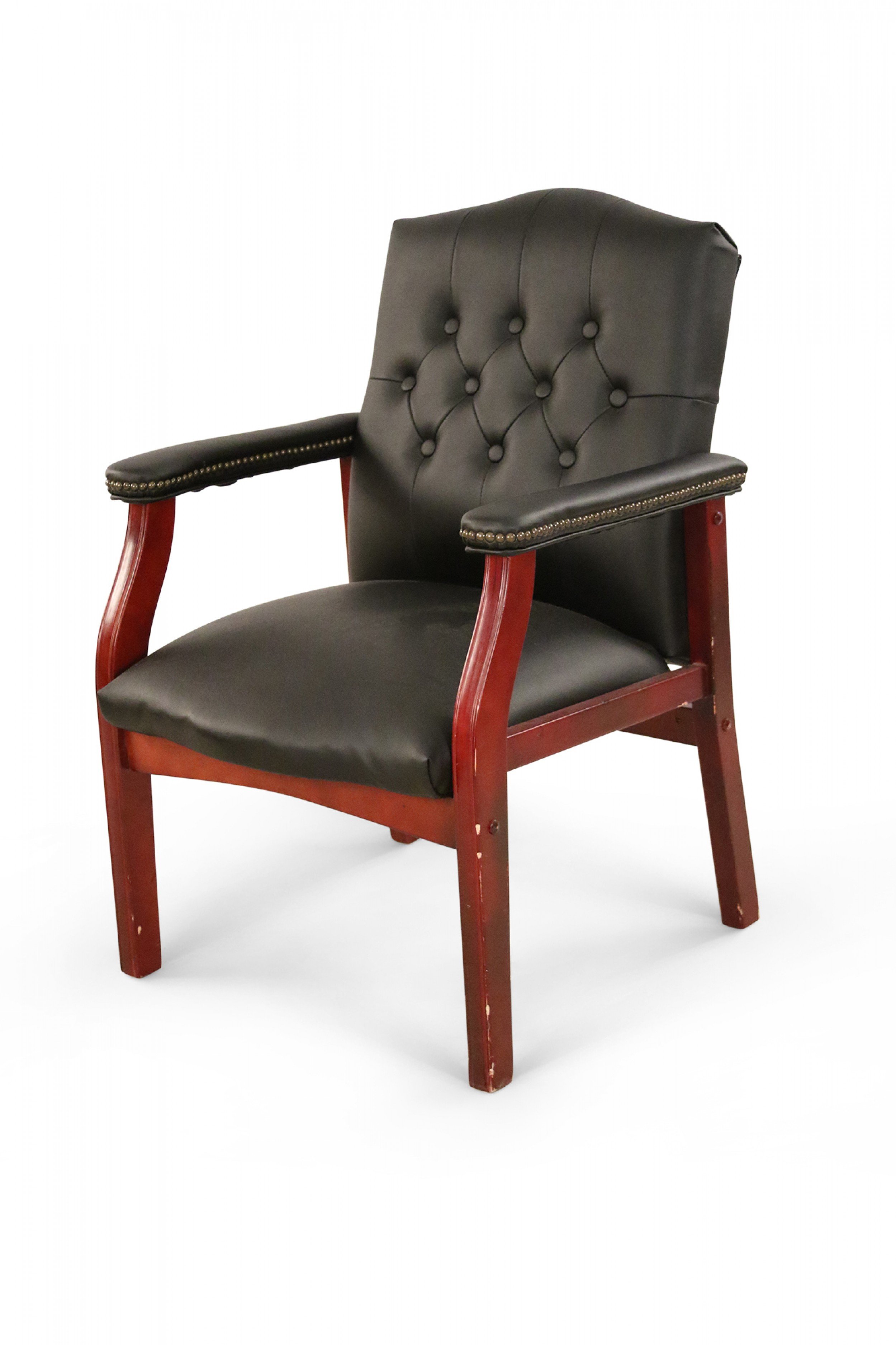 SET of 6 English Georgian-style (modern) black button-tufted leather armchairs with wooden frames and padded arm rests (PRICED AS SET).